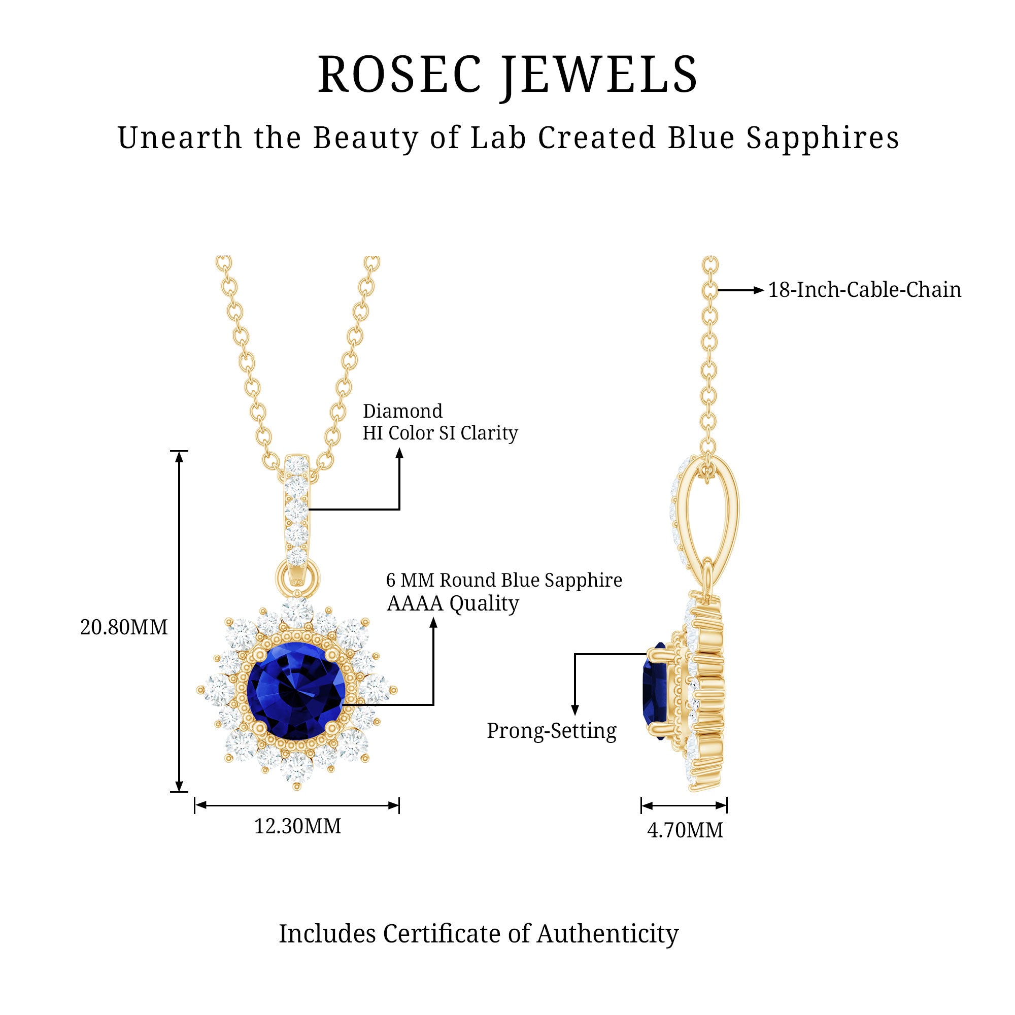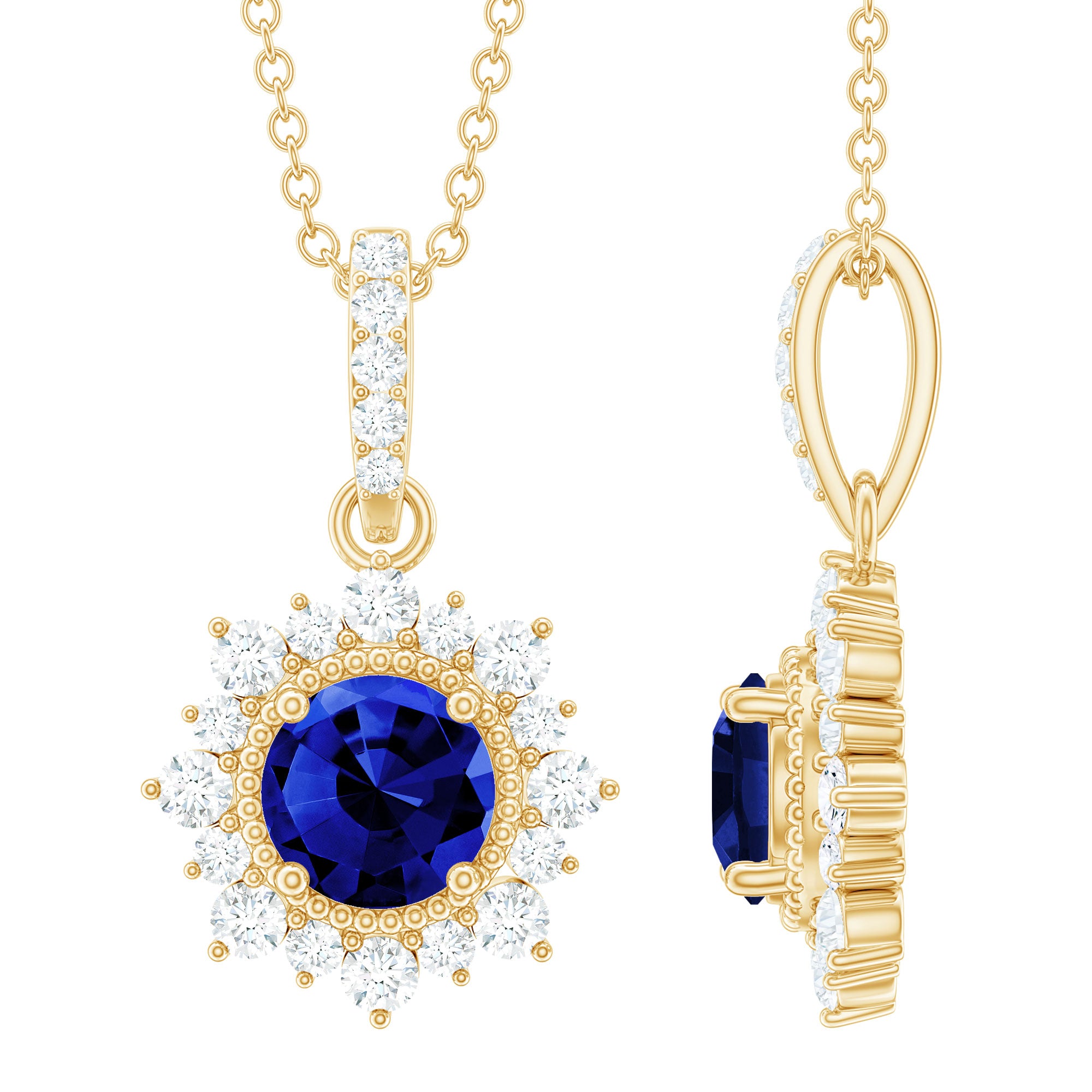 If youre searching for the perfect jewelry to wear on an evening date with your partner, look no further than this Created Blue Sapphire Pendant. Featuring a 6 MM Round Shape Created Blue Sapphire in a Prong Setting, with Gold Beaded Details and a Round Diamond Halo, this pendant necklace is simply stunning. The subtle yet elegant design will garner compliments when you wear it.