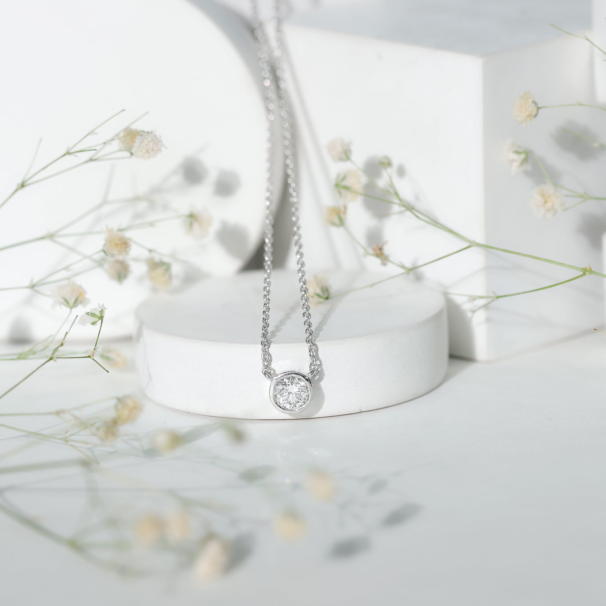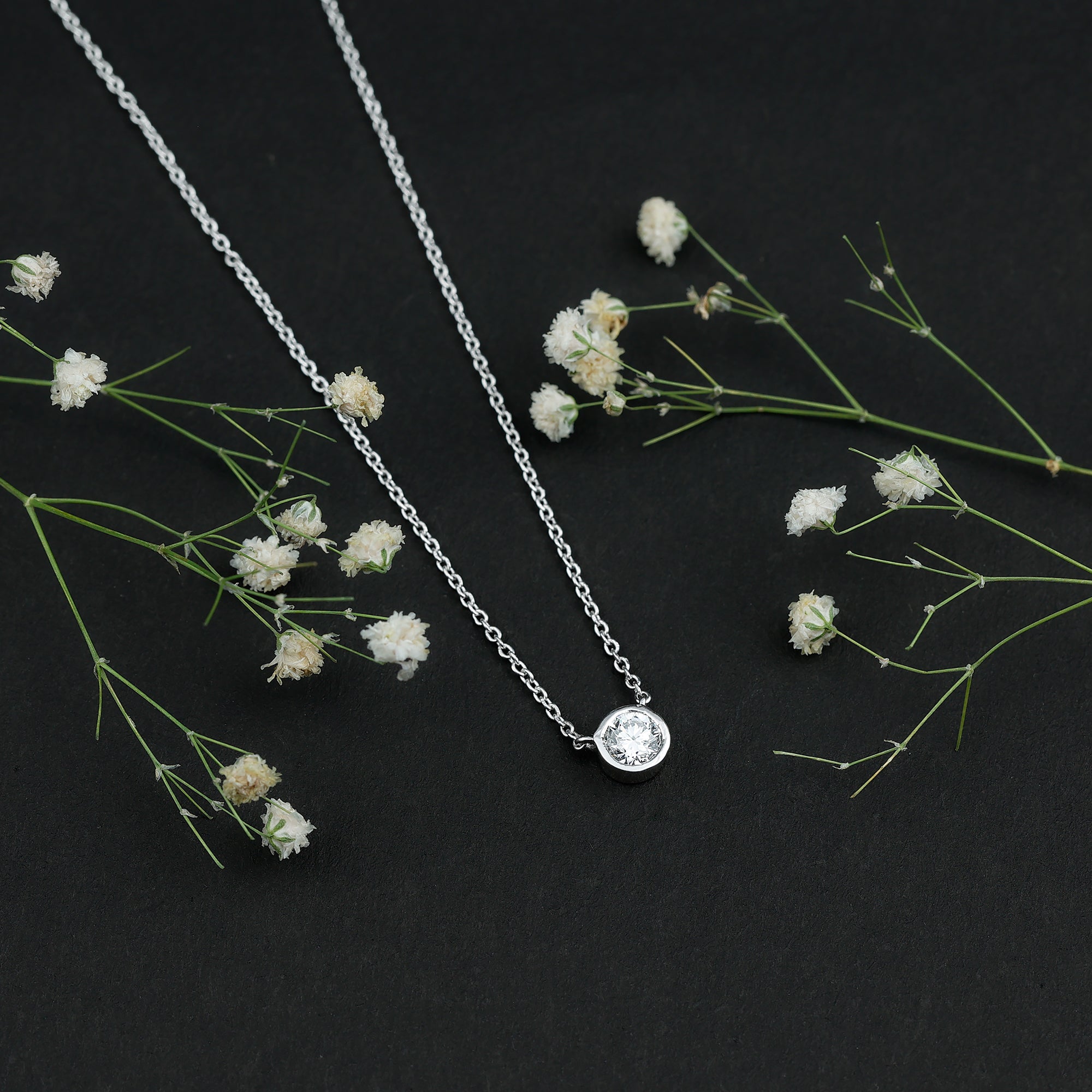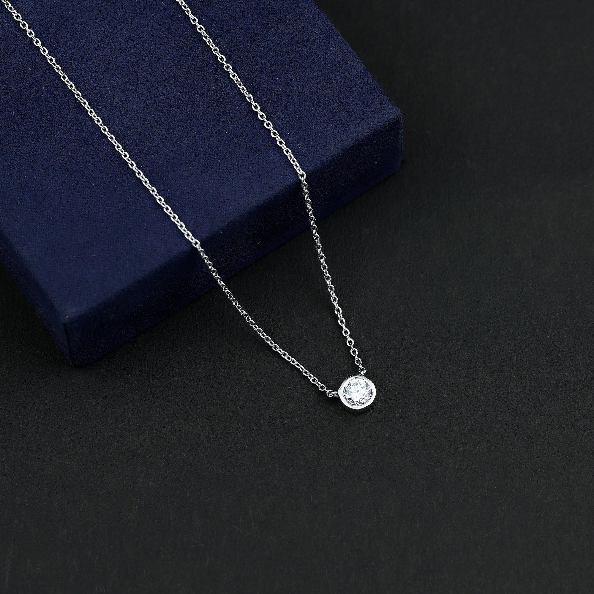 Make your neckline shine by wearing this Lab Grown Diamond Pendant, which is especially made to complete the look for your special day. The Solitaire Pendant Necklace is crafted with white gold plated silver and features a 5 MM Round Shape Cultured Diamond secured in Bezel Setting. This Classic Pendant hangs with a sturdy cable chain, which makes it beautifully sit on the neckline. The minimalist necklace can be adorned solely for a casual look or can be layered up with other layering necklace to create a mesmerizing stack. This minimal pendant is perfect for day-to-day shine with formal or casual looks. This Bezel Set Pendant can also be presented as a gift to your mom, wife, or sister as a token of affection.