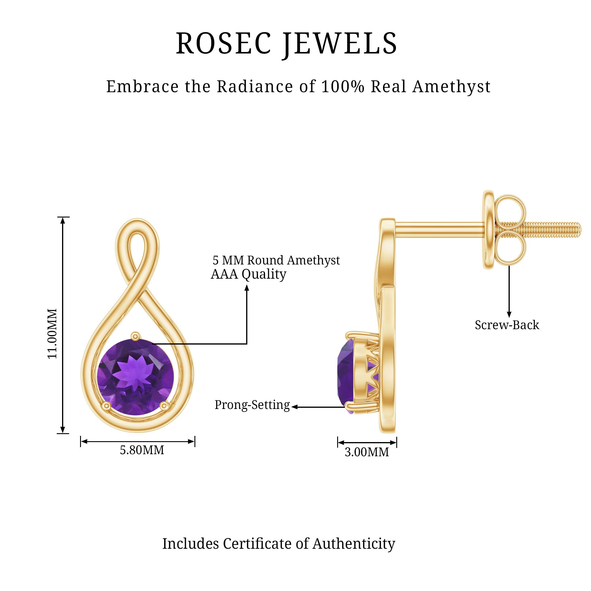 Capture hearts with the captivating allure of these Infinity Earrings, a symbol of endless elegance and everlasting love. Each earring features a 5 mm Round Shape Amethyst gracefully set in Prong Setting within an Infinity loop, representing the unbreakable bond between two souls. The rich purple hue of the gemstone radiates mystery, creativity and deep affection, perfect for the woman who carries both strength and grace in her heart. Designed with a secure Screw Back Closure, these Amethyst Stud Earrings promise both comfort and confidence, allowing you to shine effortlessly from day to night. Whether paired with an evening gown or your favorite everyday outfit, they add a touch of sophistication and romance to every look. Thoughtfully presented in a signature jewelry box, these February Birthstone Earrings make a heartfelt gift for birthdays, anniversaries or a surprise for someone special. Elegant, timeless and endlessly versatile, these Amethyst Studs tell your story of infinite love and beauty, one sparkling moment at a time.