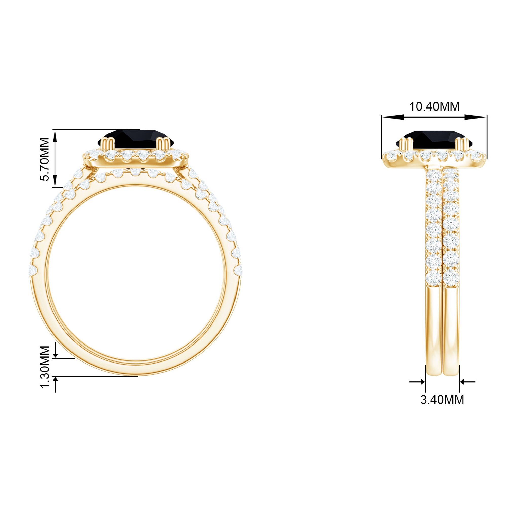 Celebrate your love with this stunning Black Onyx Bridal Set, thoughtfully designed to blend modern elegance with timeless charm. The centerpiece of the engagement ring is a bold 8 MM round cut black onyx, securely held in a double prong setting. Adding a touch of sparkle, a delicate halo of shimmering moissanite stones surrounds the deep black center stone and continues gracefully along the band, giving the ring a sophisticated yet striking look. Perfectly paired with the engagement ring is a matching stackable wedding band, featuring a row of round moissanite stones. This sleek band is designed to sit flush beside the engagement ring, creating a seamless and stylish Black and White Wedding Set. Whether worn together or separately, each ring stands beautifully on its own while also complementing the other. Made for everyday comfort and lasting elegance, this Halo Bridal Ring Set is available in a variety of sizes to ensure the perfect fit. Carefully crafted with attention to detail, the Engagement Ring with Wedding Band Set arrives in a lovely jewelry box, ready to be gifted for a proposal, wedding day, or special occasion. Both the AAA quality onyx and D-VS1 quality moissanite stones are hand selected for high quality, and the Round Bridal Set includes a certificate of authenticity for peace of mind.