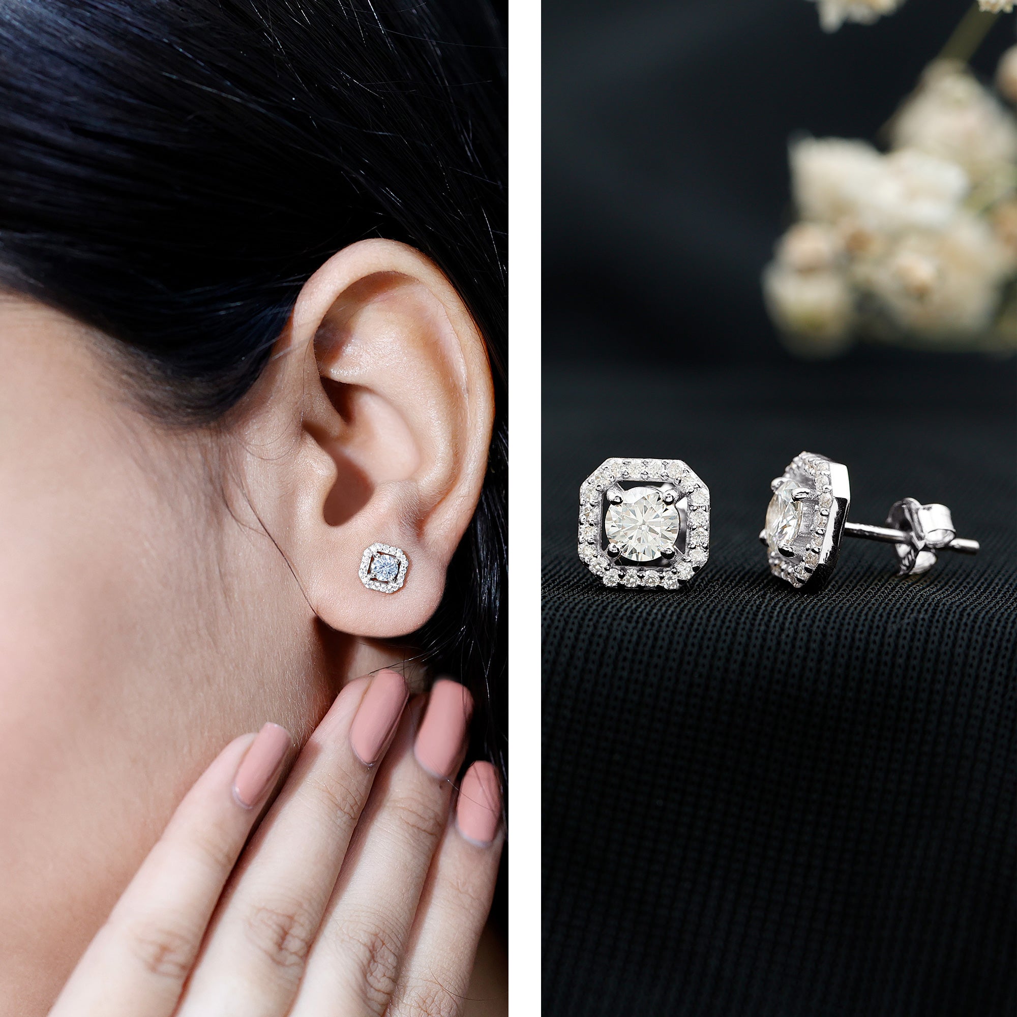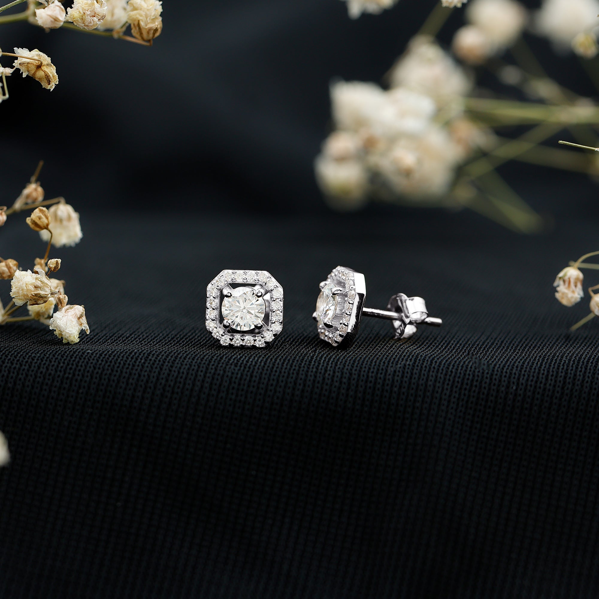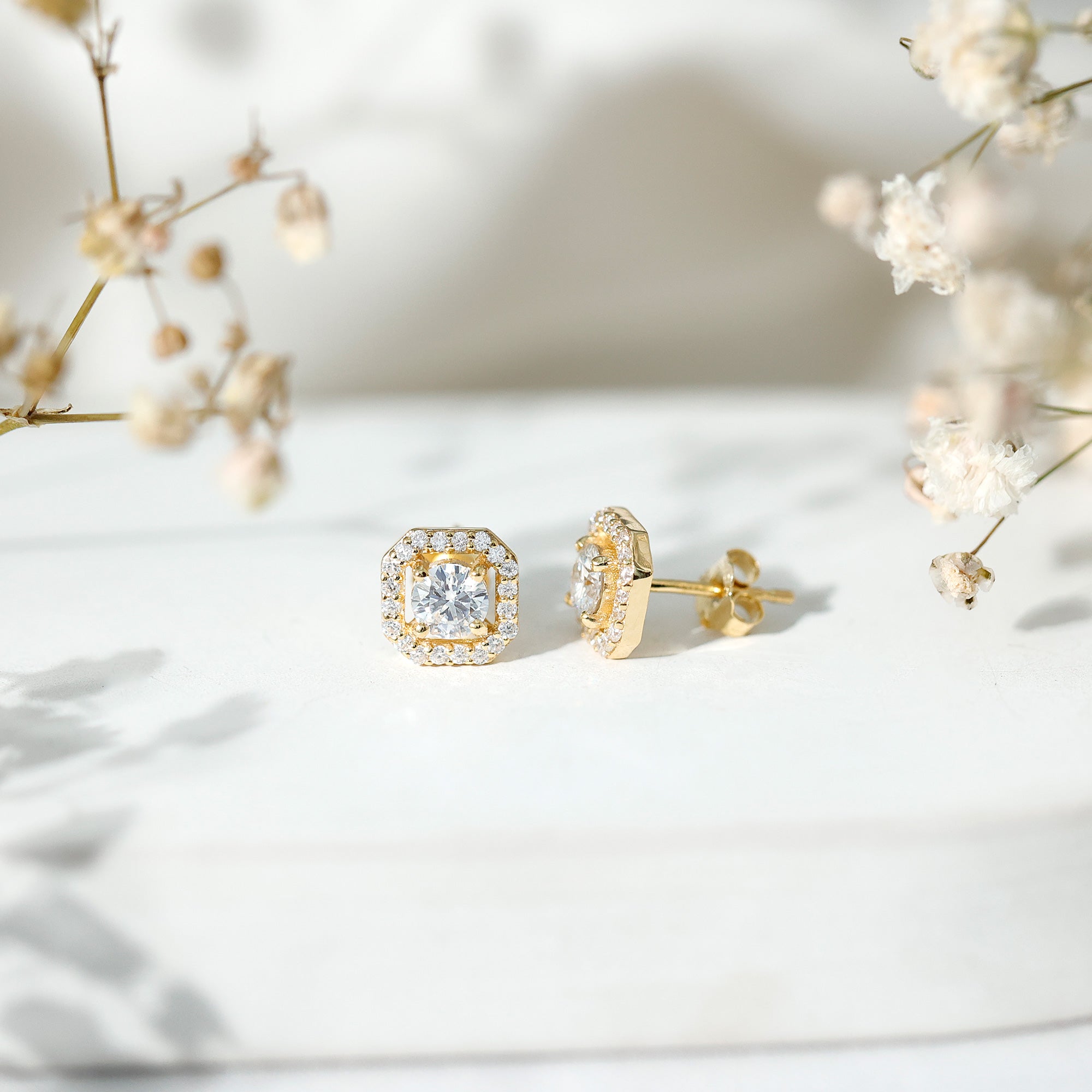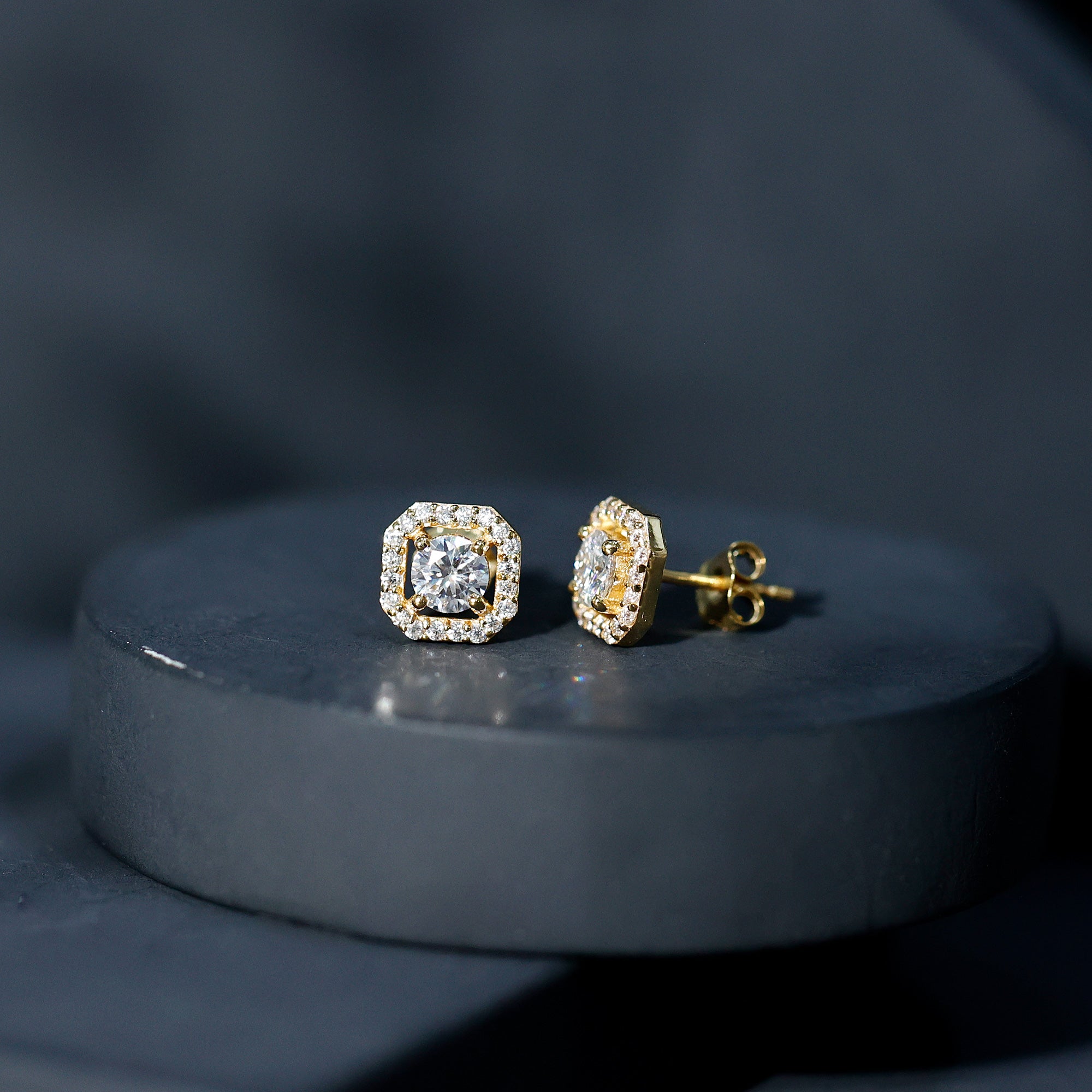 Round Cut Certified Moissanite Halo Stud Earrings in Gold
