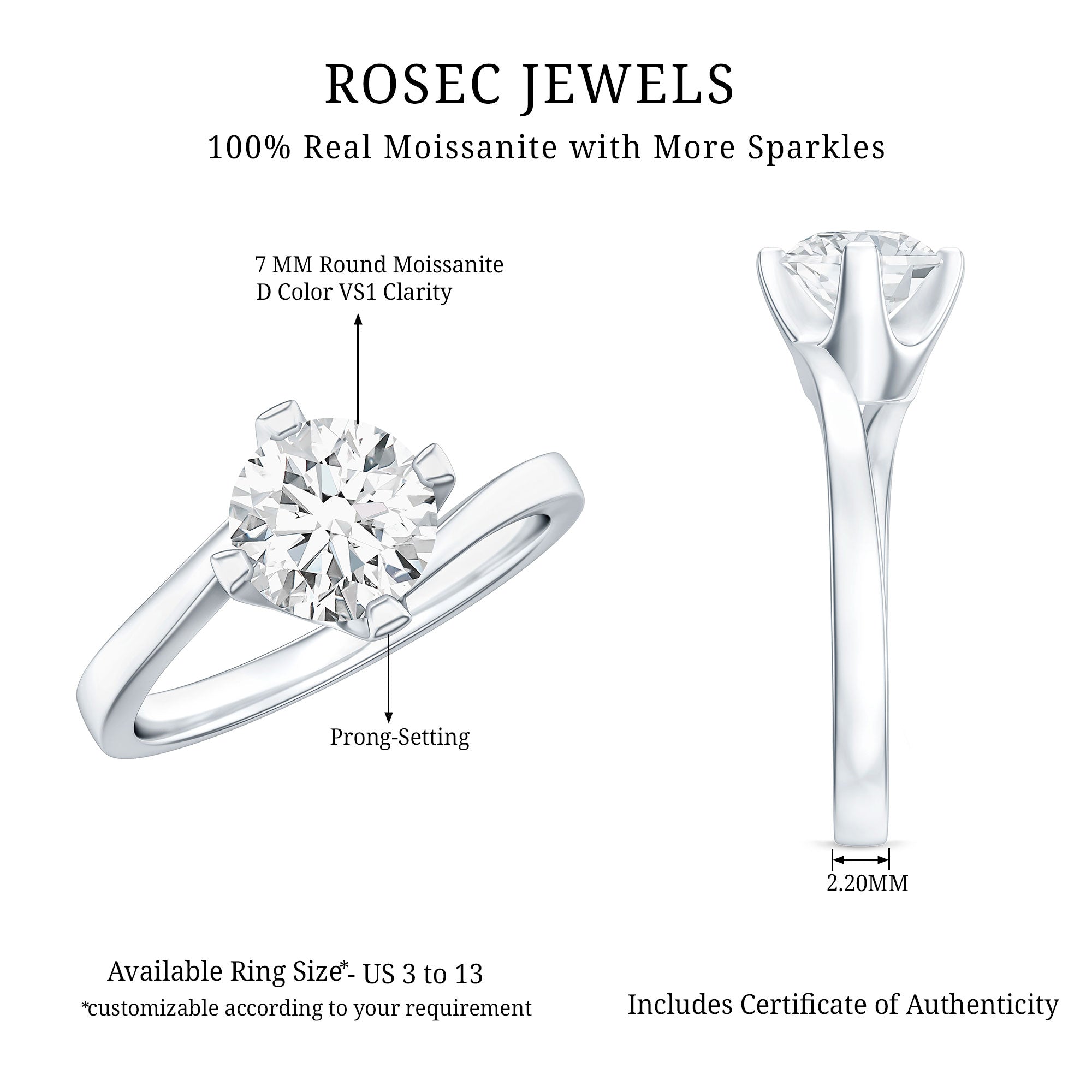 Exude effortless elegance with this moissanite solitaire ring, featuring a round cut moissanite set in a 4-prong diagonal setting. Crafted from solid gold, this moissanite solitaire bypass ring is a stylish piece of jewelry that is perfect for everyday wear.
