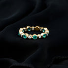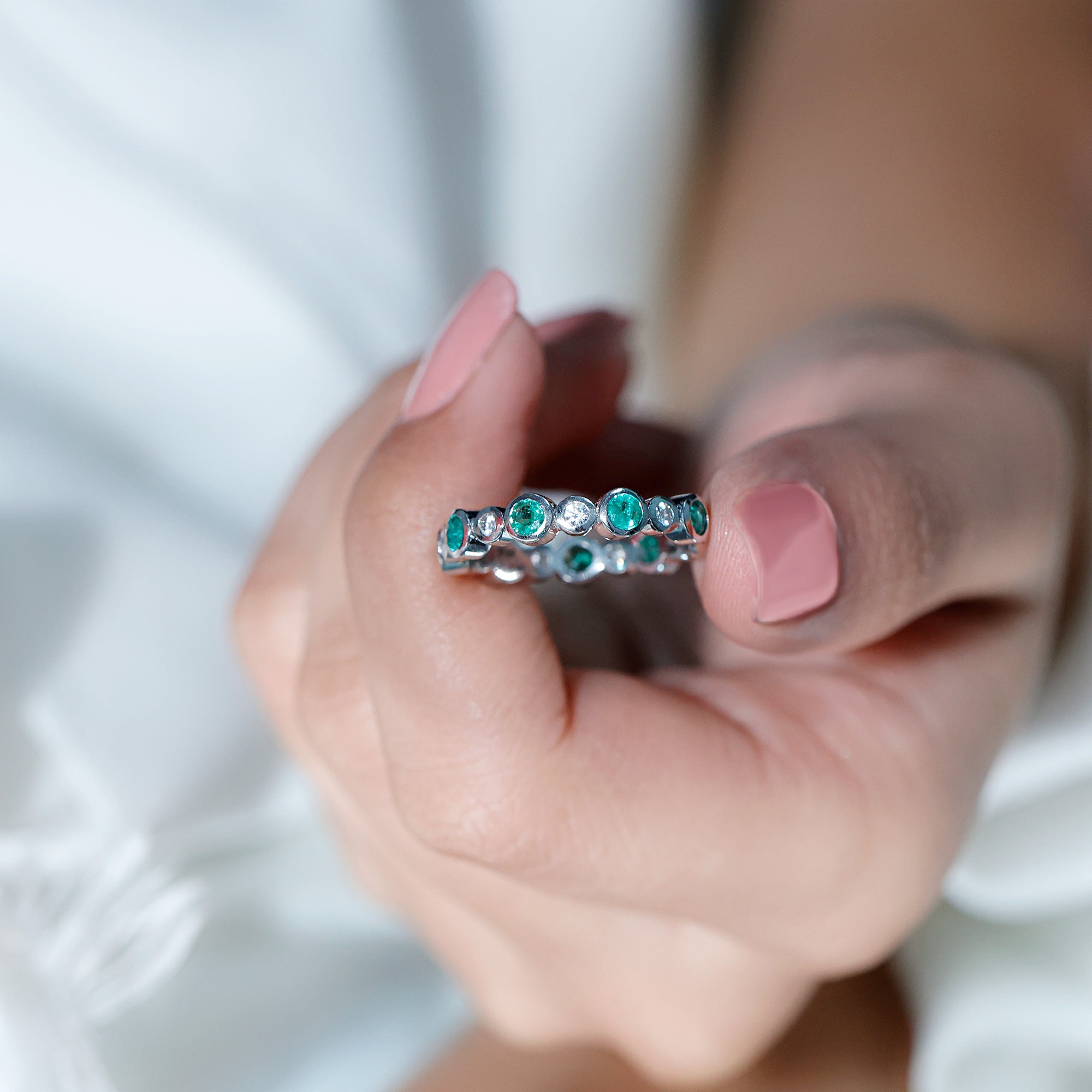 Every love story deserves a touch of brilliance, and this Emerald Eternity Ring is the perfect way to celebrate yours. Designed with elegance and meaning, this beautiful Full Eternity Ring features a continuous circle of round shaped AAA quality emeralds alternating with slightly smaller round cut D-VS1 quality moissanite stones. Each gem is set securely in bezel setting, creating a flawless flow of sparkle and color that symbolizes never-ending love and commitment. Together, they create a stunning contrast that feels both modern and timeless. The full eternity design makes it a beautiful reminder of lasting bonds and shared moments that never fade. Perfect as a emerald wedding band, anniversary ring, or a meaningful gift, this Emerald and Moissanite Band adds a sophisticated charm to any look. It can be worn alone for a simple statement or stacked with your engagement or wedding rings for extra sparkle and style.