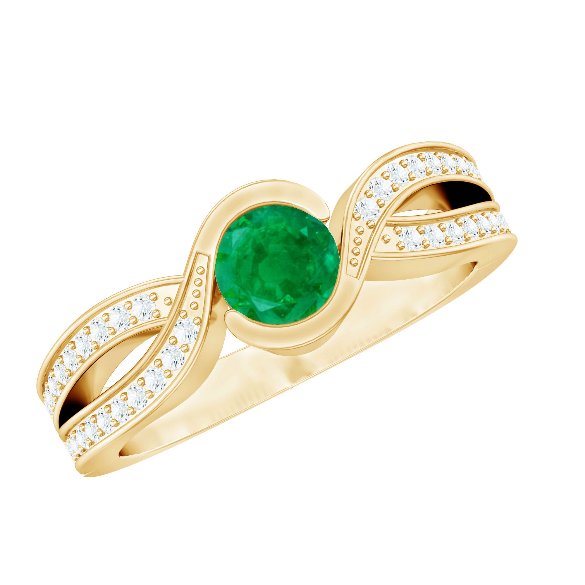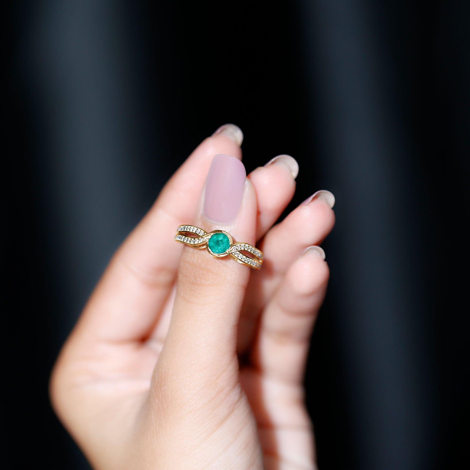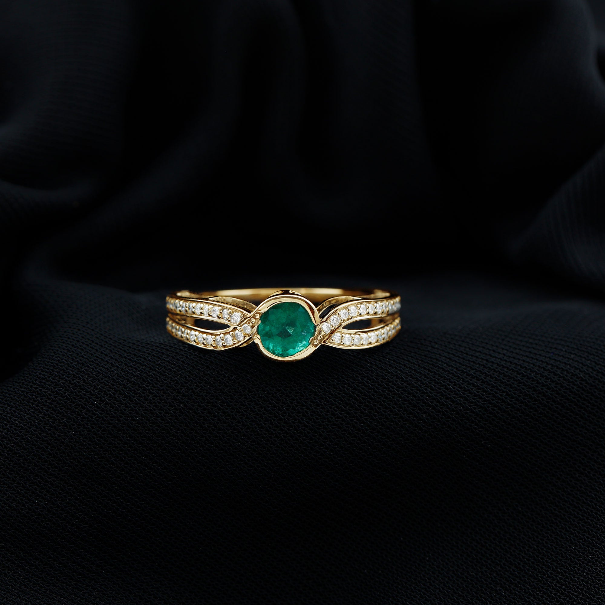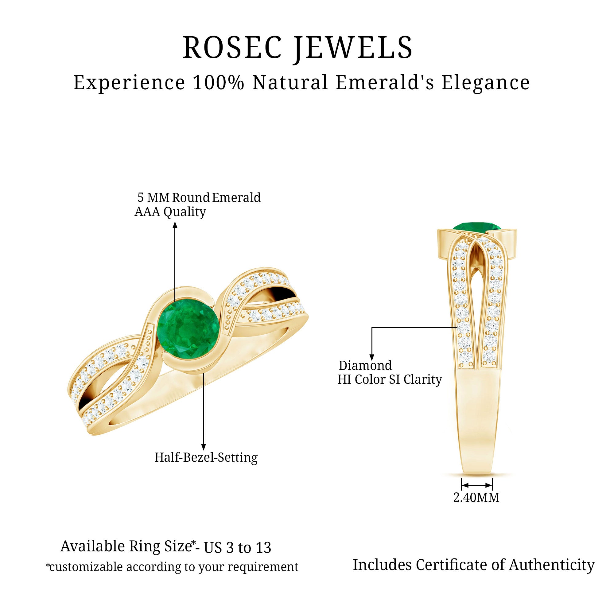 Add a splash of color and elegance to your special occasion with this gorgeous Emerald and Diamond Engagement Ring that perfectly blends passion and style. At the center of the Designer Ring is a stunning 5 MM round cut emerald, securely set in half bezel setting. To enhance its allure, the bypass-inspired band is adorned with sparkling diamonds that twinkle with every move. The delicate diamond accents beautifully emphasize the emerald color, striking a lovely balance between luxury and simplicity. This Unique Engagement Ring is carefully designed to showcase the best of both stones, the fiery green of the AAA quality emerald and the cool sparkle of the HI-SI quality diamonds. Made for comfort as well as beauty, the smooth curves of the band ensure it is easy to wear daily while still feeling elegant and special. Perfect for those who appreciate vibrant jewelry with significance, the Emerald Engagement Ring radiates personality and charm. Beautifully packaged and ready for gifting, this Bypass Ring serves as a timeless reminder of love, warmth, and the moments that truly count.