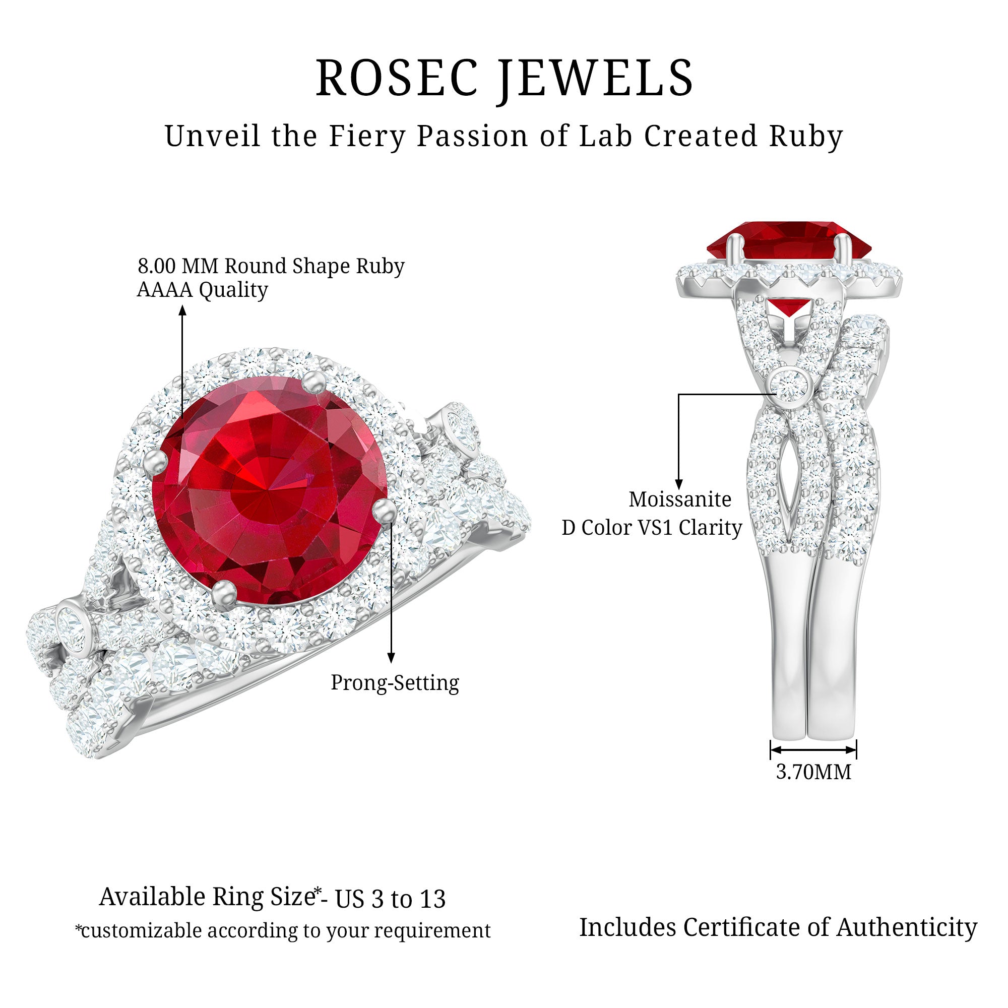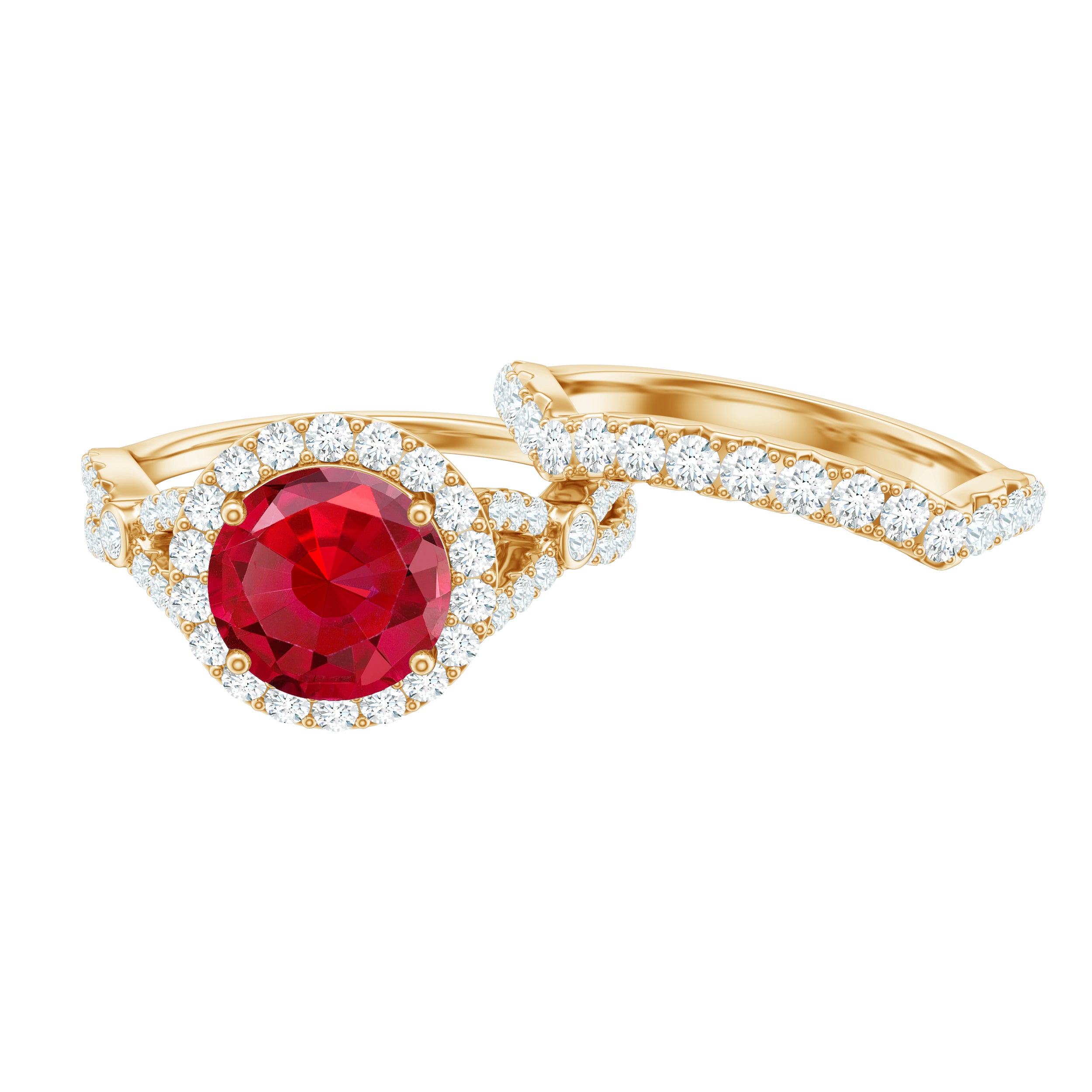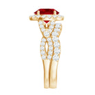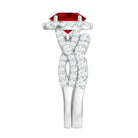 The Lab Created Ruby Wedding Ring Set is a stunning two piece wedding ring set that beautifully combines elegance, comfort, and significance. It is crafted for couples seeking a unique symbol of their everlasting love story. The engagement ring features a breathtaking 8 MM round cut lab created ruby, securely held in prong setting. Surrounding it is a radiant halo of tiny moissanite stones that sparkle enchantingly whenever they catch the light. The crossover band is adorned with small moissanite stones that provide an additional touch of brilliance. Every angle of this ring draws attention in the most elegant manner. What adds to the charm of the Halo Bridal Set is the accompanying moissanite enhancer ring, designed to seamlessly wrap around the engagement ring, creating a cohesive appearance. Together, these rings create a perfect match that feels complete and harmonious. The crossover band design and snug fit of the enhancer give the entire Criss Cross Engagement Ring Set a luxurious yet romantic appeal. Crafted with AAAA quality lab grown ruby and D-VS1 quality moissanites, the craftsmanship is exceptional. Available in various sizes, these rings are comfortable enough for daily wear while still making you feel extraordinary.