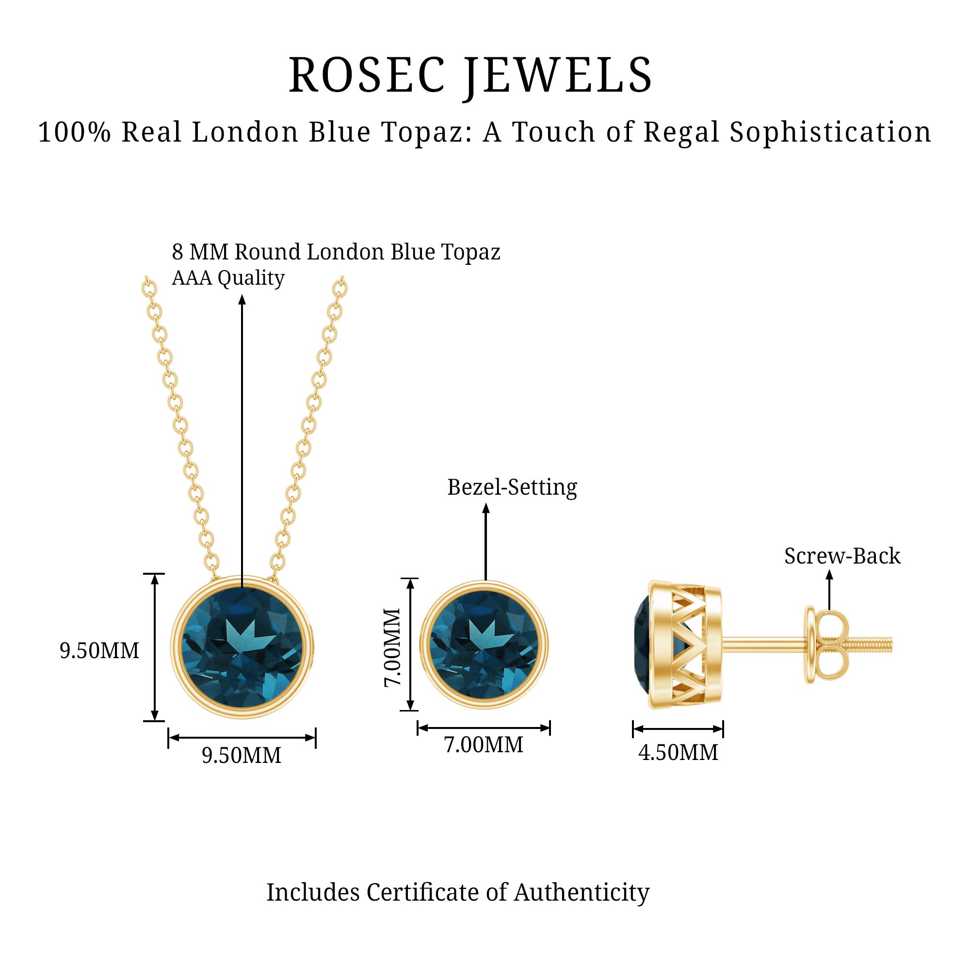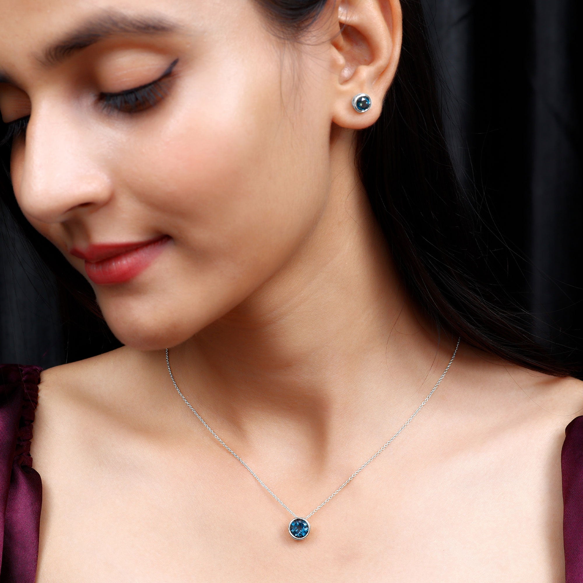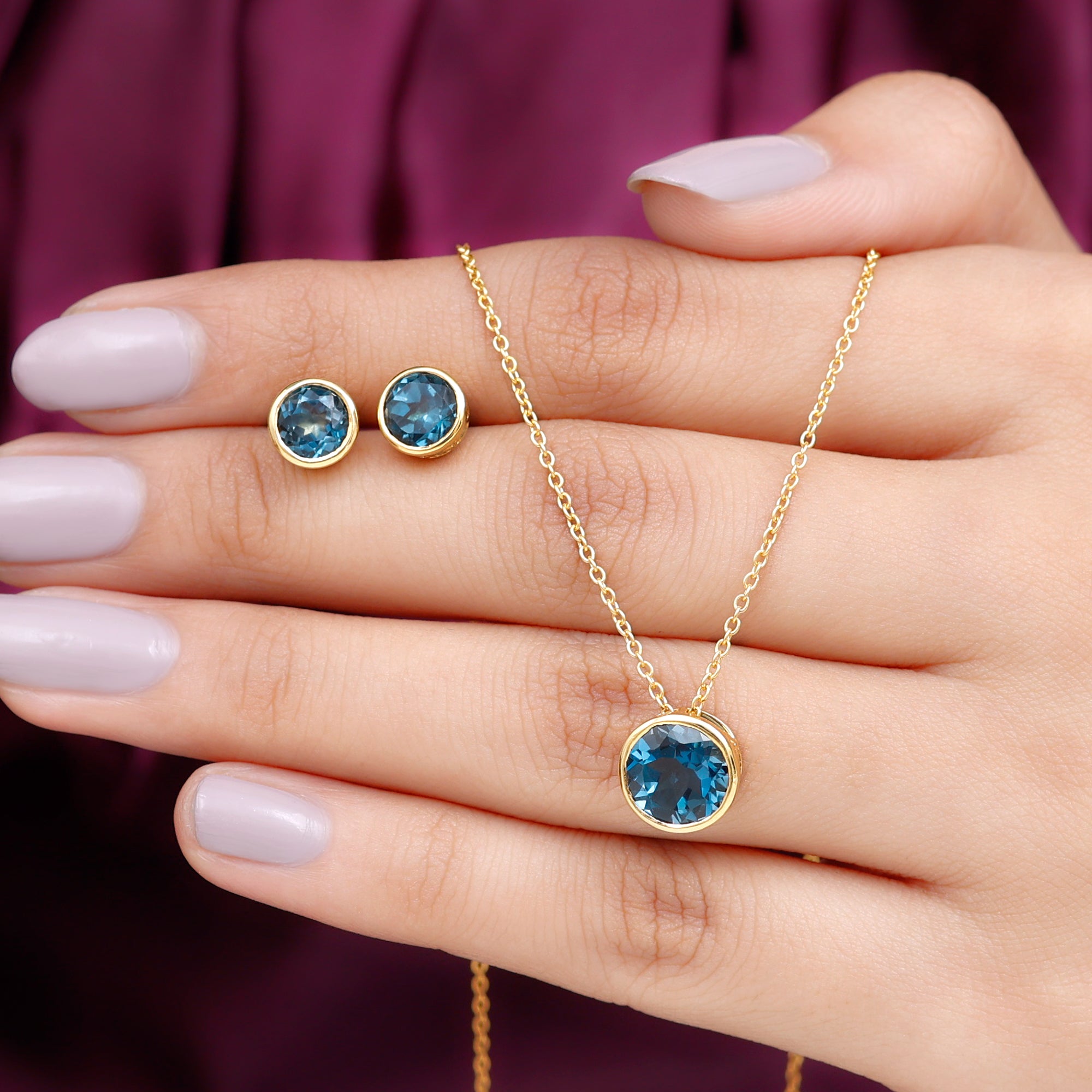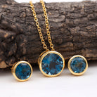 This Solitaire Jewelry Set is an exquisite gift for your wife, girlfriend, or mother. Comprising of a stunning Necklace and small Stud Earrings, both adorned with Round Shape London Blue Topaz Gemstones elegantly set in bezel settings. Crafted from Solid Gold Metal, this Bridal Jewelry Set exudes timeless beauty and sophistication.