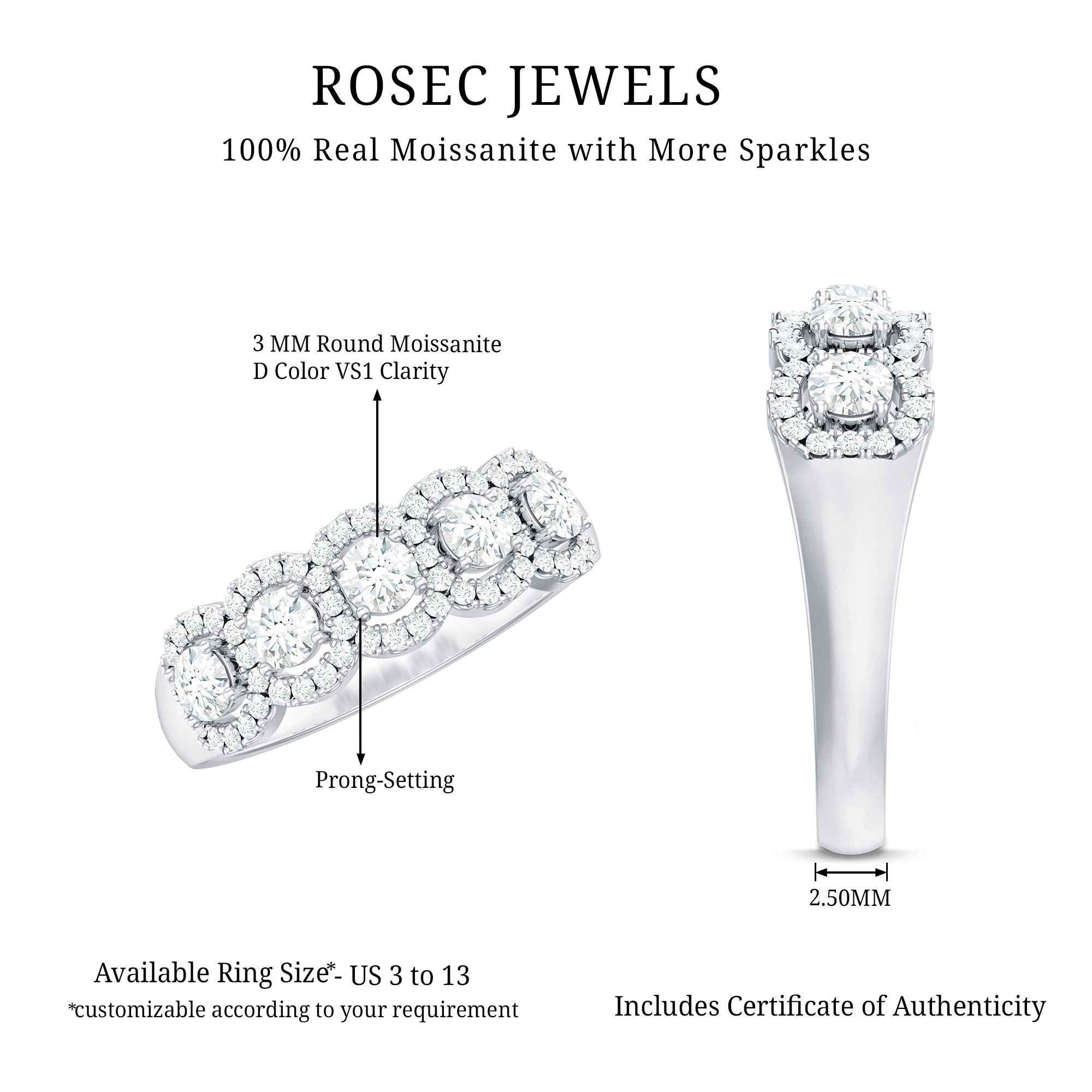 The Round Cut Moissanite 5 Stone Anniversary Ring with Halo is designed to represent lasting moments and shared milestones. The five-stone arrangement symbolizes continuity and balance, making it a thoughtful choice for marking anniversaries or meaningful occasions.