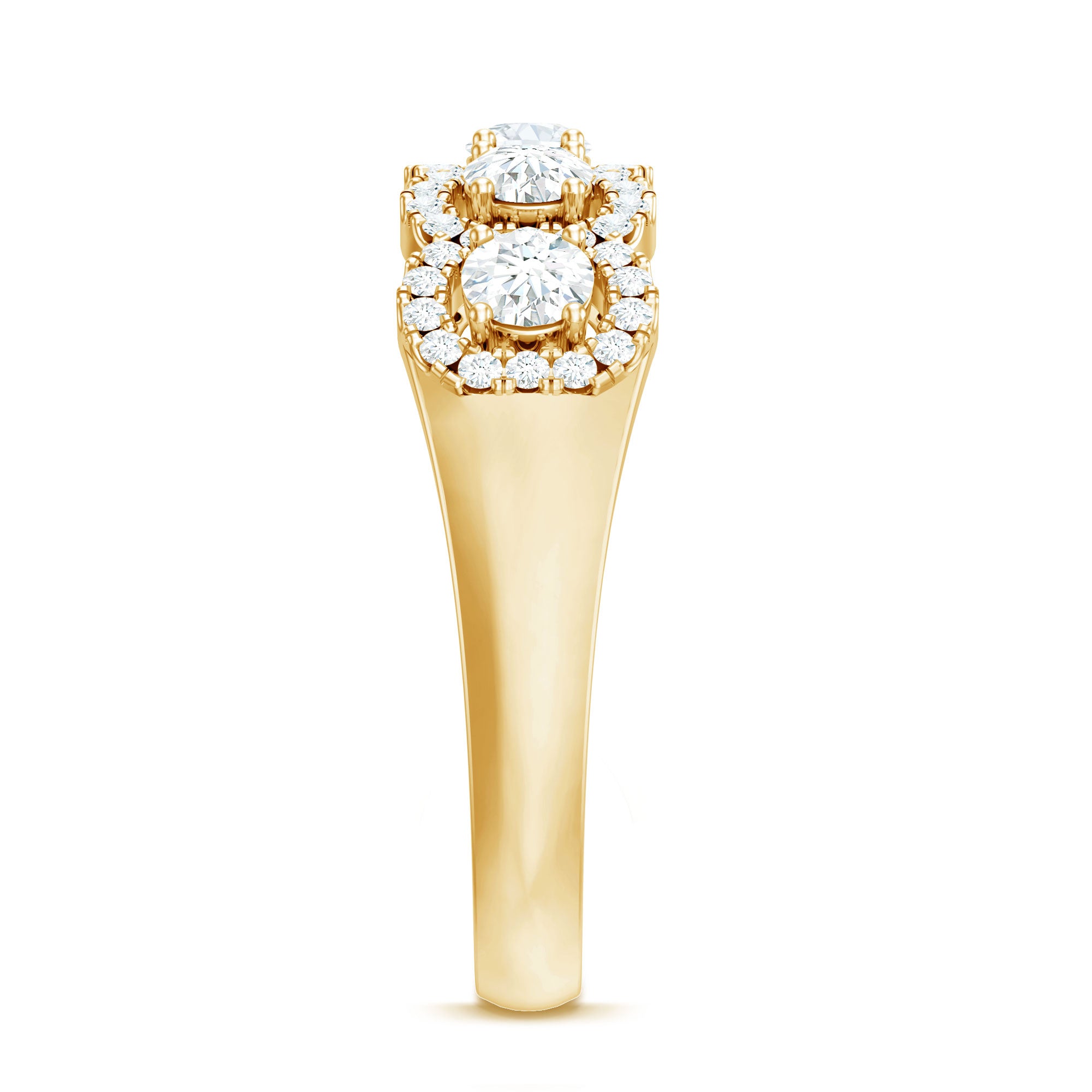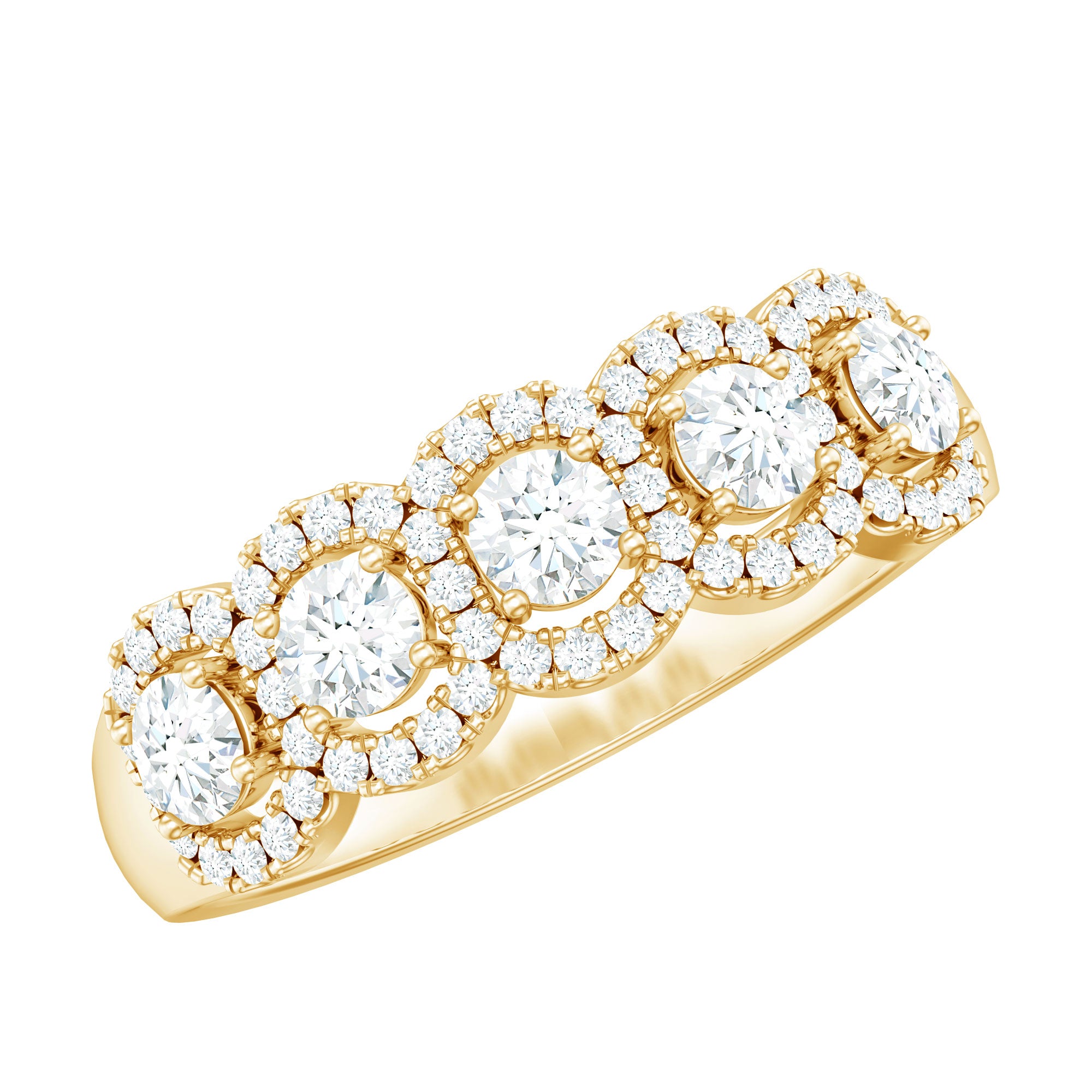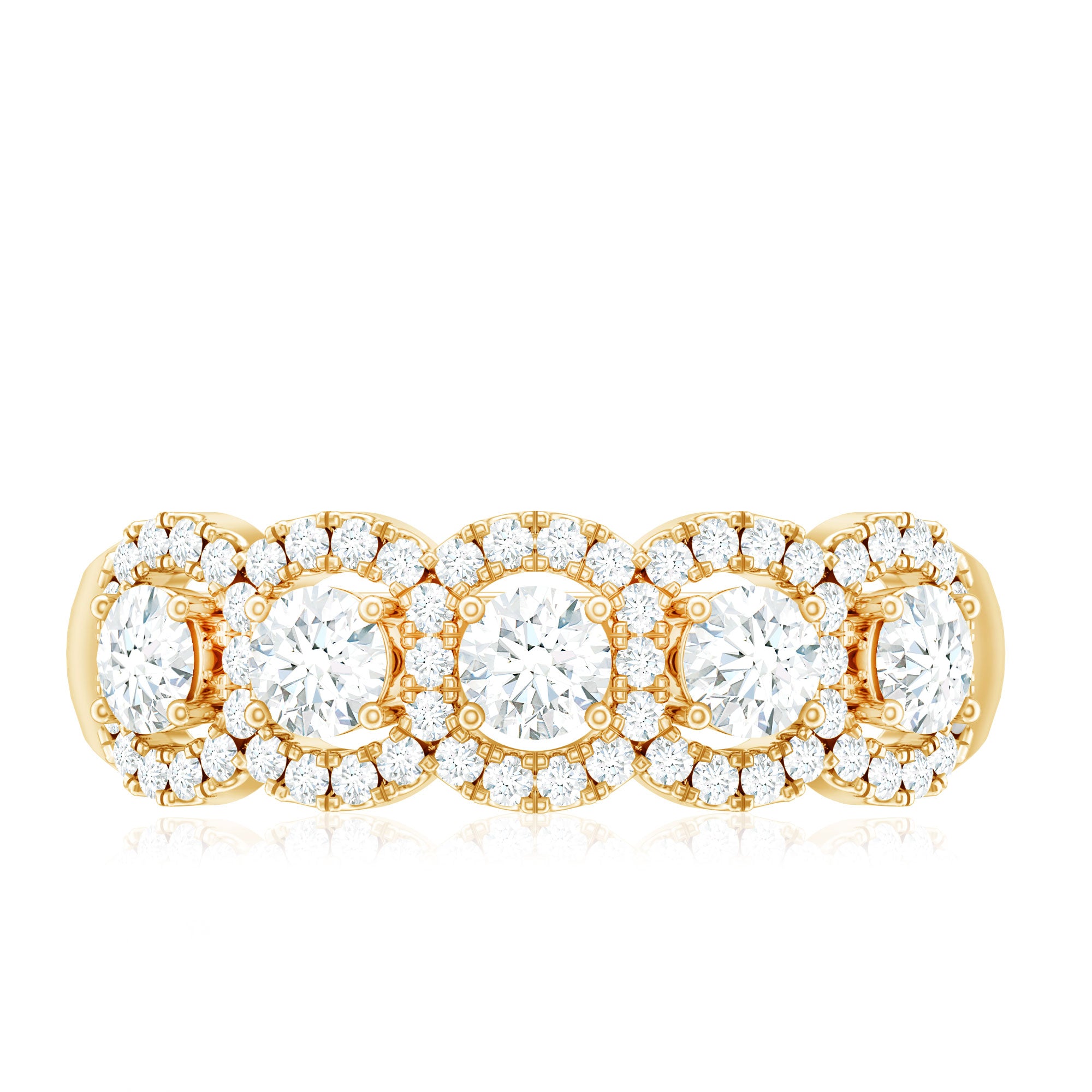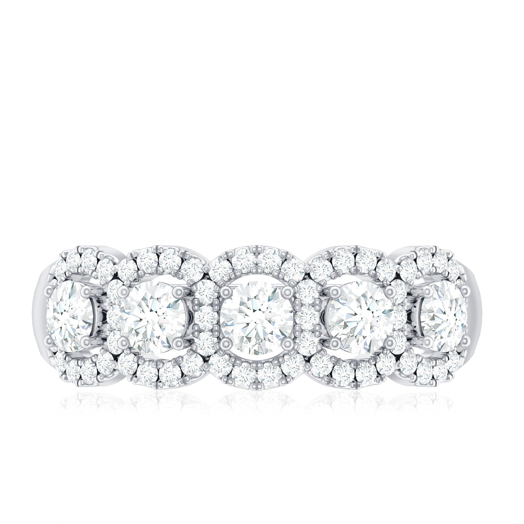 The five-stone layout creates a symmetrical flow across the band, ensuring even distribution of light and visual presence. Each center stone is enhanced by a halo setting, adding depth and amplifying overall brilliance.