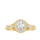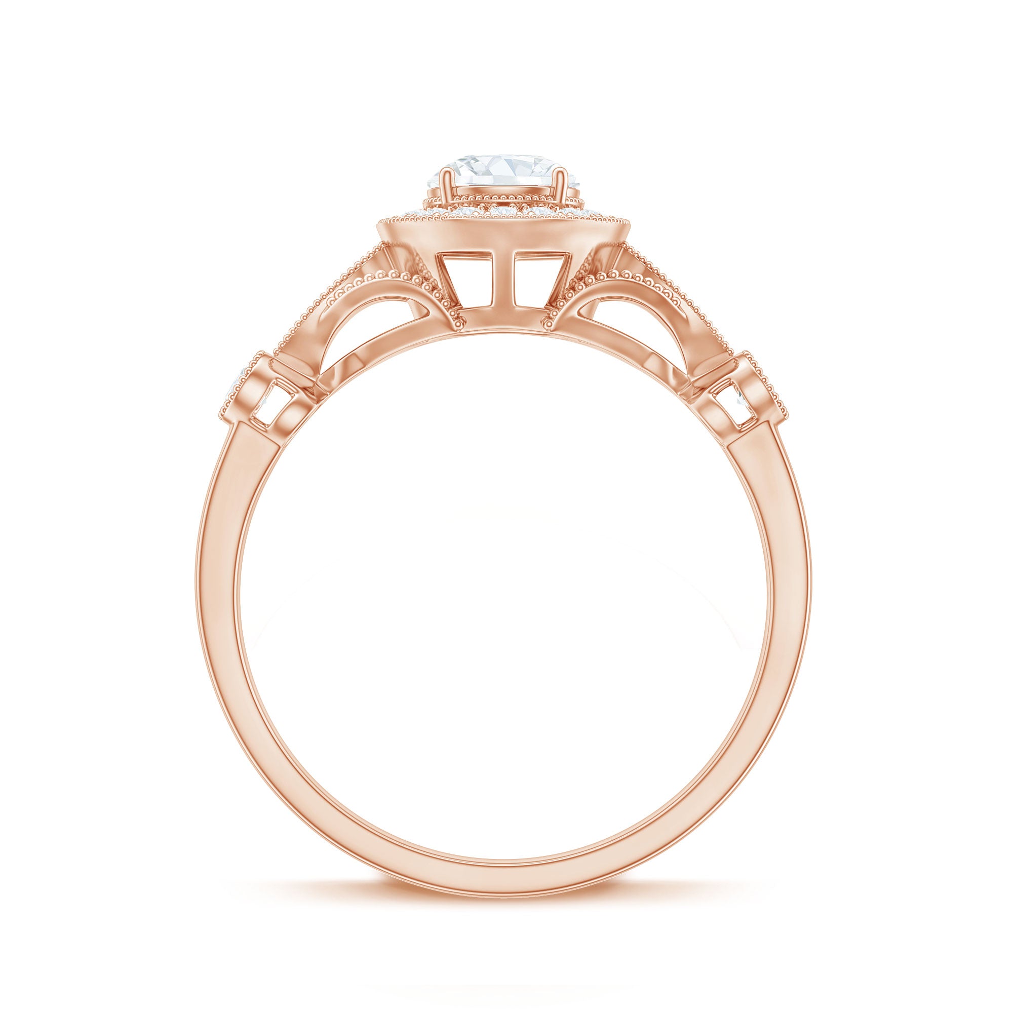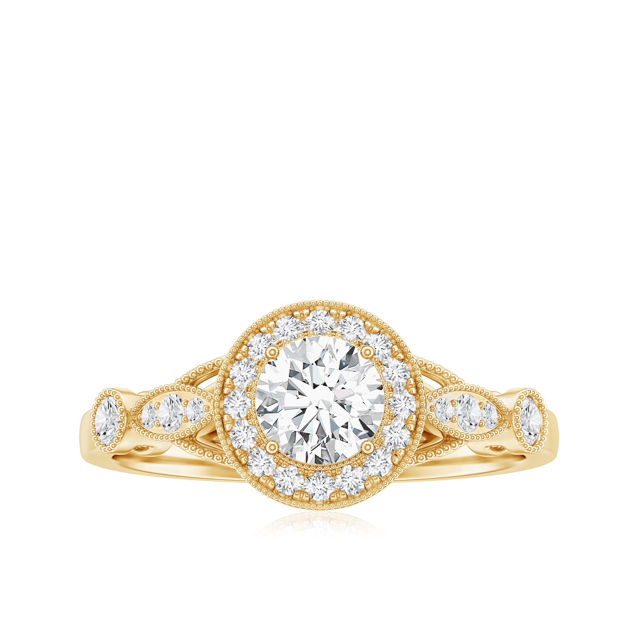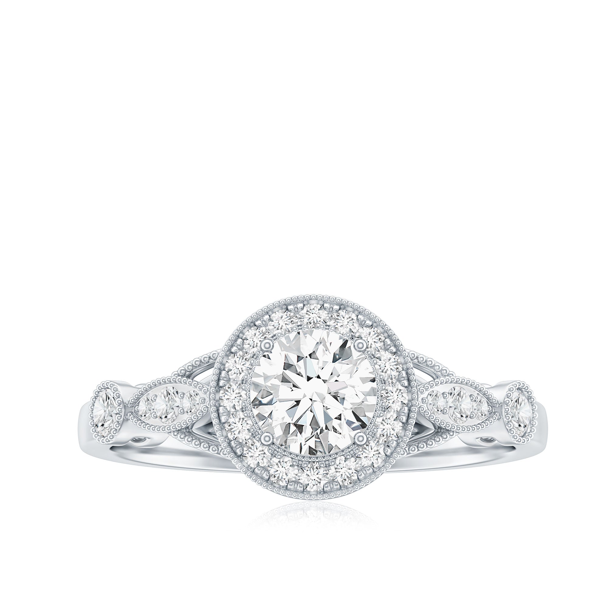 Celebrate a love that is as enduring as it is radiant with this stunning Moissanite Halo Engagement Ring. At the center of this timeless piece rests a 5 MM round moissanite, expertly cut to reflect exceptional brilliance and fire. Surrounded by a sparkling halo of petite stones, the centerpiece appears even more luminous, catching light from every angle and creating a truly breathtaking glow. What sets this Antique Looking Engagement Ring apart is its vintage inspired charm. The band is detailed with intricate beaded accents and additional stones that echo the elegance of antique jewelry, adding texture and depth without overwhelming the design. It is a beautiful balance of classic romance and contemporary style, thoughtfully crafted for the bride who finds beauty in tradition but writes her own story. The halo style enhances the moissanite presence while offering a soft, feminine silhouette that feels both luxurious and refined. Every detail has been designed to highlight the stone’s brilliance and reflect the significance of your commitment. This Round Moissanite Engagement Ring arrives in an elegant jewelry box, ready for that unforgettable YES moment. Romantic, radiant, and retro-inspired, it is more than just a ring, it is a forever promise, captured in a setting she will never want to take off.