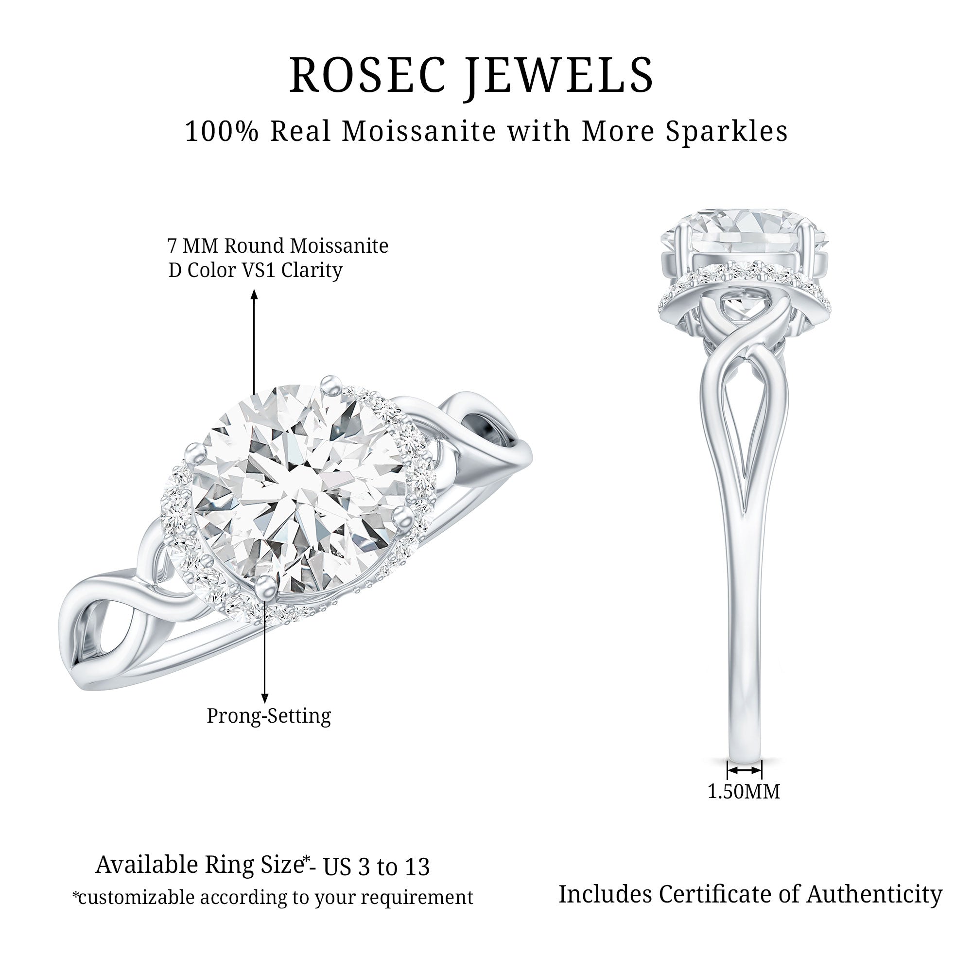 Make a timeless statement with this Moissanite Engagement Ring, a perfect reflection of love that lasts forever. At the heart of this captivating design lies a 7 MM round cut moissanite, securely nestled in prong setting. The band is thoughtfully crafted with a graceful infinity inspired twist, intertwining two paths into one unified design. This elegant motif represents a bond that is eternal, two souls forever connected. Along the shoulders of the band, petite round moissanites accent shimmer delicately, adding just the right amount of sparkle without overshadowing the center stone. Crafted with care and precision, this Infinity Engagement Ring is a beautiful blend of symbolic meaning and refined beauty. The D-VS1 quality moissanite stones offer high clarity and unmatched brilliance, making this Round Engagement Ring not only an eye-catching piece but also a mindful and luxurious alternative to traditional diamonds. Its contemporary charm and timeless elegance ensure it will be cherished for a lifetime. Presented in a beautifully crafted jewelry box, this Solitaire Moissanite Ring is ready to become the centerpiece of your love story, a symbol of forever, wrapped in brilliance and grace.