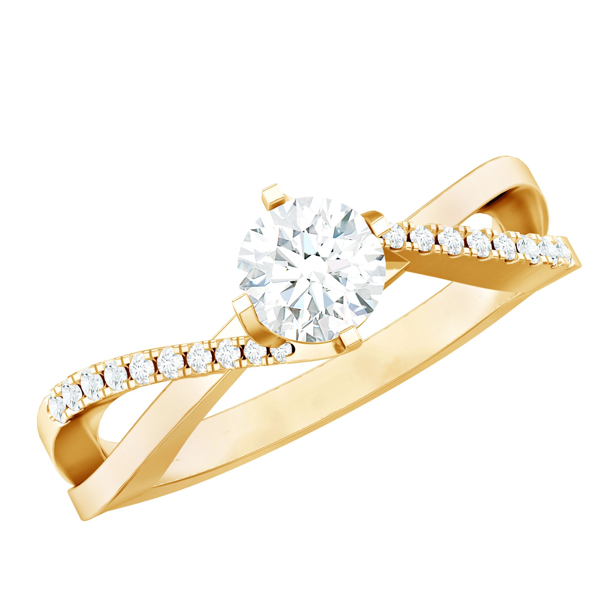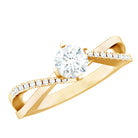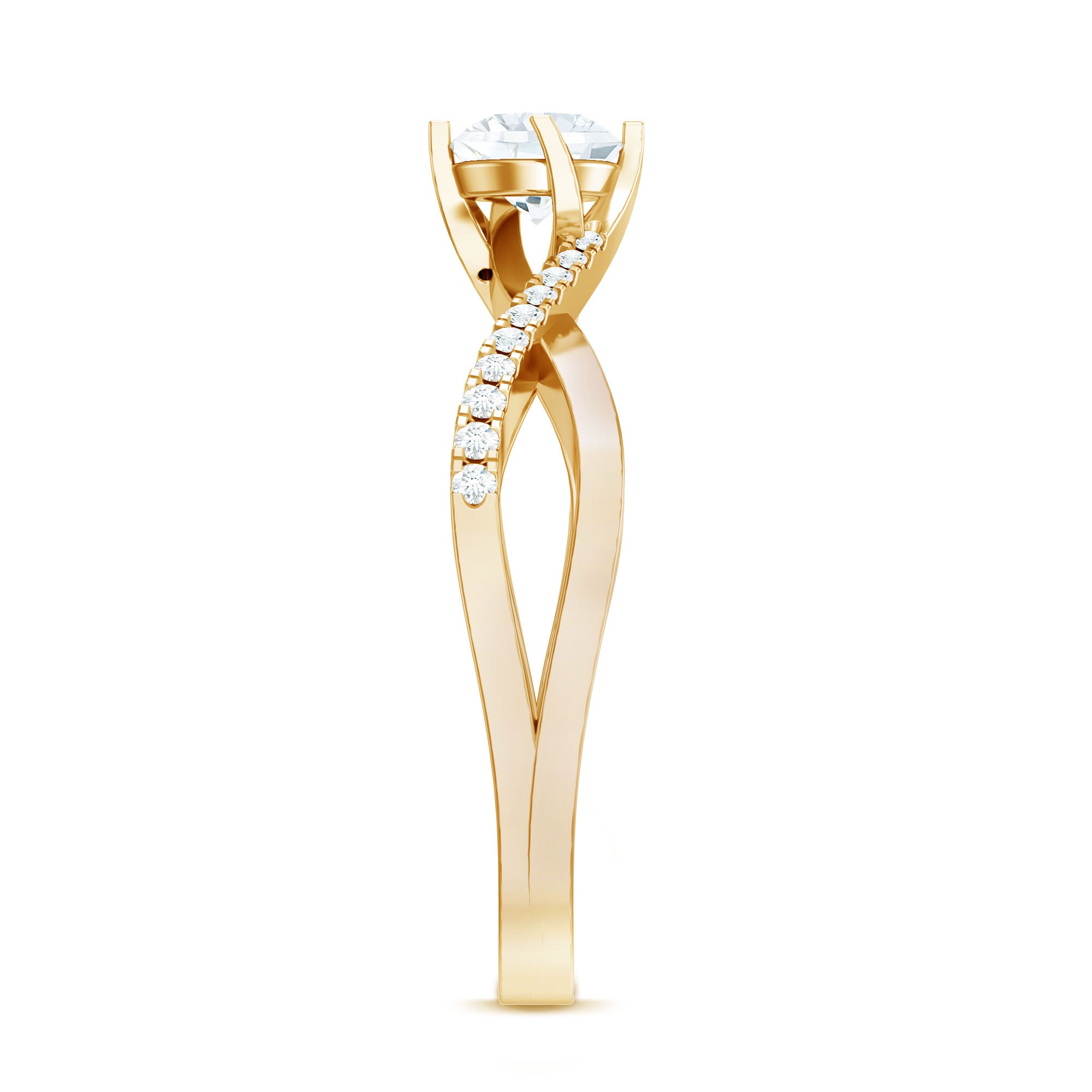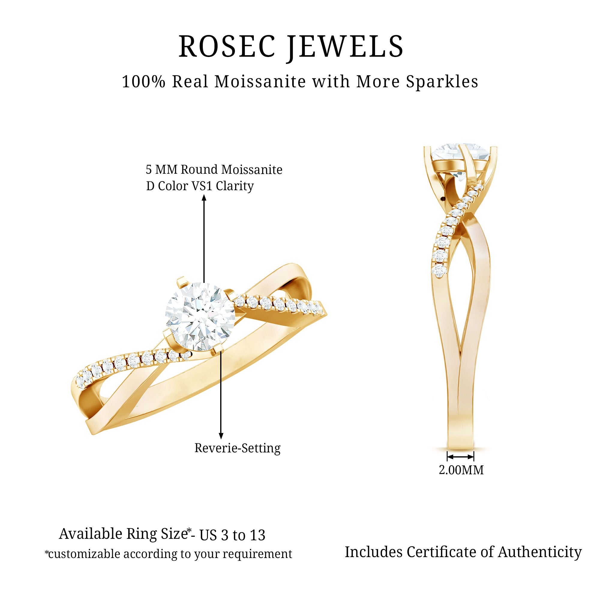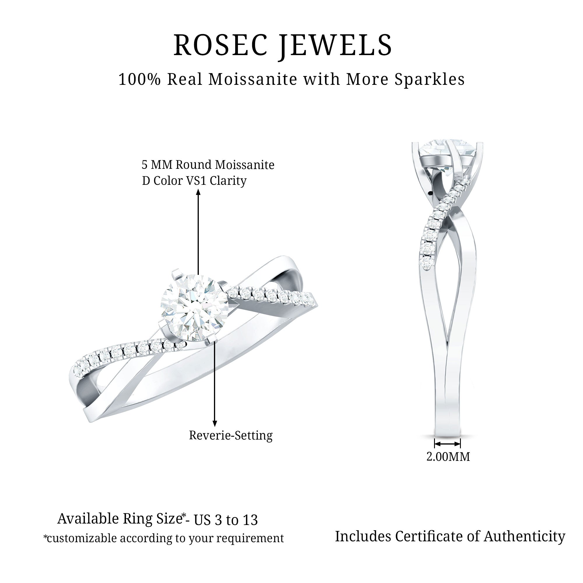 Turn every moment into a lasting memory with this beautiful Infinity Engagement Ring. Made to celebrate eternal love, this stunning piece features a brilliant 5 MM round cut moissanite at its center, securely set in a reverie setting. The band gracefully twists in an infinity style, symbolizing a bond that knows no limits, two souls united in everlasting harmony. Sparkling moissanite accents embellish the band in a bypass style for a unique flair, enhancing its brilliance and adding just the right amount of sparkle from every angle. Thoughtfully designed for the modern romantic, this Moissanite Engagement Ring combines classic beauty with a modern twist. The D color and VS1 clarity of the moissanite stone reflect the purity of your promise and love story. Whether you are proposing on a special occasion or simply expressing your deepest emotions, this Moissanite Ring for Women is a lovely symbol of your unbreakable connection. It is meticulously handcrafted to ensure it shines as brightly as your future together. Ideal for anniversaries, engagements, birthdays, or any cherished event - this Moissanite Infinity Ring is a lifelong reminder of love, commitment, and forever.