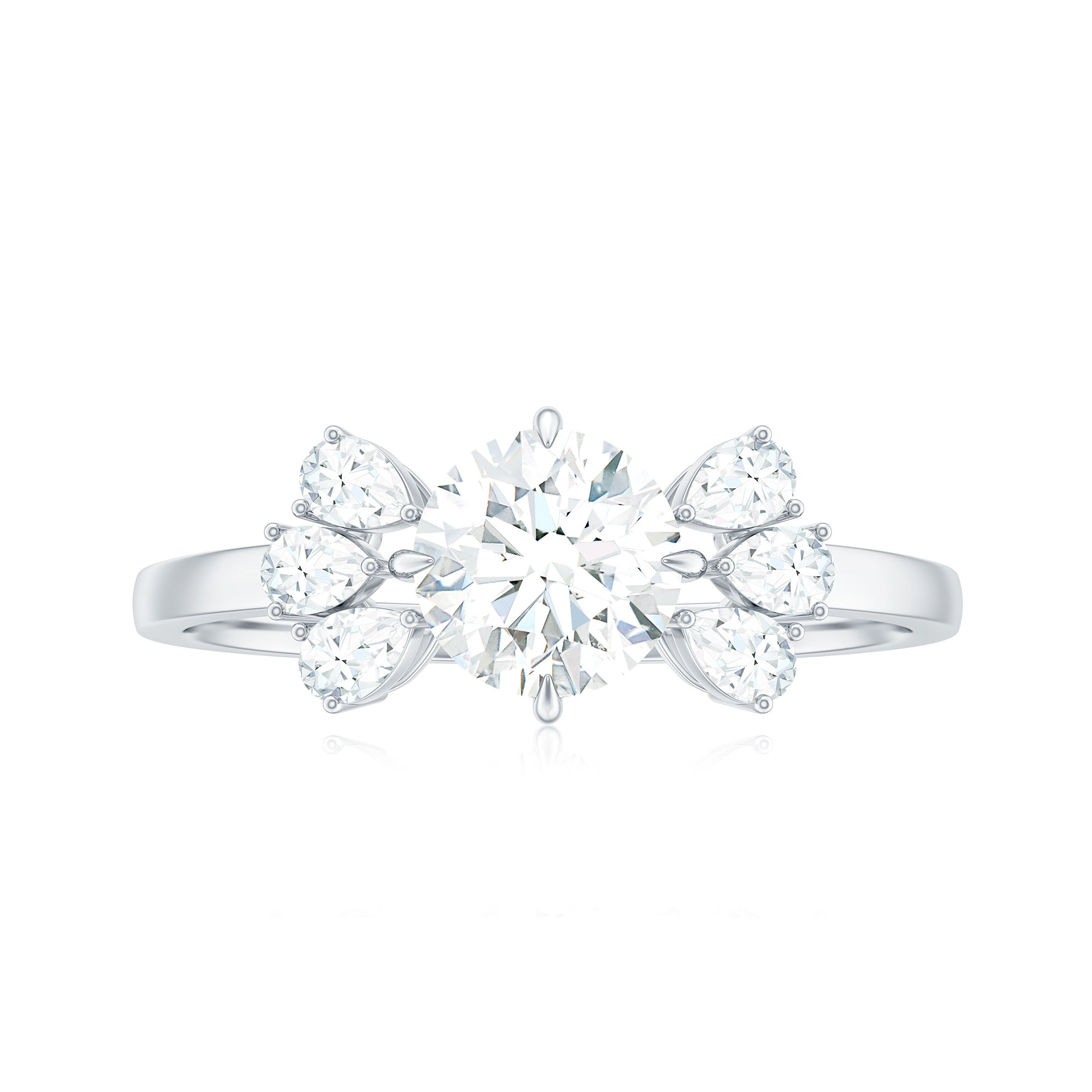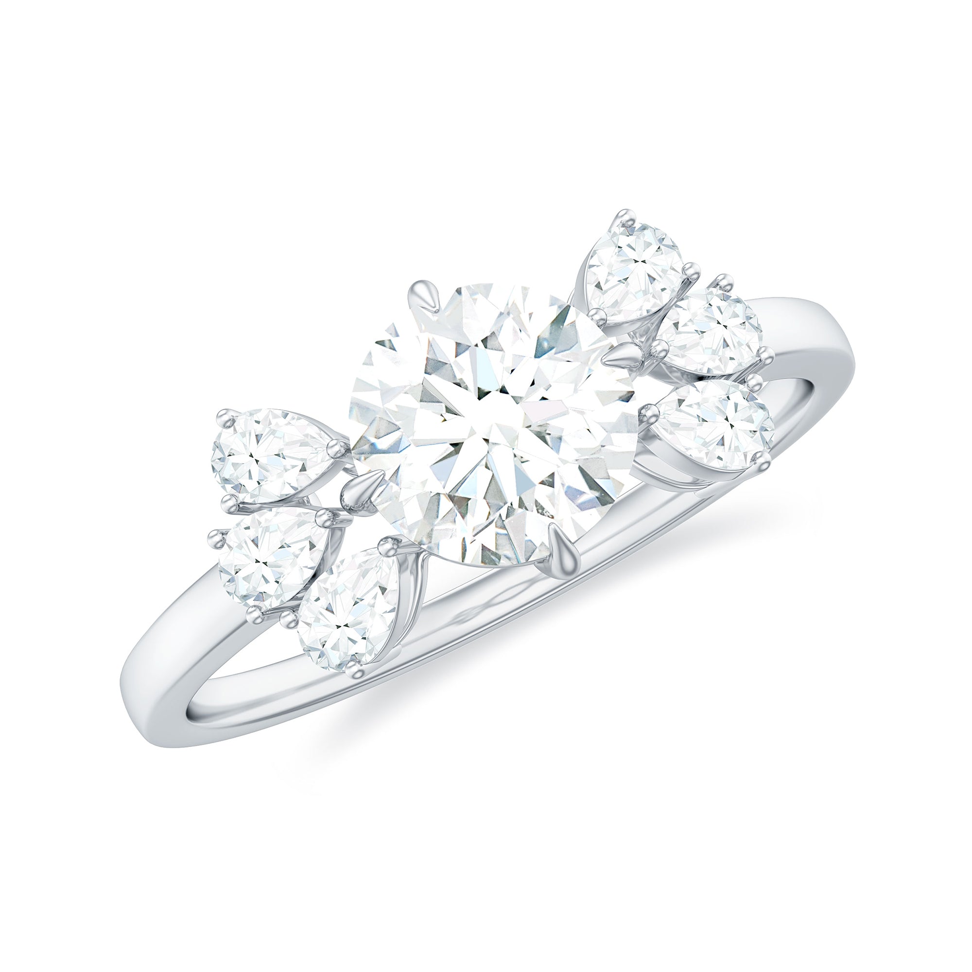 Make an entrance with this brightly polished Moissanite Engagement Ring. At the center of this romantic piece glows a brilliant 6MM round cut moissanite, cradled in secure claw setting. On each side of the center stone, dainty trios of pear shape moissanite stones shimmer like drops of light, symbolizing the past, present, and future of your promise. Their sparkle adds a graceful balance to the design, while the soft curves of the band bring a sense of flow and harmony. Every stone in this Cluster Engagement Ring is offering the brilliance and fire of fine jewelry with a more thoughtful, sustainable choice. The D-VS1 quality moissanites offer outstanding clarity and a dazzling brilliance, rendering this piece an extraordinary selection in terms of both sentiment and visual appeal. Whether you are solidifying a commitment, expressing love, or offering a meaningful present, this Certified Engagement Ring tells a story of connection and consideration. Carefully designed with an emphasis on precision and a modern flair, this Moissanite Ring for Women is presented in an elegant jewelry box, making it perfect for personal enjoyment or as a gift. With its floral charm and timeless design, it is a ring meant not just for adornment but also for everlasting appreciation.