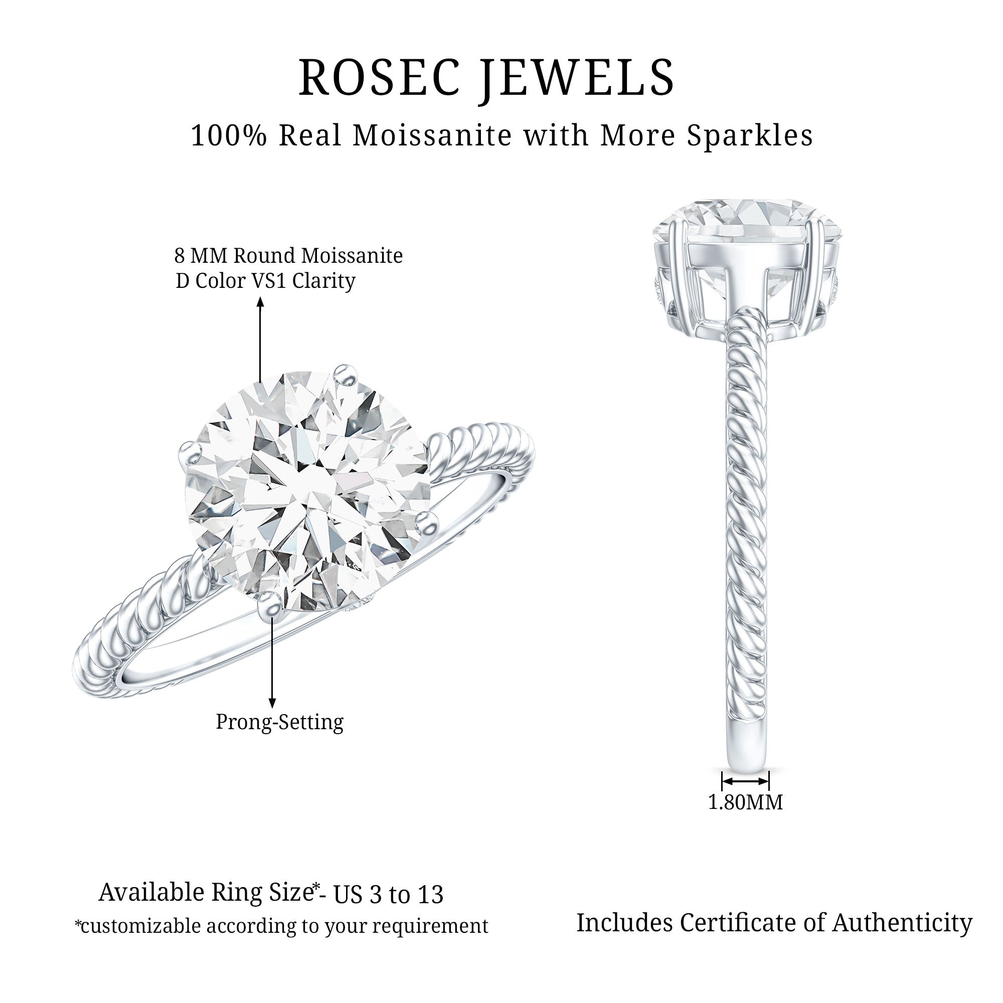 This Solitaire Moissanite Engagement Ring blends eye-catching sparkle with meaningful details, making it a special choice for anyone who loves unique, timeless jewelry. At the center of this Solitaire Engagement Ring is a brilliant 8 MM round cut moissanite, which shines with its D-VS1 quality. This stone stands out for its exceptional clarity and sparkle that is sure to draw attention. The moissanite sits in a lotus basket setting that adds a delicate, floral touch. This petal shaped setting cradles the stone like a blooming flower, symbolizing new beginnings, purity, and love that grows stronger with time. The band features a twisted rope design, offering both visual texture and deeper meaning. The rope style reflects strength and connection, two strands that twist and turn, but always stay together. Whether you are proposing, marking a meaningful milestone, or gifting it as a token of love, this Round Cut Engagement Ring is perfect for the moment. It is designed to be worn every day, lightweight, durable, and full of character. This 2 Carat Moissanite Ring is available in a range of sizes, so you can find the perfect fit for your story.