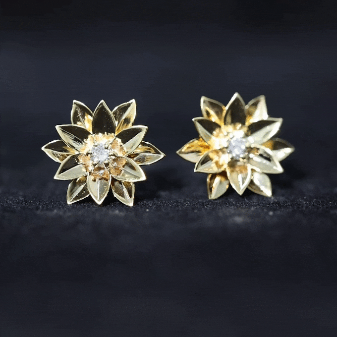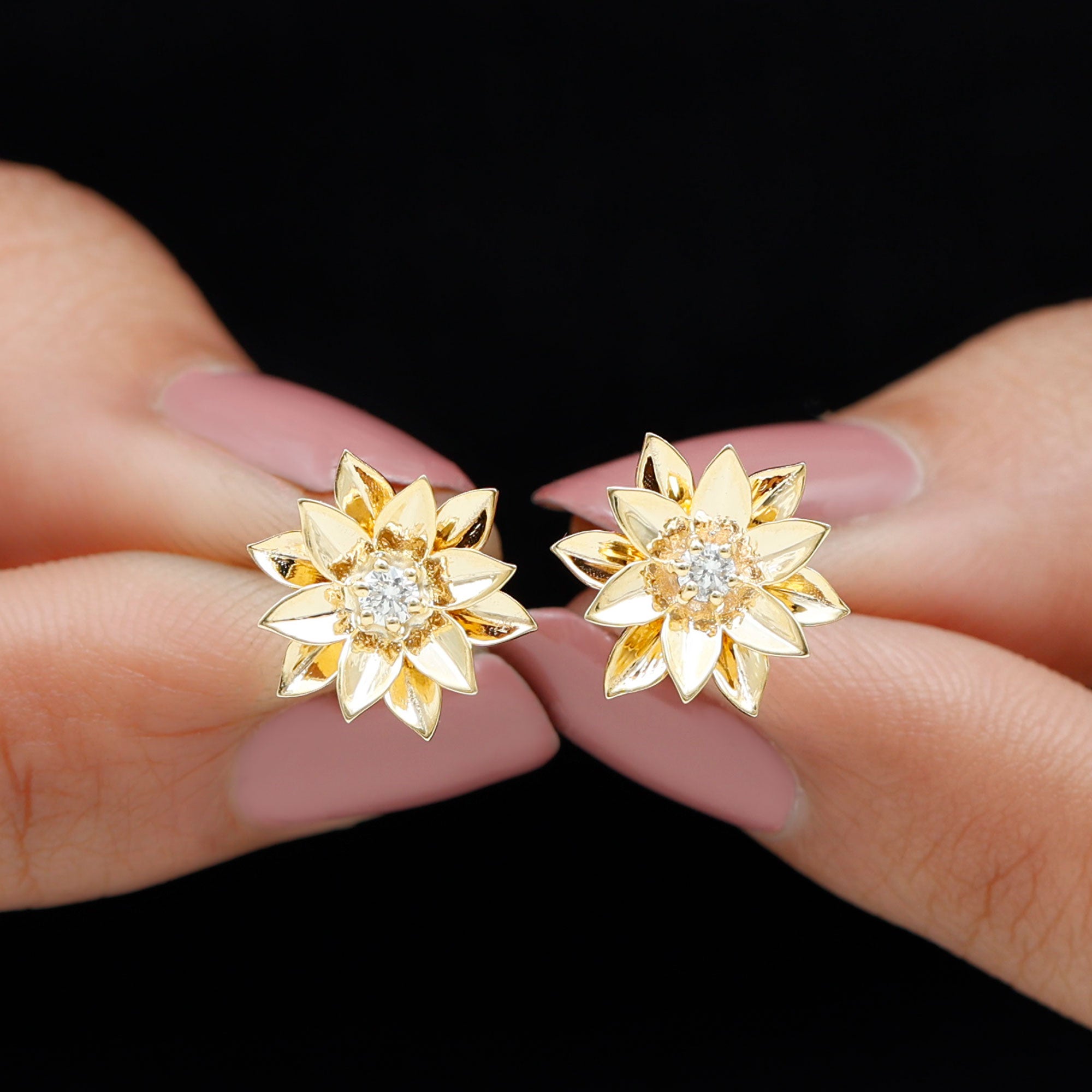 Round Cut Natural Diamond Gold Flower Stud Earrings