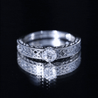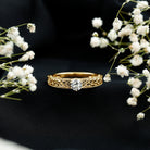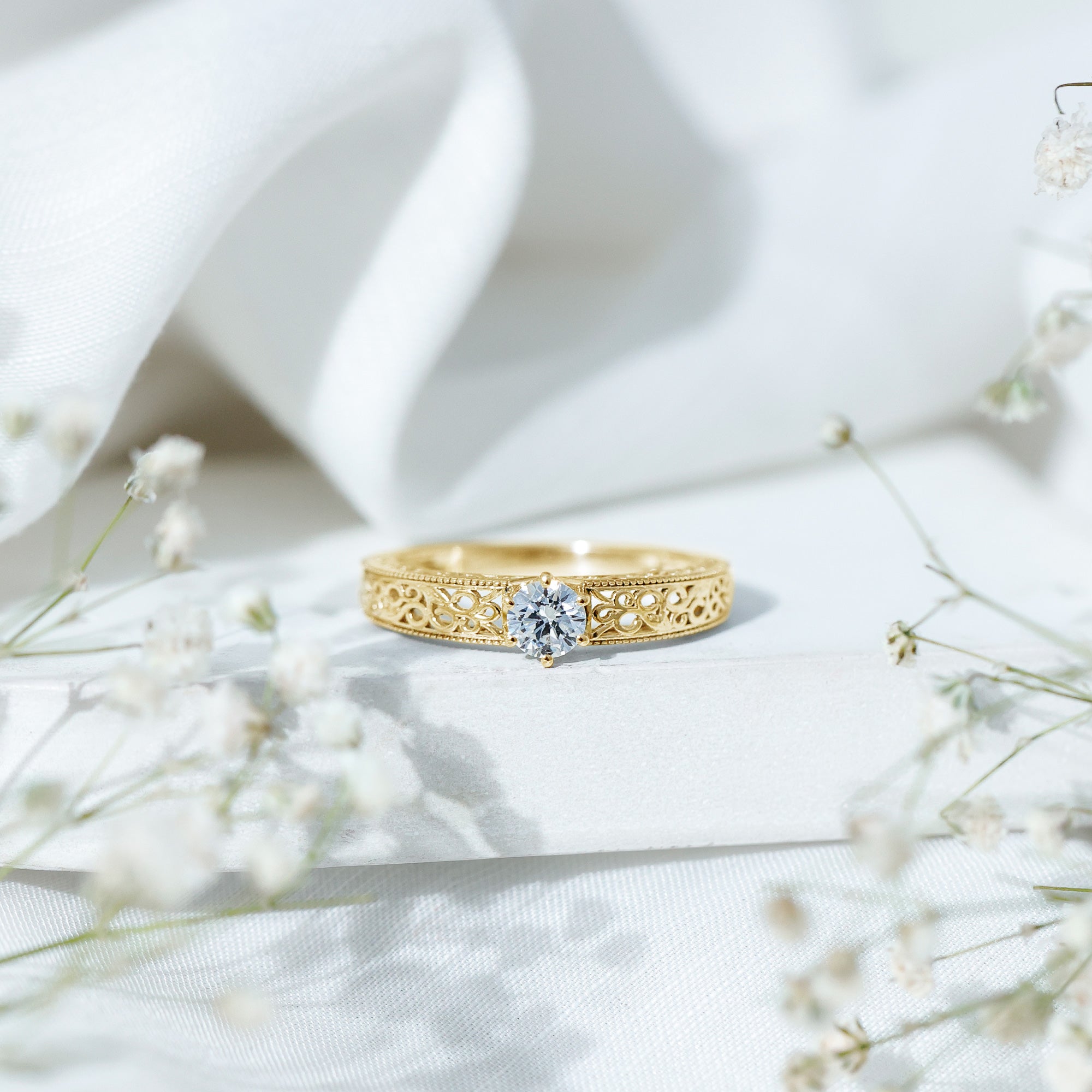 Like a treasure from the past, this Vintage Moissanite Engagement Ring tells a story of timeless love and beauty. At the center of the design sits a 5 MM Round Cut Moissanite, held securely in claw setting. Its perfect shape and fiery brilliance make it a stunning symbol of love and commitment, crafted to shine through every moment. The band features intricate Art Deco inspired filigree work, adding a rich vintage charm that feels both timeless and unique. The fine milgrain border on the band, giving it that soft, heirloom-quality finish. With a total weight of half carat, this Vintage Looking Engagement Ring is both delicate and eye-catching, perfect for brides who appreciate elegance with character. Designed for women who adore vintage flair, this Moissanite Solitaire Engagement Ring brings together romance, craftsmanship, and timeless beauty. Available in a variety of metal colors, types, and ring sizes, and delivered in a lovely jewelry box, this Antique Moissanite Ring also comes with a certificate of authenticity to ensure quality and trust. A truly memorable piece, this Vintage Filigree Ring is made to be cherished for a lifetime.