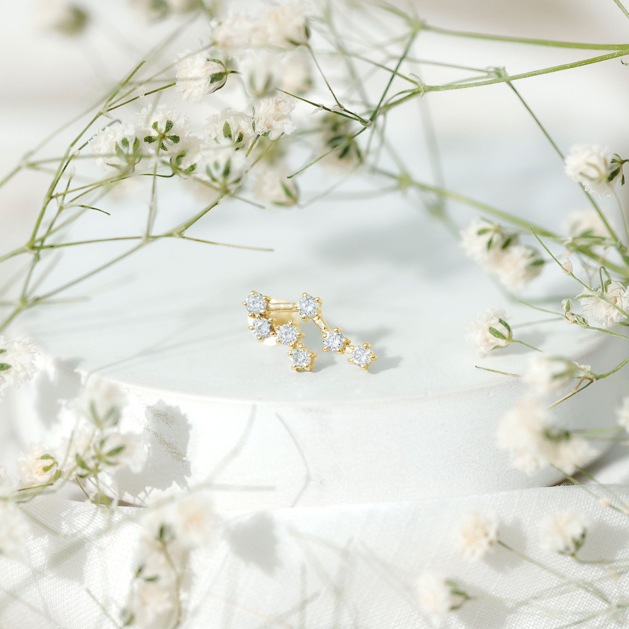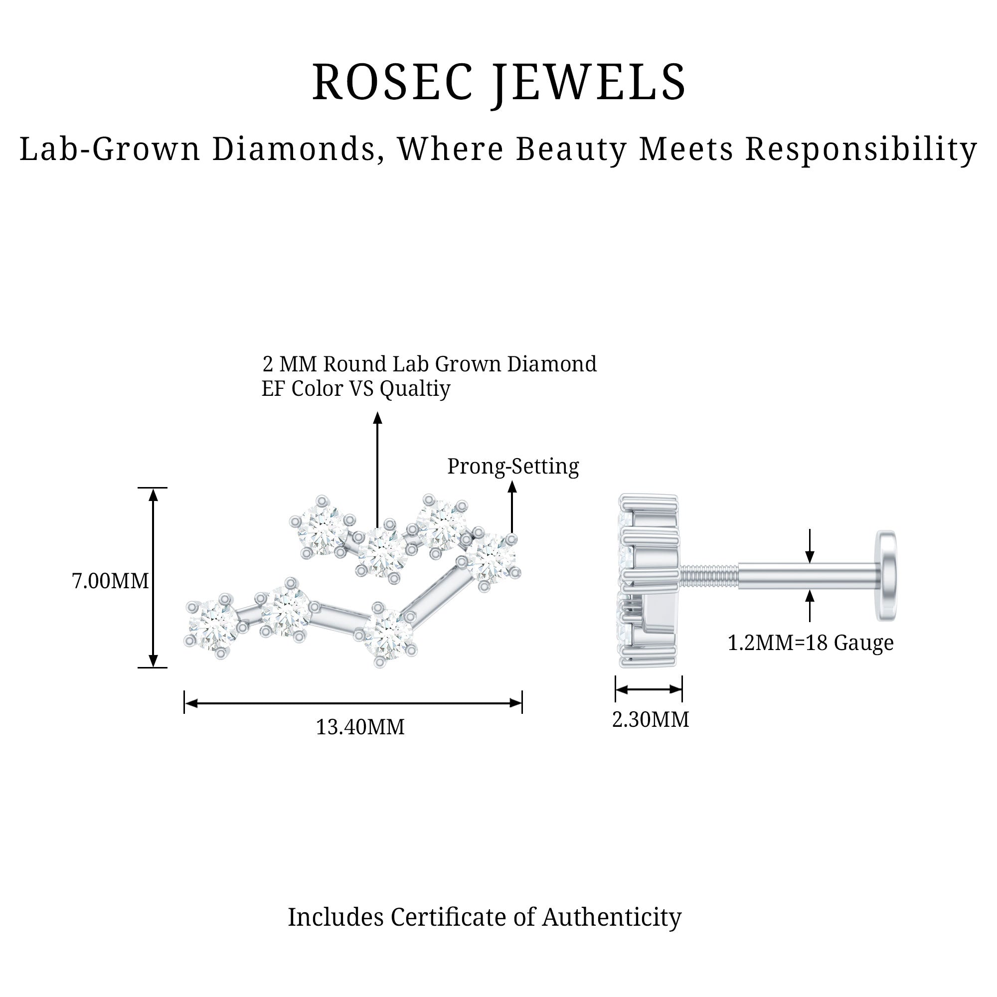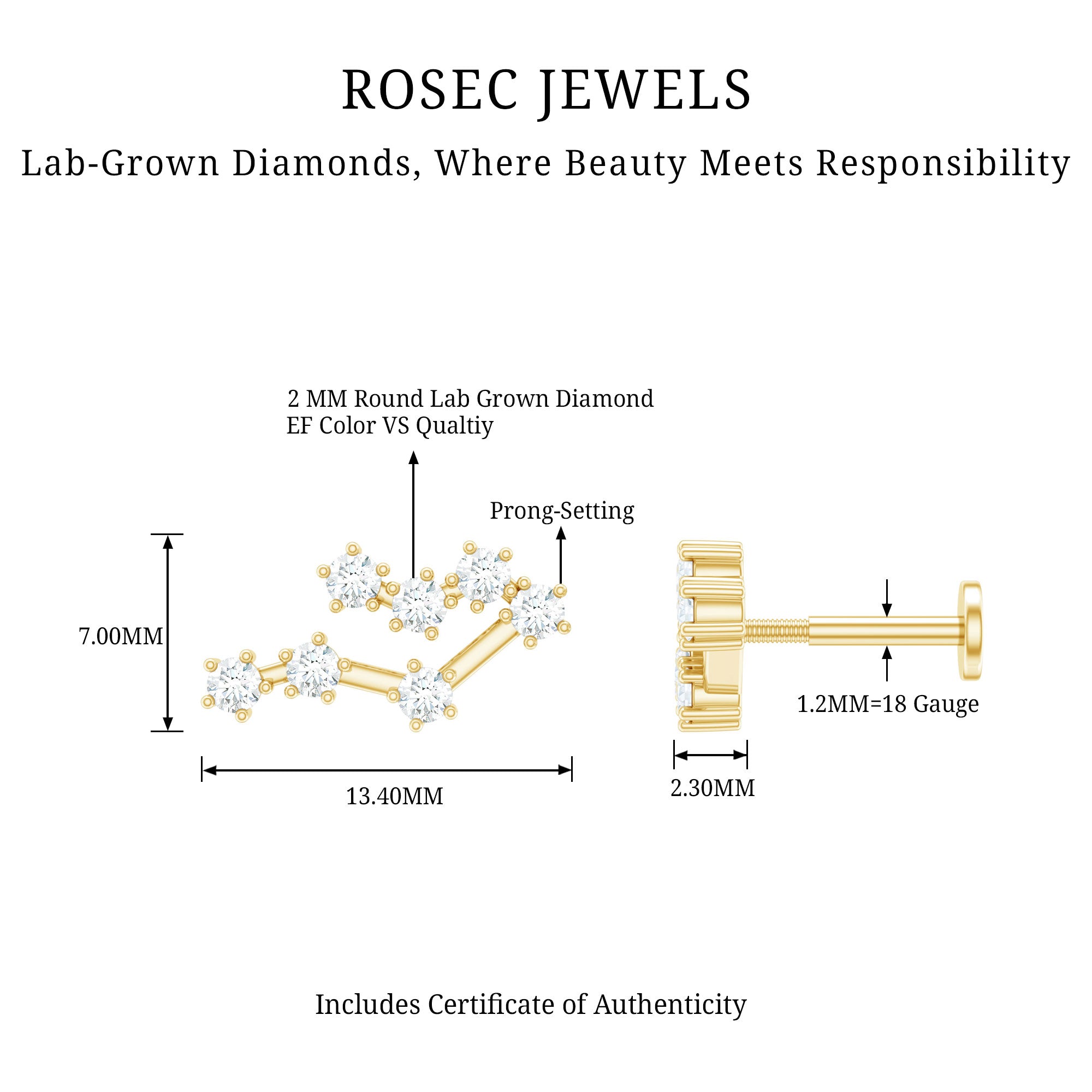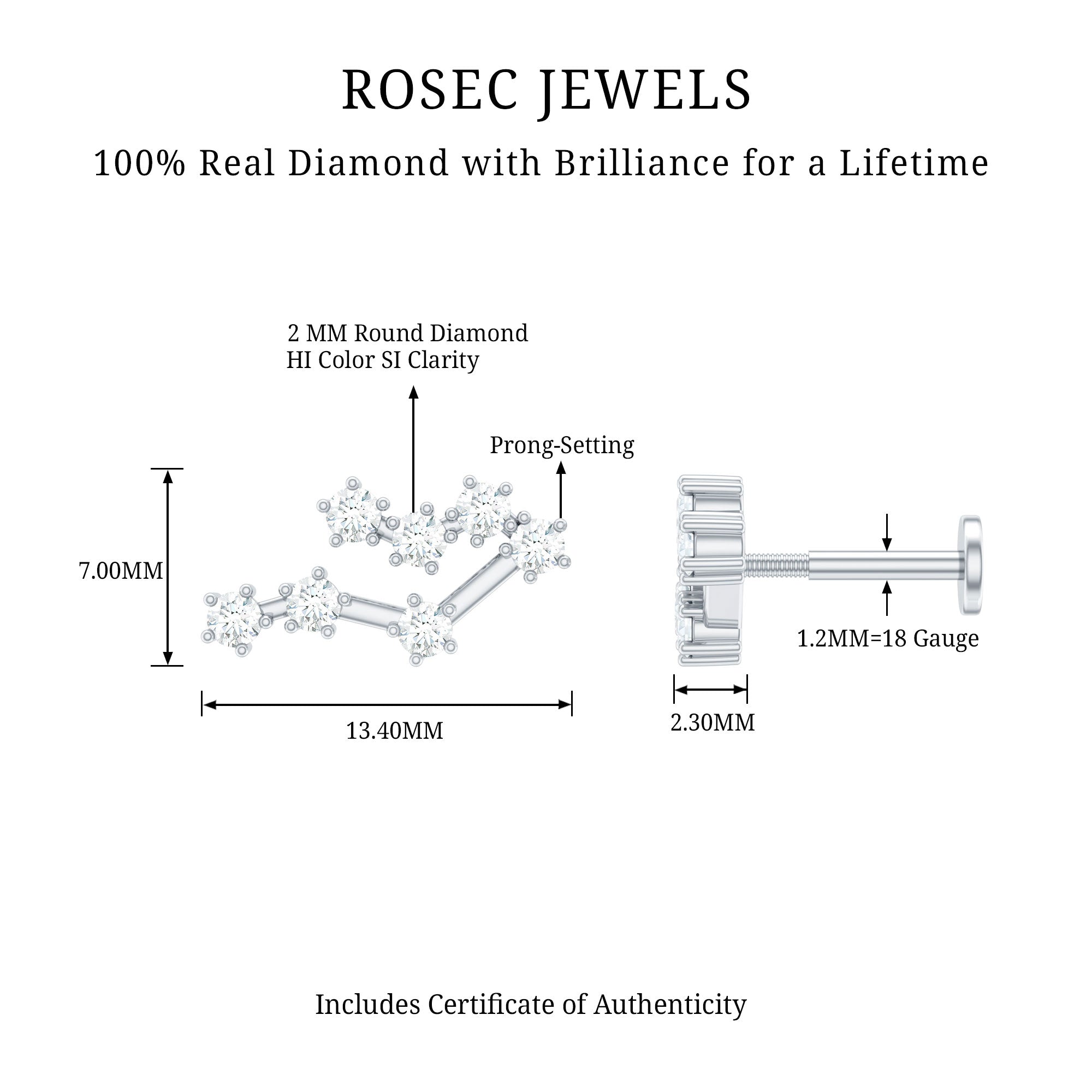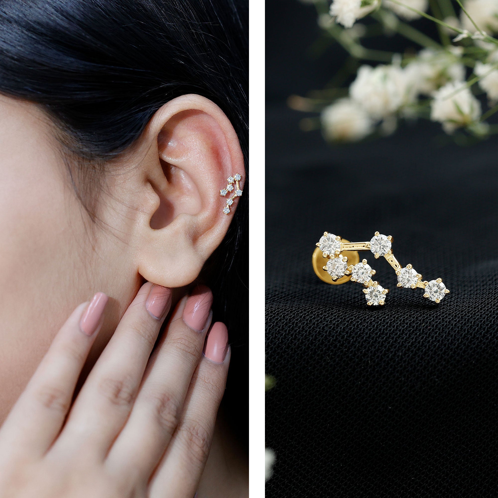 Step up your fashion game and flaunt your zodiac sign with our gorgeous Diamond Gemini Earring. It features Round Diamonds set in prong setting, creating a constellation design that is bound to grab attention. This Diamond Constellation Earring is perfect for your Helix, Cartilage, or Upper Lobe Piercings, and the Flat Back Closure ensures it stays securely in place. Whether it is for a birthday, anniversary, or just because, this Celestial Earring is a fantastic way to show her how much she means to you. Adorn her ear with this Star Sign Earring and surprise your Gemini lady in the sweetest way. Show off the earring at evening parties, work events, date nights, or any special occasion. The endless sparkle and brilliant shine of this zodiac jewelry is sure to catch your eye and make it a treasured accessory. Add a personal touch to your style with this stylish earring. Ideal for those born between May 21 and June 21, this minimalist jewelry piece carries a lot of significance. Now, you can effortlessly display your sign without saying a word - just wear it proudly on your ear. It comes with an Authenticity Certificate and a luxurious velvet pouch.