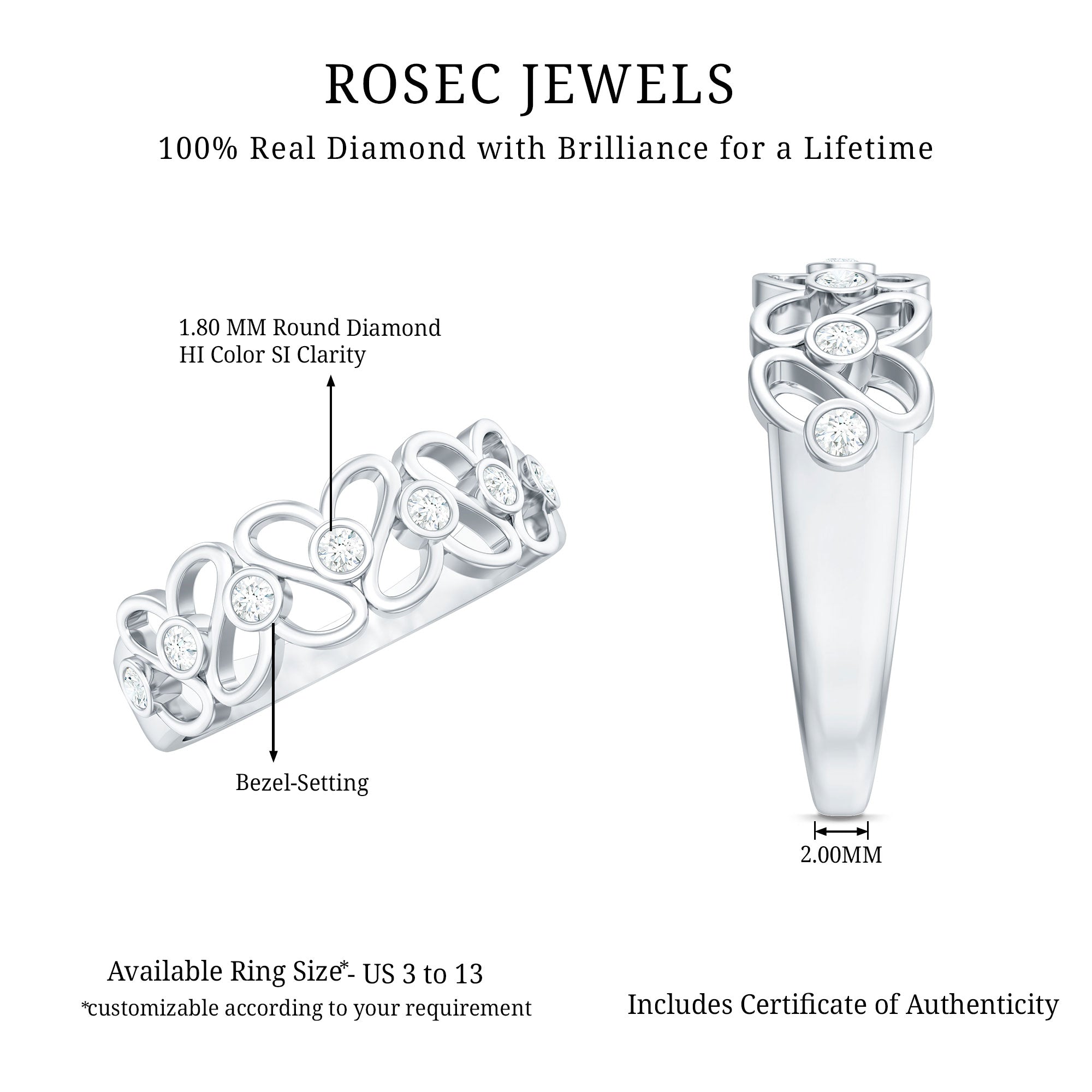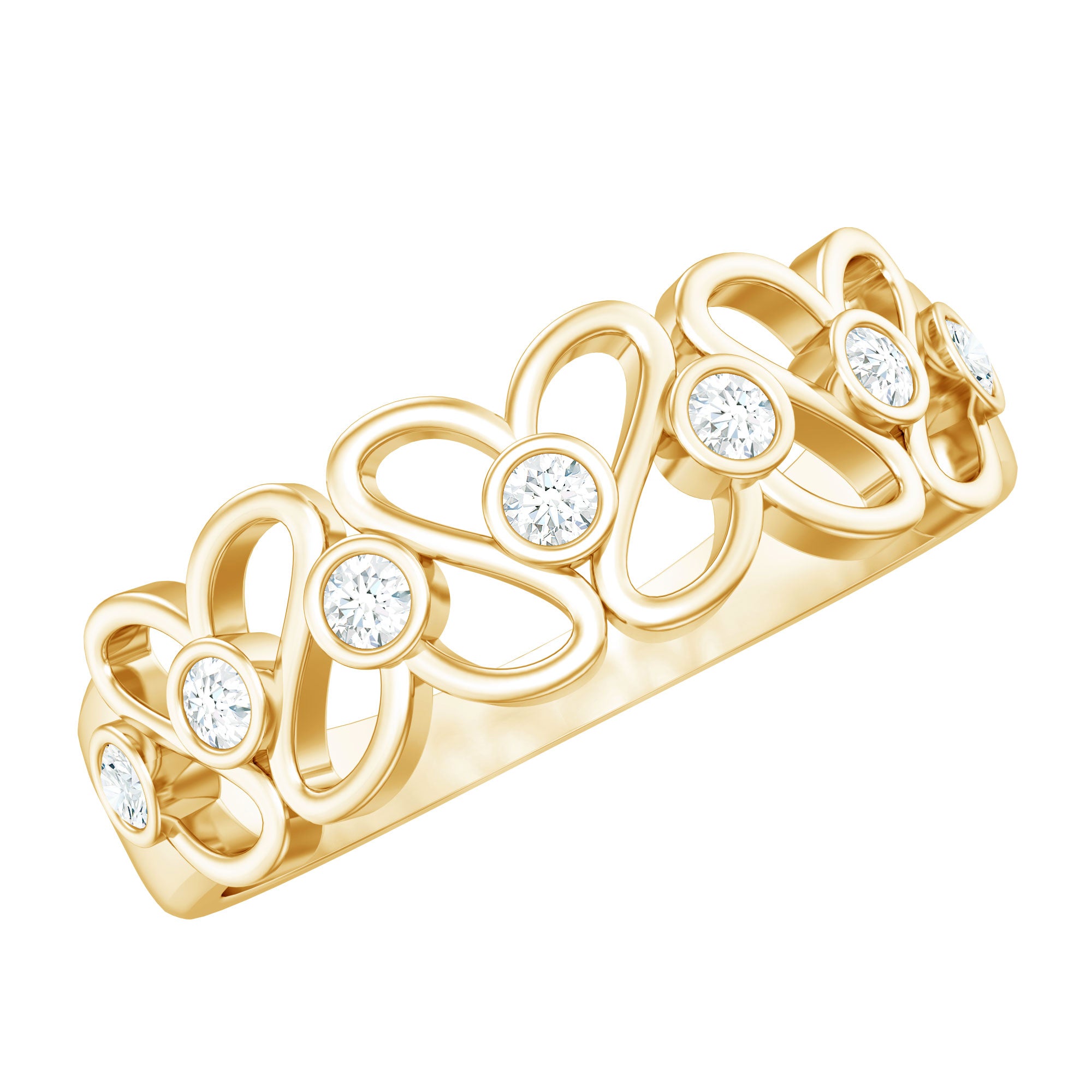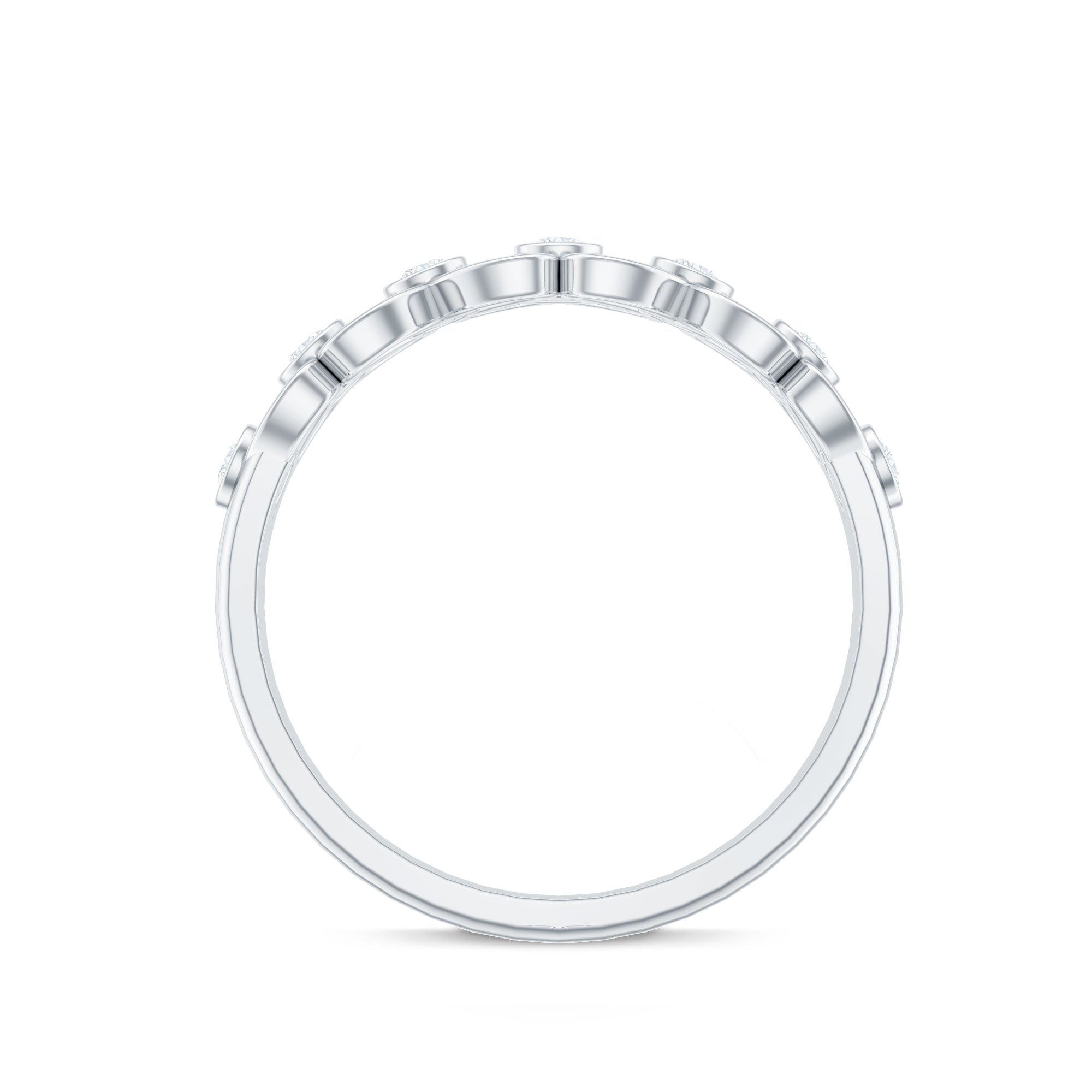 This unique and minimal Diamond Half Eternity Band is adorned with Round Shape Diamond secured in Bezel Setting, spaced out halfway around the band on a floral design. Pamper your better half by getting this Diamond Band Ring as an anniversary gift for her and capture her priceless smile.