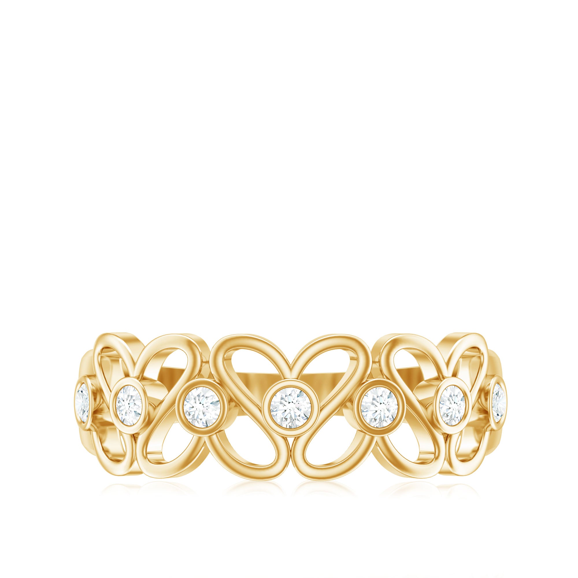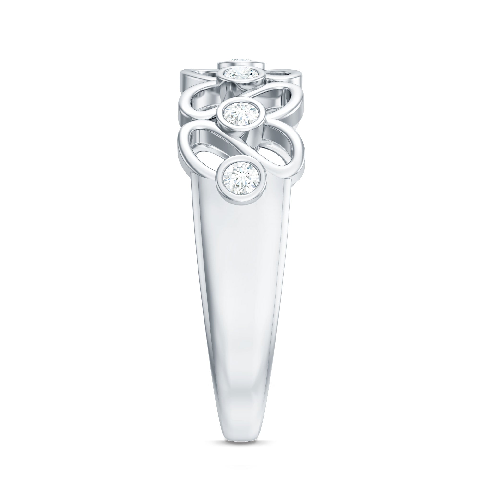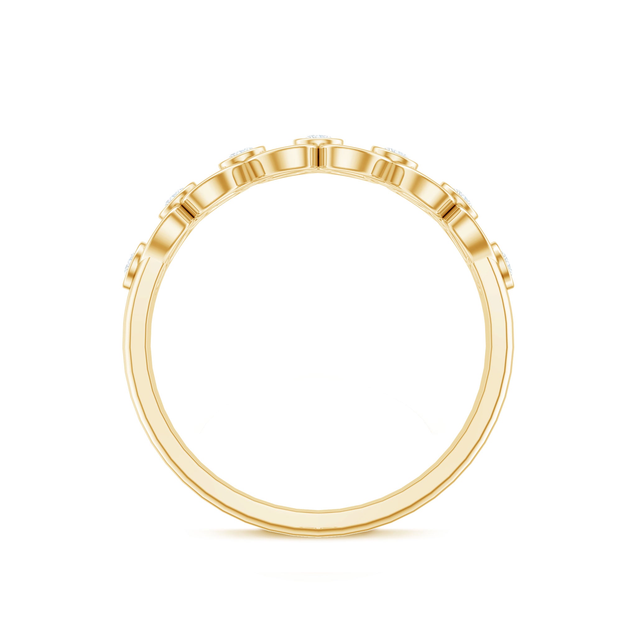 This unique and minimal Diamond Half Eternity Band is adorned with Round Shape Diamond secured in Bezel Setting, spaced out halfway around the band on a floral design. Pamper your better half by getting this Diamond Band Ring as an anniversary gift for her and capture her priceless smile.