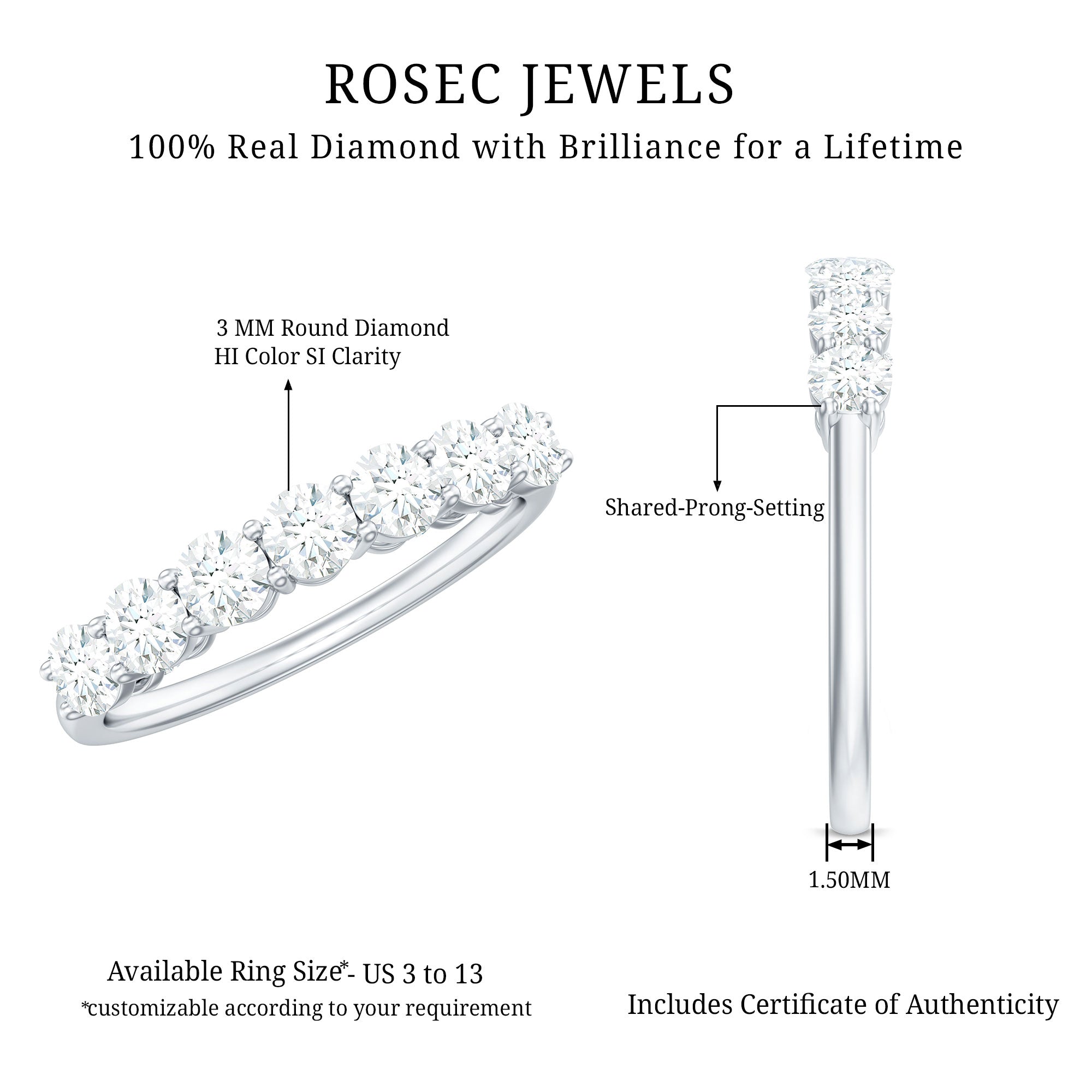 Showcasing unparalleled beauty and brilliance, the Wedding Anniversary Band features a 7 stone design adorned with round cut diamond stones securely set in shared prong setting. This Diamond Wedding Band effortlessly elevates any outfit with its radiant charm. It showcases the sparkle of HI color and SI clarity natural diamonds, making your celebration even more unforgettable. This Seven Stone Diamond Ring will come in a signature jewelry box along with a certificate of gemstone authenticity. Celebrate a special milestone with your partner using this stunning Eternity Wedding Band. You can wear this on its own for a chic and elegant look or stack it with another ring for a more personalized touch. Designed for comfort and made to dazzle for years to come, this Diamond Stackable Ring is all about making a bold statement.