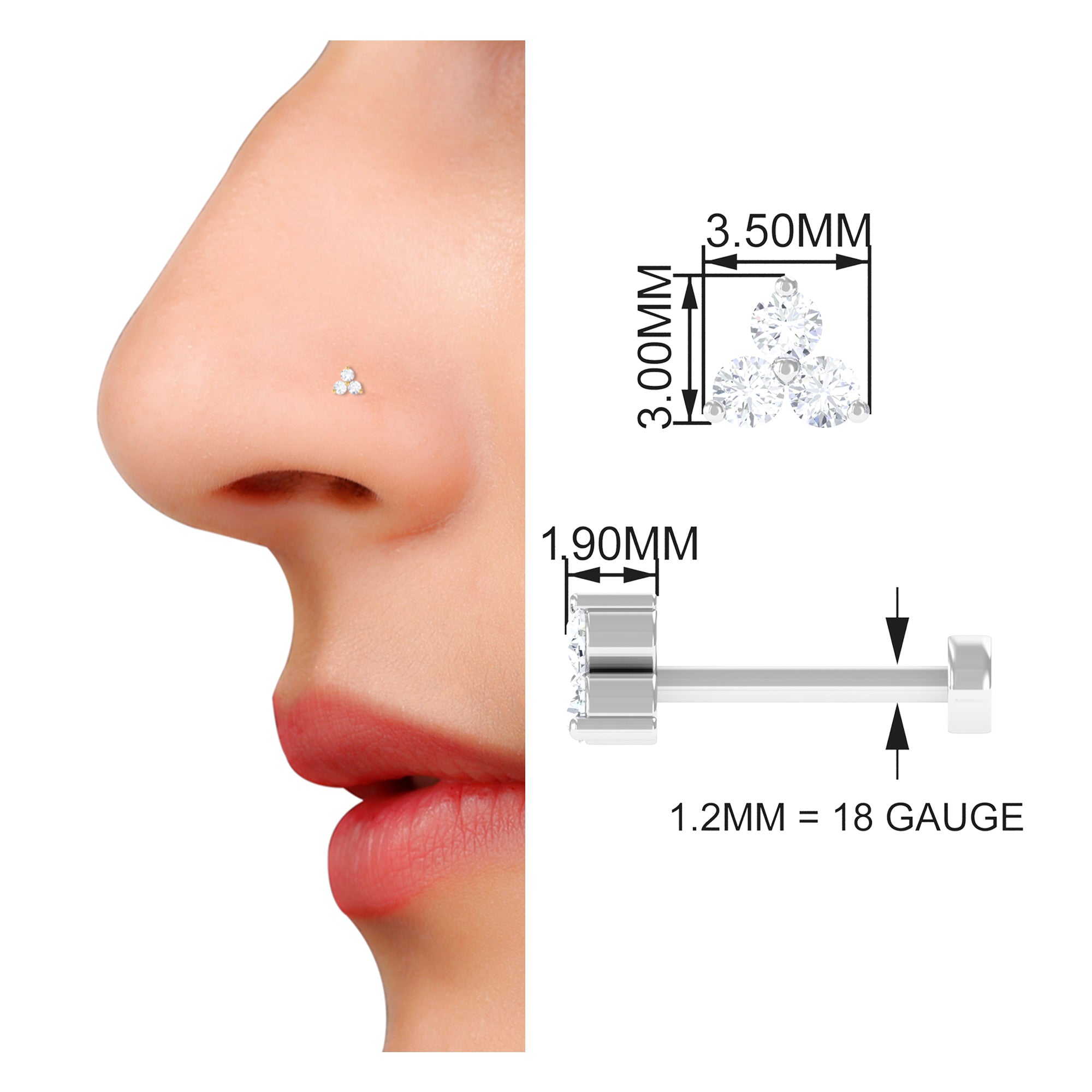 This Diamond Three Stone Nose Pin is crafted with Real Gold and adorned with three Round Cut Diamonds secured in Prong Setting, creating a stunning and sophisticated piece of Body Jewelry. Its delicate design adds a touch of understated elegance to any outfit. The tiny size of the Nose Pin makes it a great option for those who want to add some sparkle to their accessories without being too heavy. This Gold Nose Jewelry is perfect for anyone who wants to add a touch of extra shine to their look.