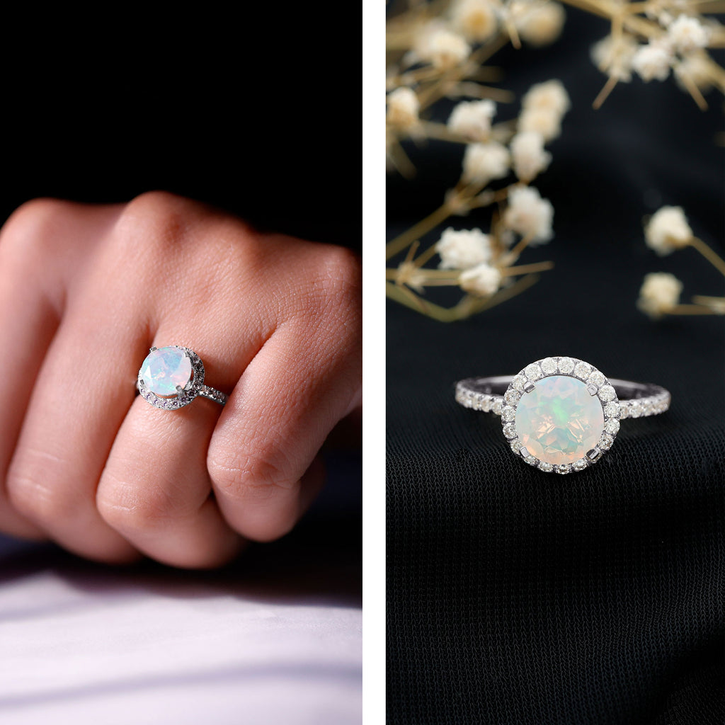 Timeless beauty with a touch of elegance, this Ethiopian Opal Engagement Ring is a luminous masterpiece that blends color and sparkle. At its heart is a glowing 8 mm Round Ethiopian Opal in Prong Setting, known for its shifting hues of soft blues, pinks and golds, like a sunrise captured in a stone. Surrounding the AAA Quality Rainbow Opal is a dazzling Halo of D-VS1 Moissanite, known for its fiery sparkle and brilliance. The band is also adorned with Moissanite stones, catching light from every angle and ensuring this Halo Engagement Ring with Opal turns heads from across the room. This Opal Engagement Ring is a symbol of forever, crafted for the kind of love that glows even in the quiet moments. Whether you are proposing, gifting or simply celebrating yourself, this Classic Engagement Ring is a statement of elegance and individuality. Available in a variety of sizes and presented in a luxury jewelry box, this Opal Halo Ring is proposal-ready and unforgettable from first glance.