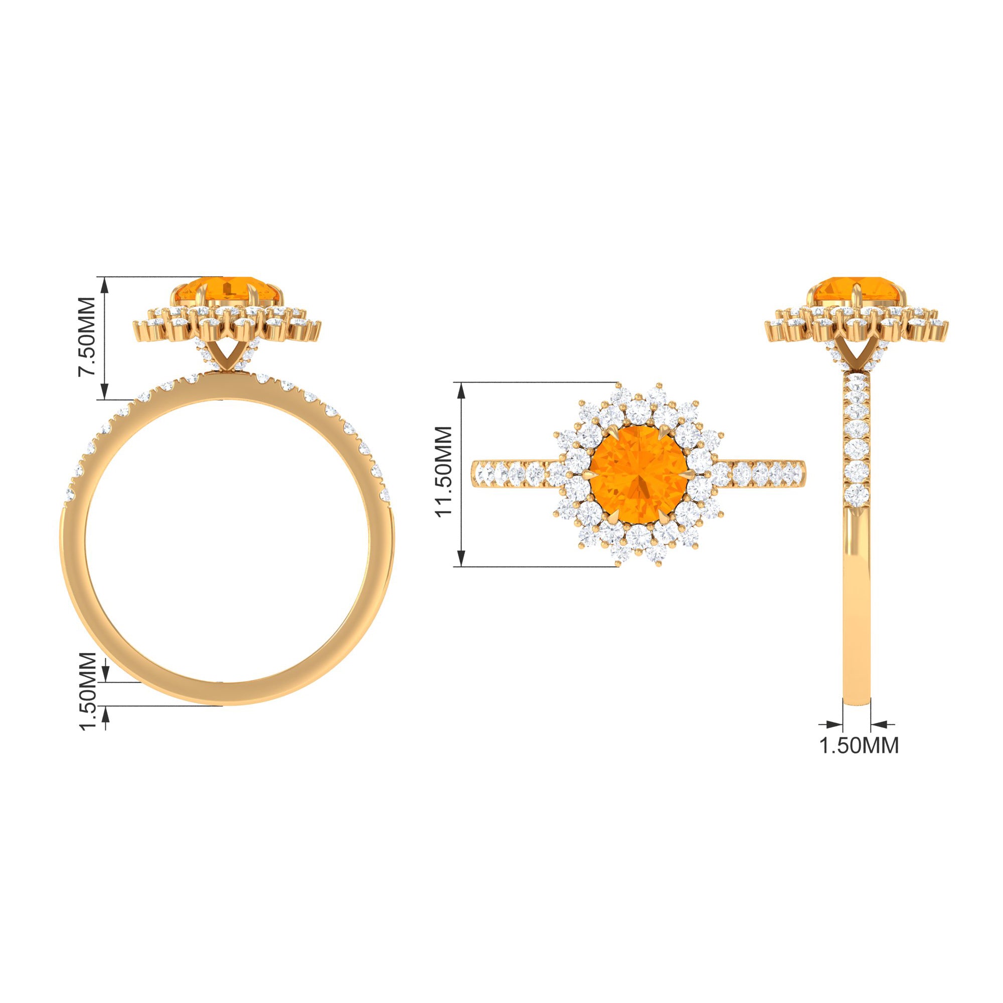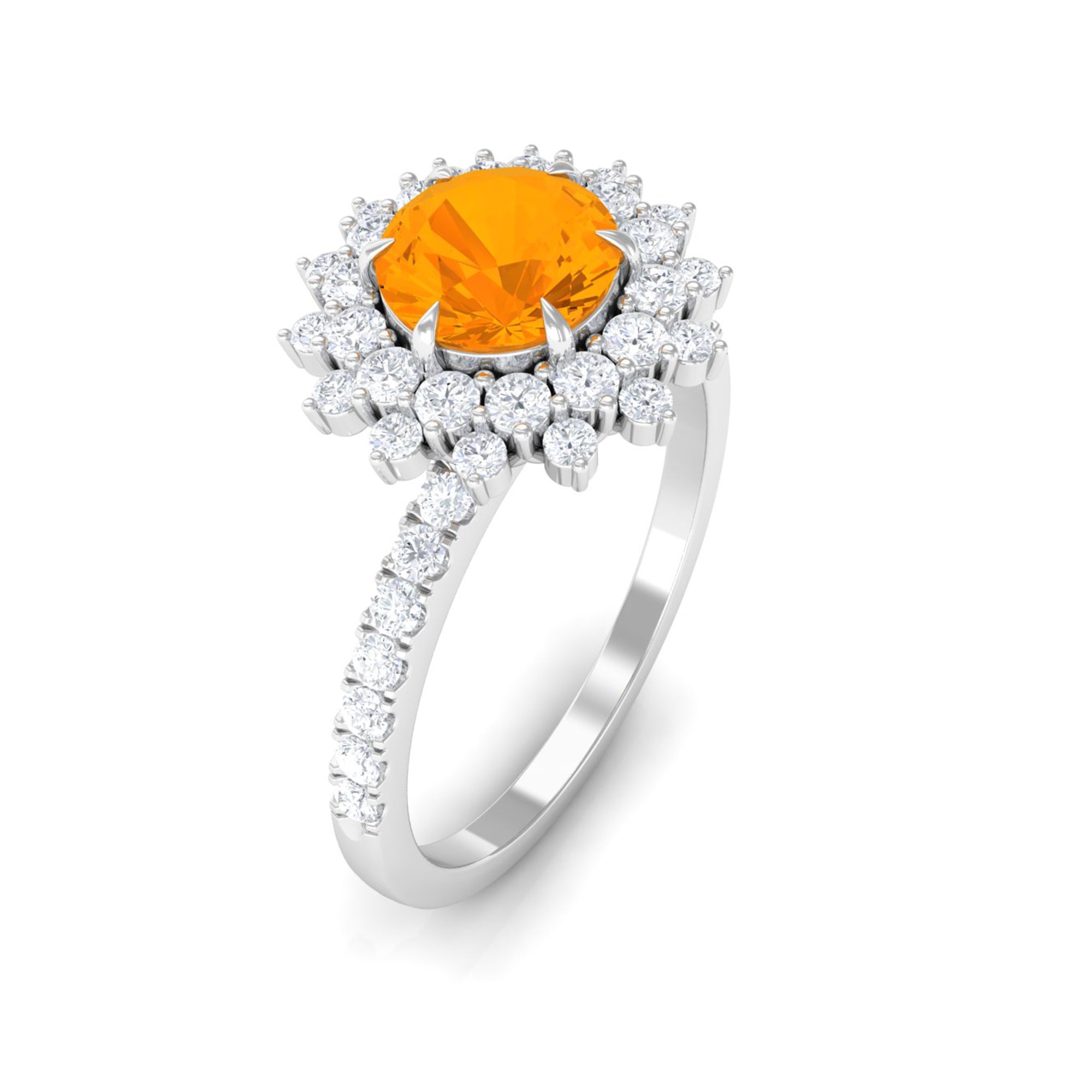 Crafted with the sumptuous appeal, this engagement ring features a stunning round Fire Opal held in a six-claw prong setting, surrounded by a captivating cluster halo of moissanite stones. The intricate design of this Fire Opal statement ring exudes a regal appearance and is crafted in gold. Impress your lady with your exquisite taste by gifting her this beautiful Fire Opal engagement ring.