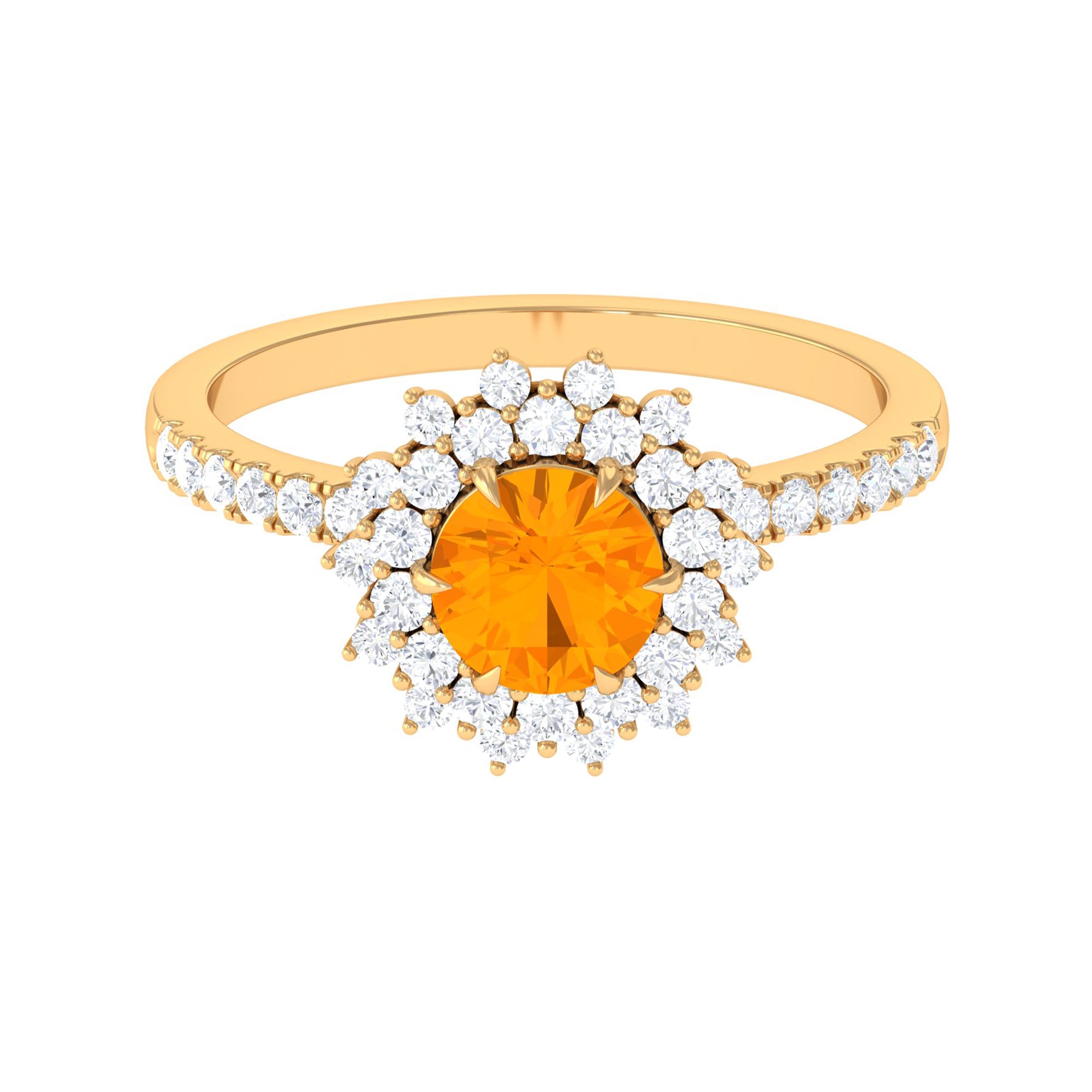 Crafted with the sumptuous appeal, this engagement ring features a stunning round Fire Opal held in a six-claw prong setting, surrounded by a captivating cluster halo of moissanite stones. The intricate design of this Fire Opal statement ring exudes a regal appearance and is crafted in gold. Impress your lady with your exquisite taste by gifting her this beautiful Fire Opal engagement ring.