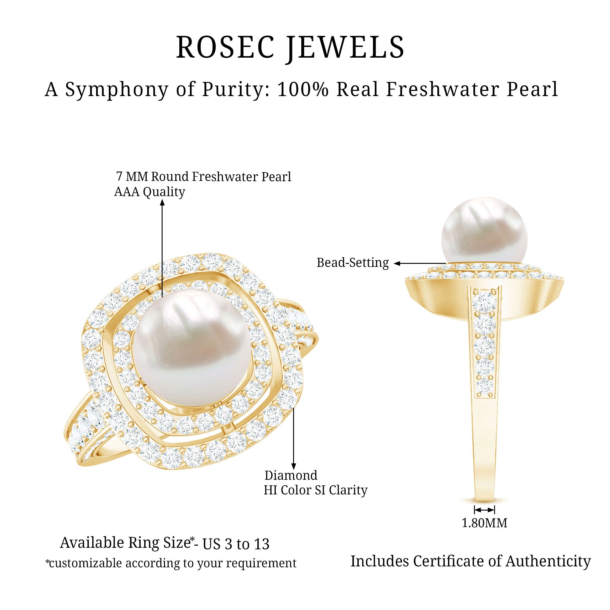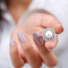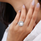 If your fashion mantra is go big or go home, this Freshwater Pearl Double Halo Ring is the one for you! Meant to make an eye-striking statement, it highlights the enormous centerpiece of 7 MM Round Shape Freshwater Pearl, secured by Prong Setting. For added flair, it is complemented by a sparkling Double Halo of Moissanite. This Pearl and Moissanite Ring has been certified for its phenomenal quality, which makes it a prized possession in your jewelry box.