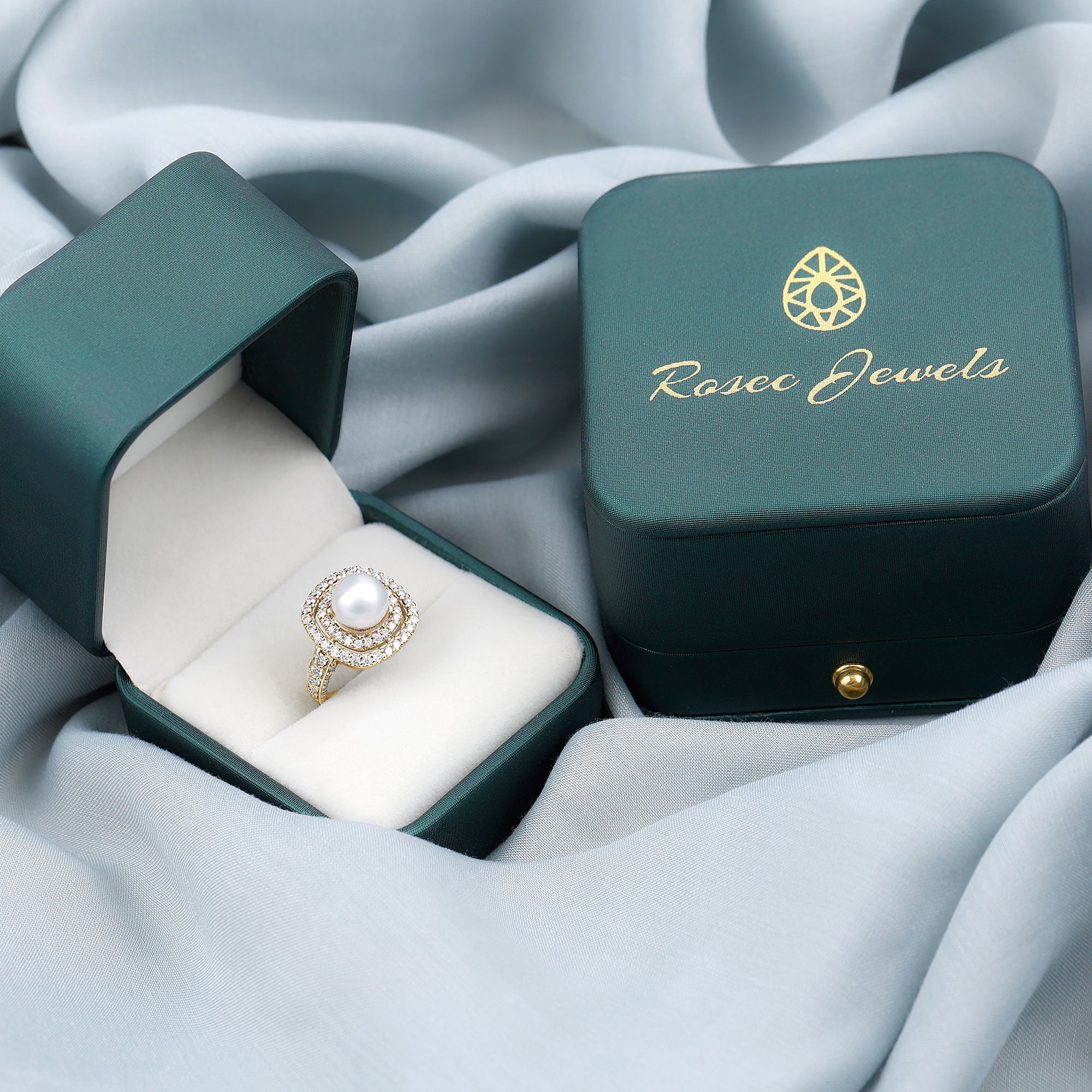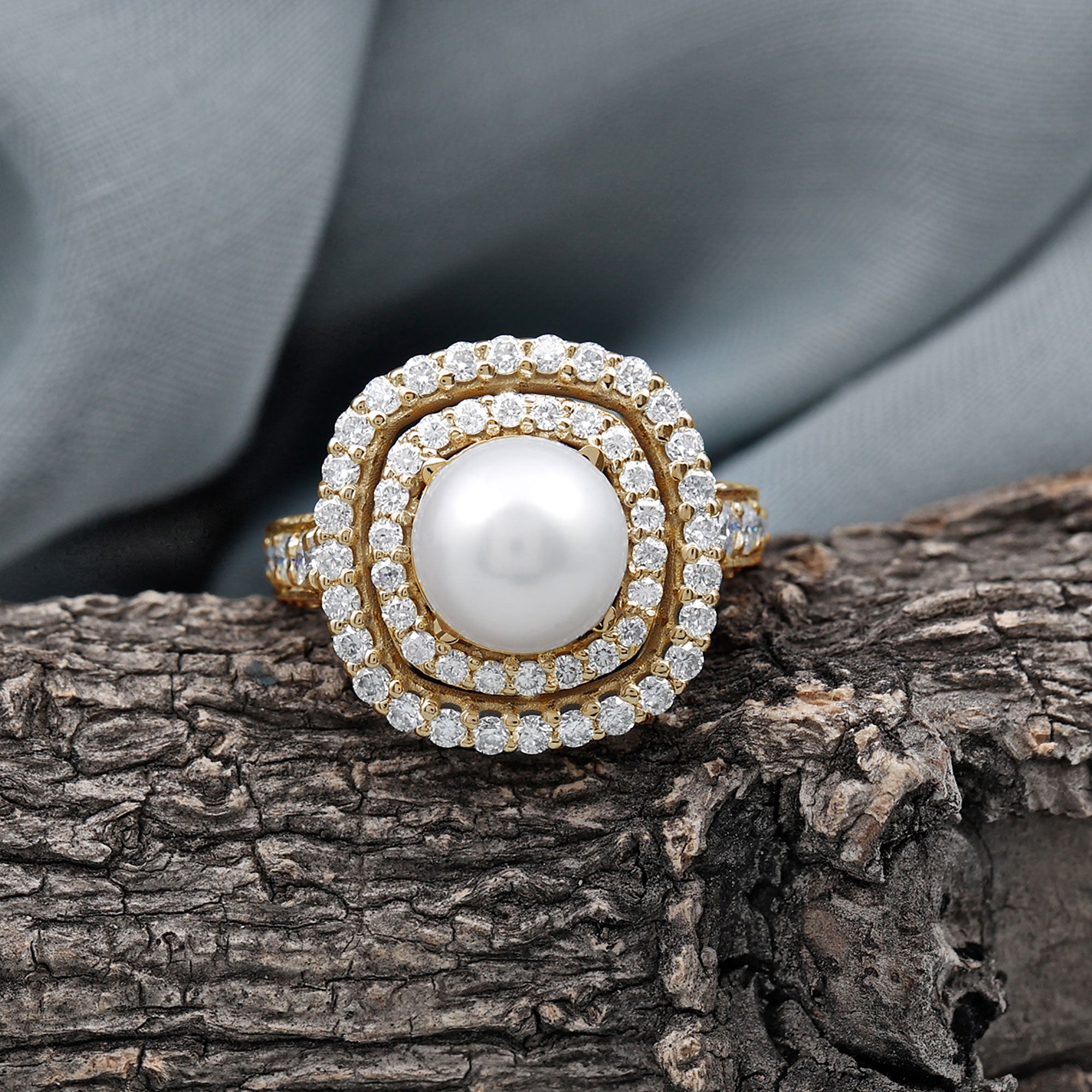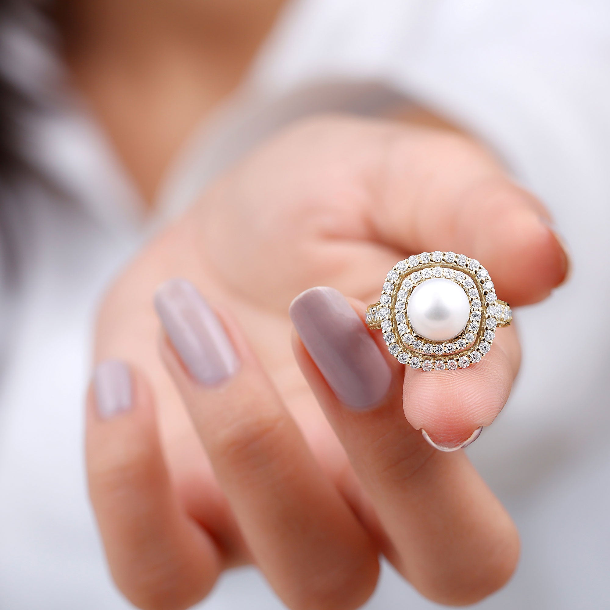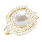 Round Freshwater Pearl and Moissanite Double Halo Engagement Ring