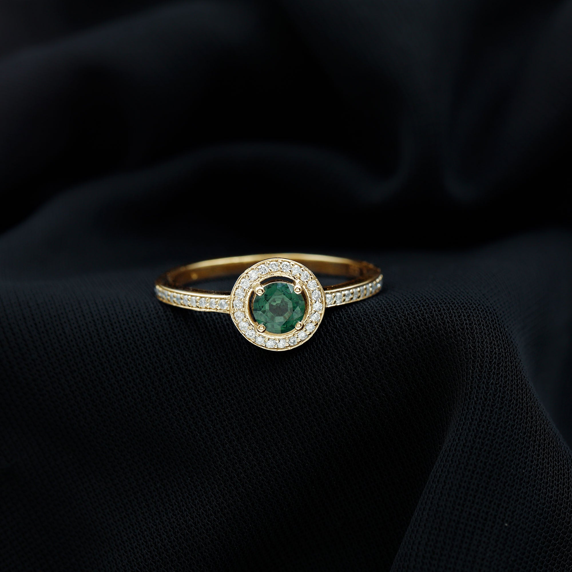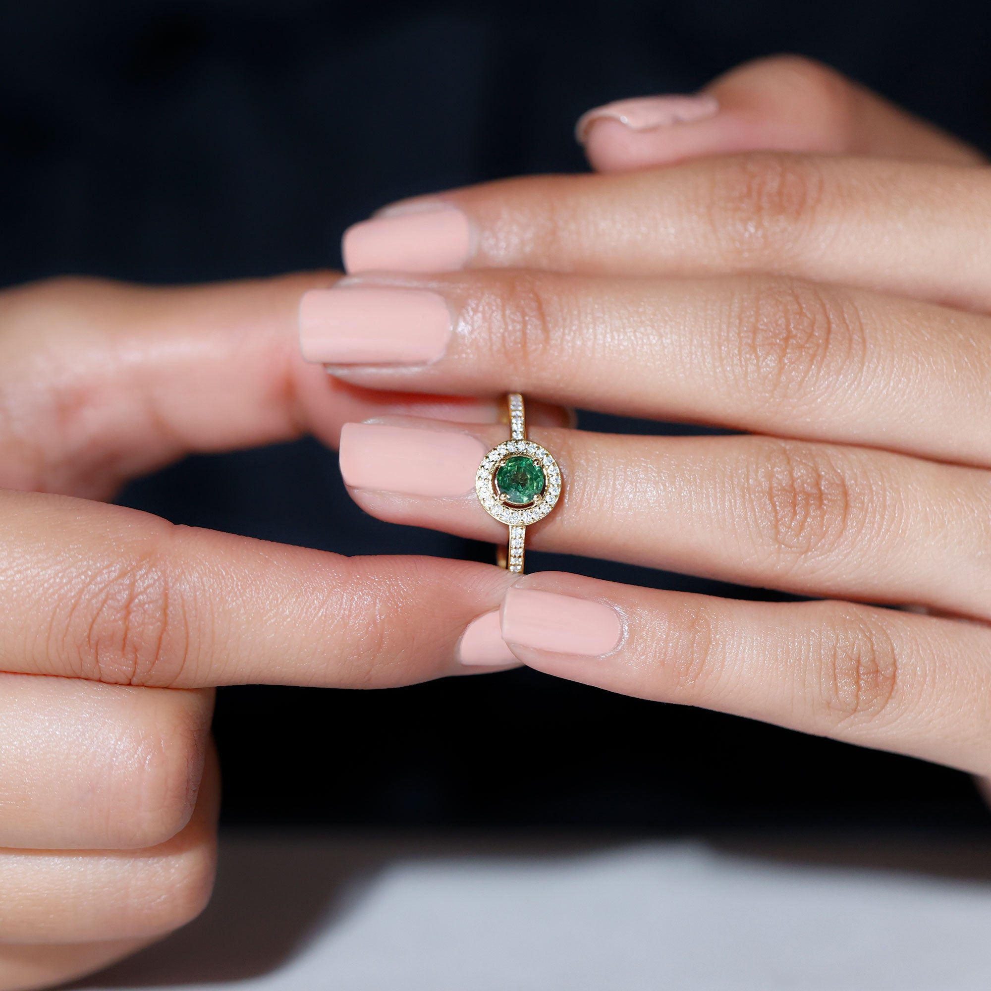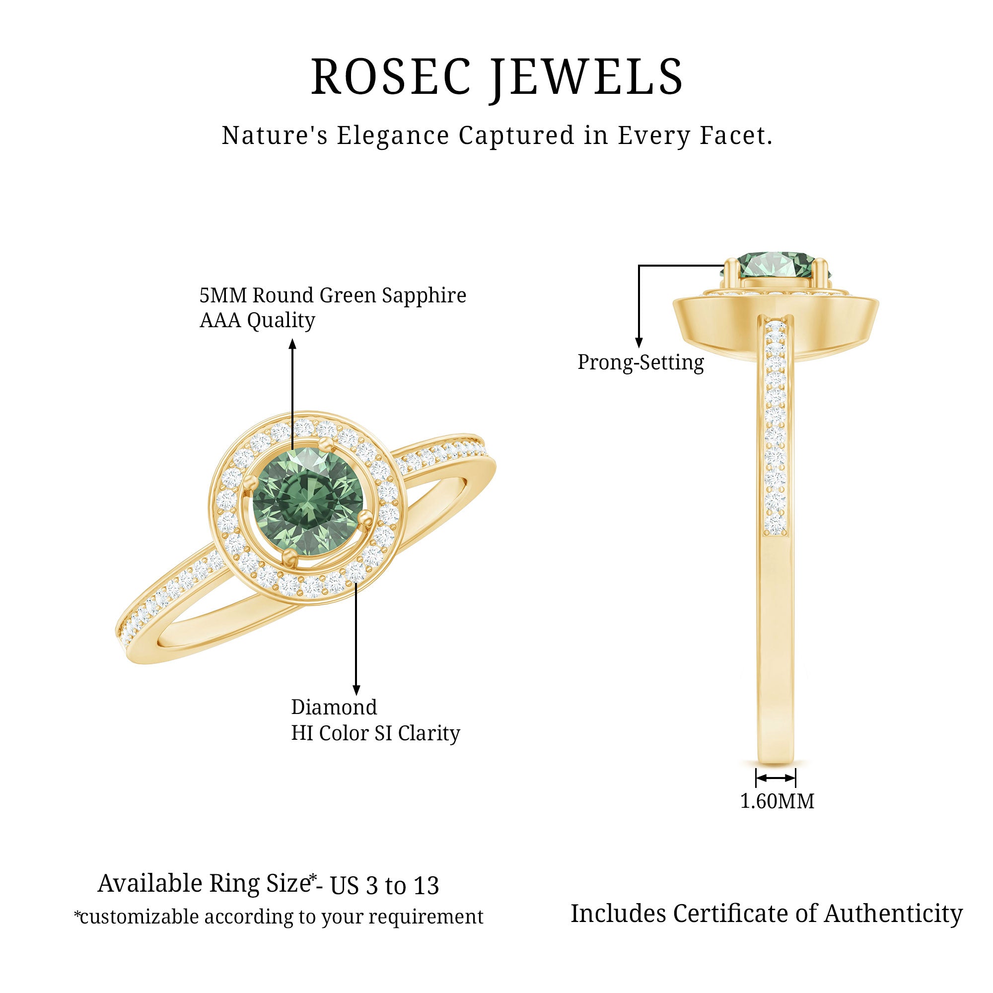 Experience the enchanting beauty of this Halo Engagement Ring. The stunning round green sapphire is embraced by a radiant Diamond floating halo, creating a captivating and ethereal allure. This ring is a true symbol of everlasting love and sophistication.
