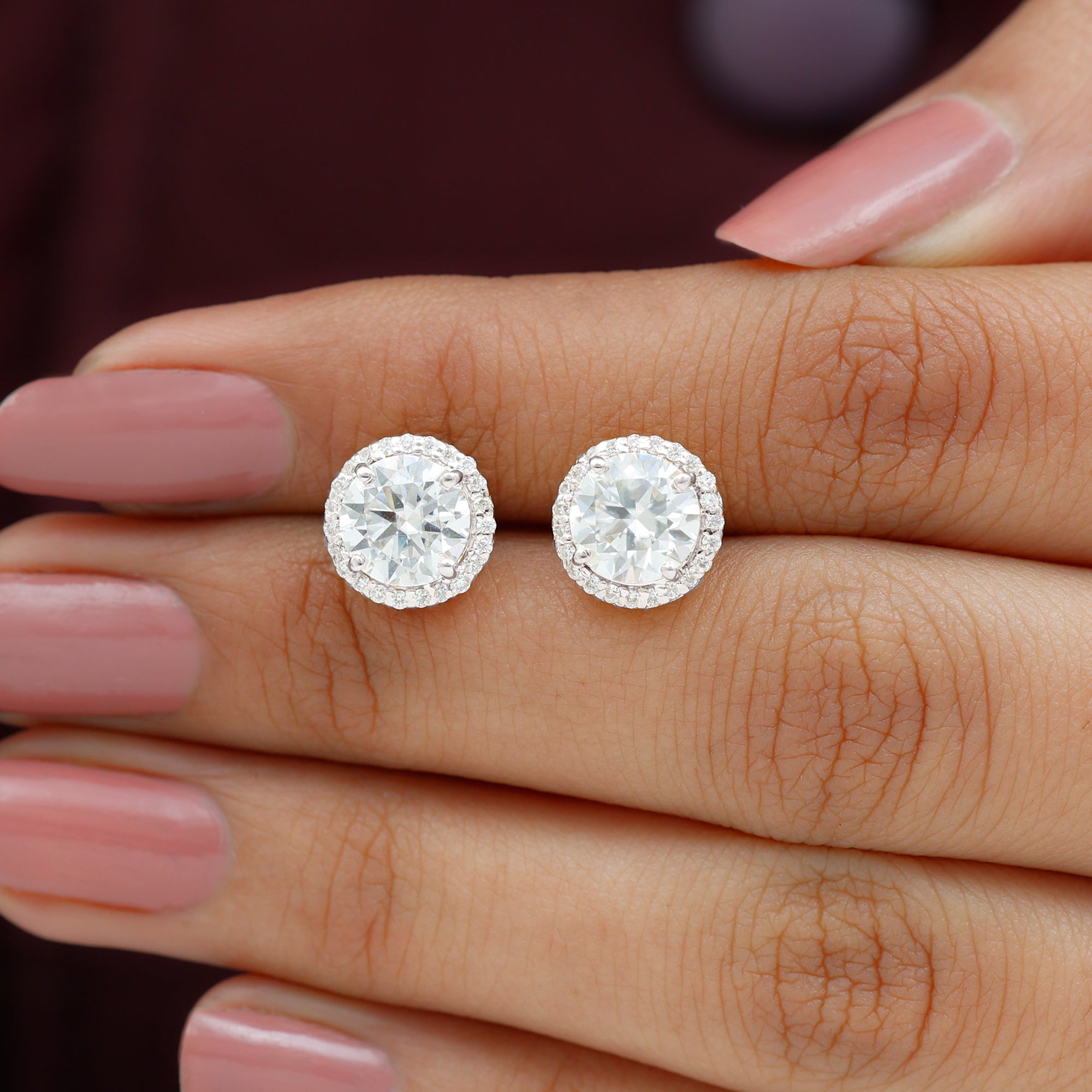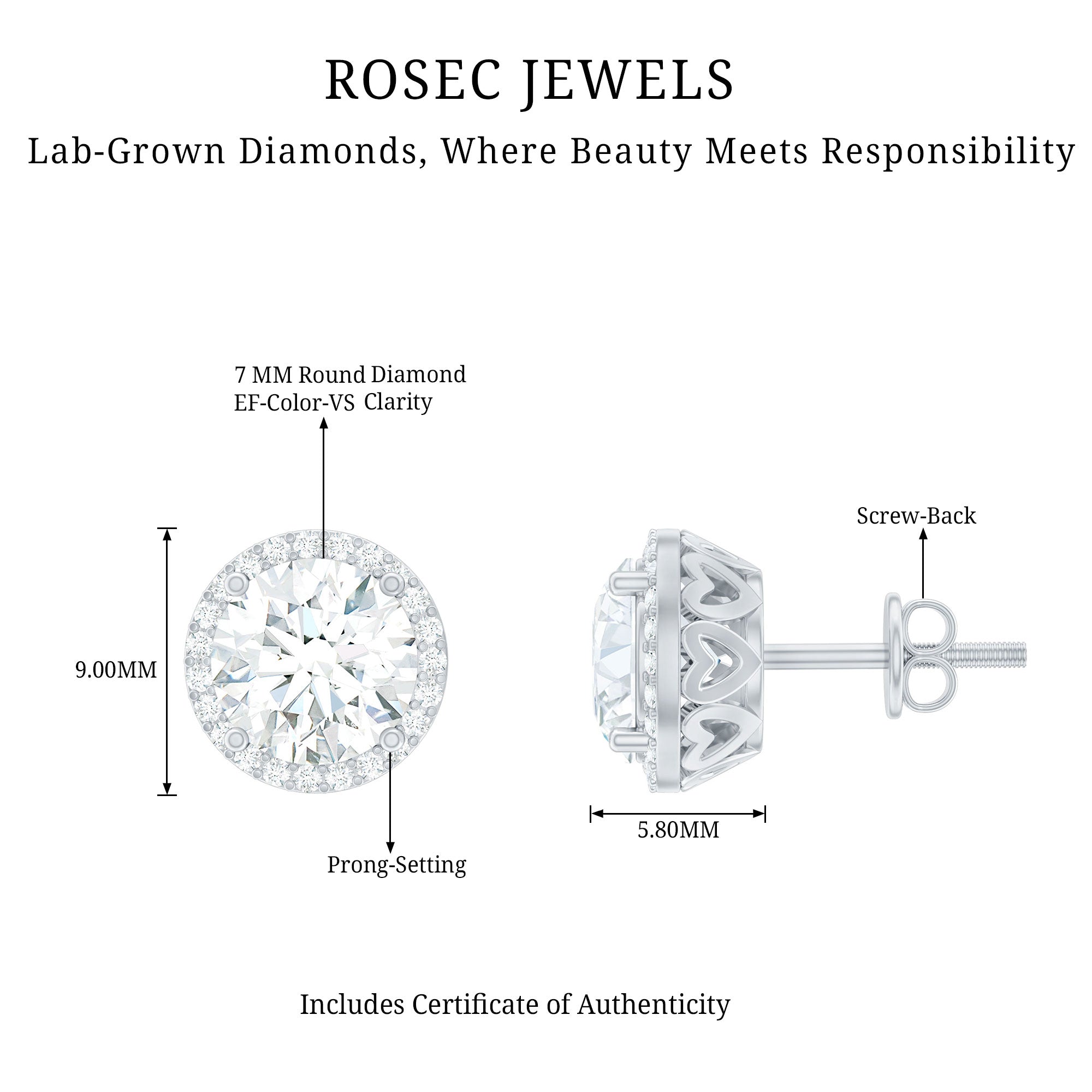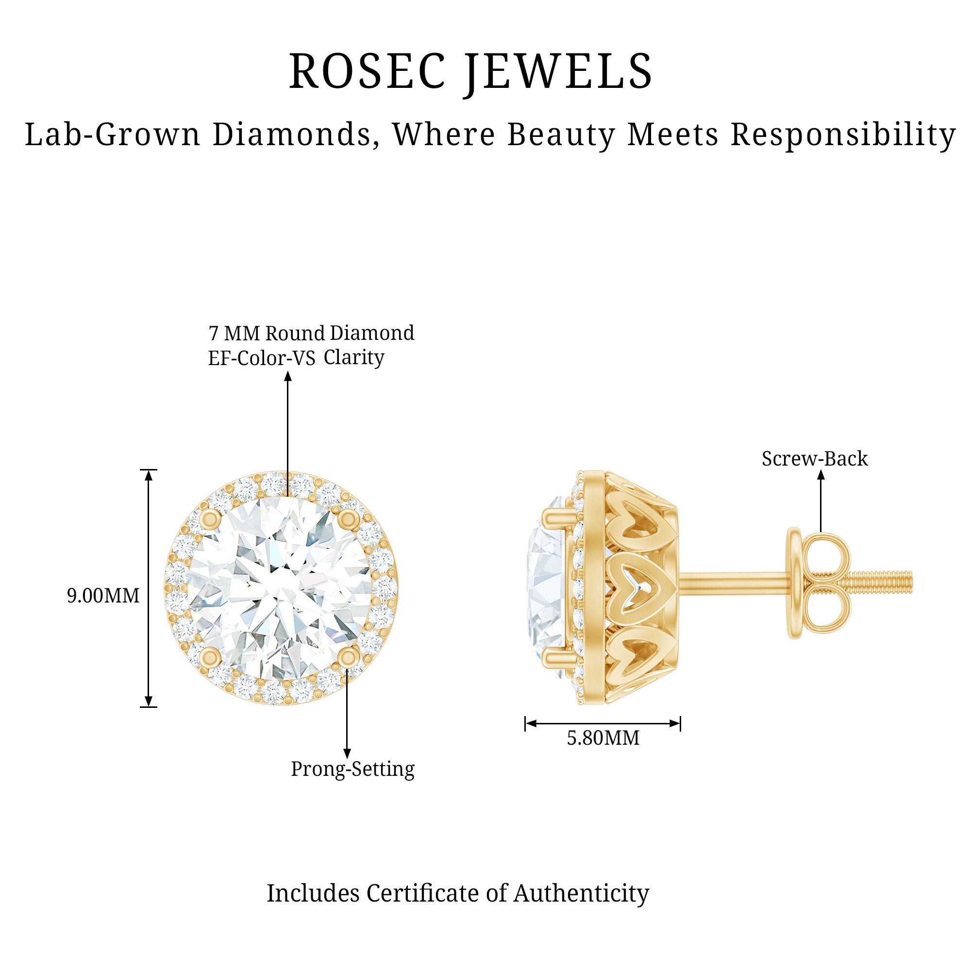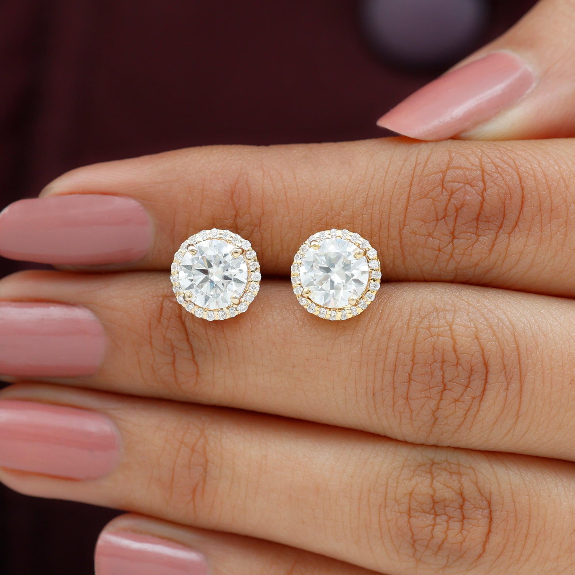 - Crafted from premium metal, these Halo Stud Earrings showcase 7 MM round cut lab grown diamonds encircled by a halo of gemstones.