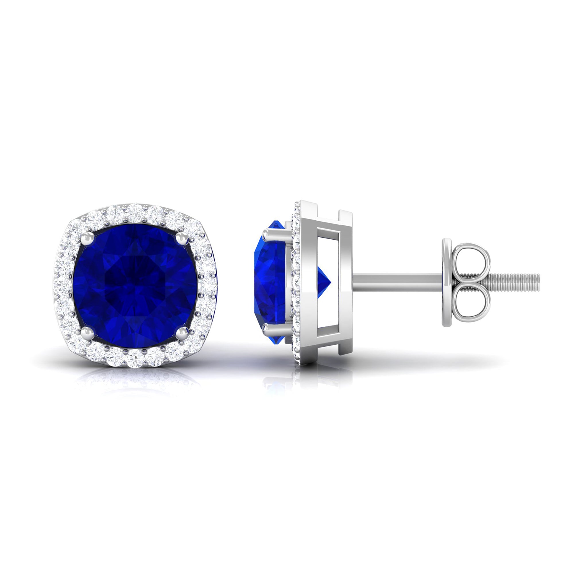 Add a touch of charm and sparkle to any outfit with these beautifully designed Lab Created Blue Sapphire Earrings, perfect for everyday wear or special occasions. They feature 6 MM round shaped lab created blue sapphire as a center stone set securely in 4-prong setting, surrounded by a halo of diamonds that enhance its brilliance. The halo design draws attention to the sapphire at the center, creating a delicate and elegant look that feels both modern and timeless. These Blue Sapphire and Diamond Earrings are lightweight and comfortable, making them easy to wear from morning to night. The screw-back closure ensures they stay safely in place without compromising on style. Ideal for layering with other jewelry or wearing alone for a subtle statement, these Halo Stud Earrings are versatile and chic. The combination of the AAAA quality lab created blue sapphire with sparkling HI-SI quality diamonds adds just the right amount of glamour. This pair comes with a certificate of authenticity and is carefully packed in a jewelry box, ready for gifting or for adding a special touch to your personal collection. Whether you are dressing up for a dinner, heading to work, or simply want to add a hint of elegance to your daily look, these Round Sapphire Earrings offer the perfect balance of sophistication and charm.