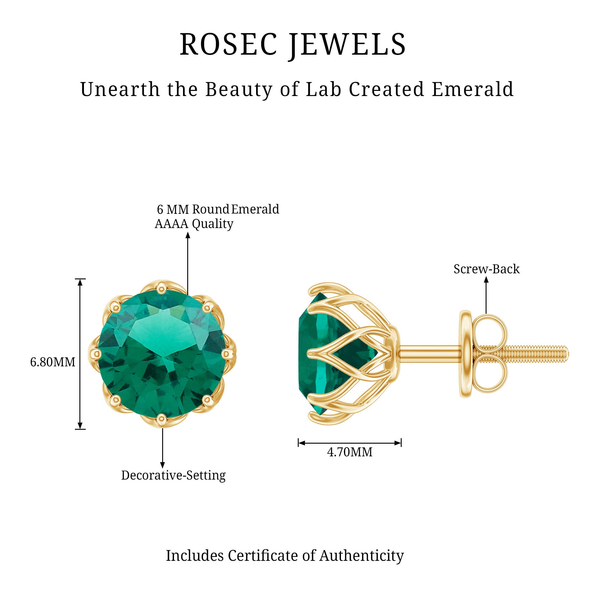 A touch of green elegance can brighten any day, and these Emerald Stud Earrings are the perfect example of timeless beauty and simplicity. Each earring features a 6 MM round cut lab created emerald, set in decorative setting that allows the stone to shine brilliantly from every angle. The simple design gives them a modern charm while keeping these Solitaire Emerald Earrings versatile enough to pair with any outfit. Whether you are dressing up for an evening out or keeping things casual, these Round Stud Earrings bring just the right amount of sparkle and color to your look. Crafted for comfort and durability, the Emerald Green Earrings come with secure screw back closures that ensure they stay safely in place all day long. Made with AAAA quality lab created emeralds, they offer stunning beauty in an ethical and eco-friendly way, giving you both elegance and peace of mind. Presented in a beautiful jewelry box, these Round Earrings are ready to gift for birthdays, anniversaries, or simply to treat yourself.