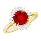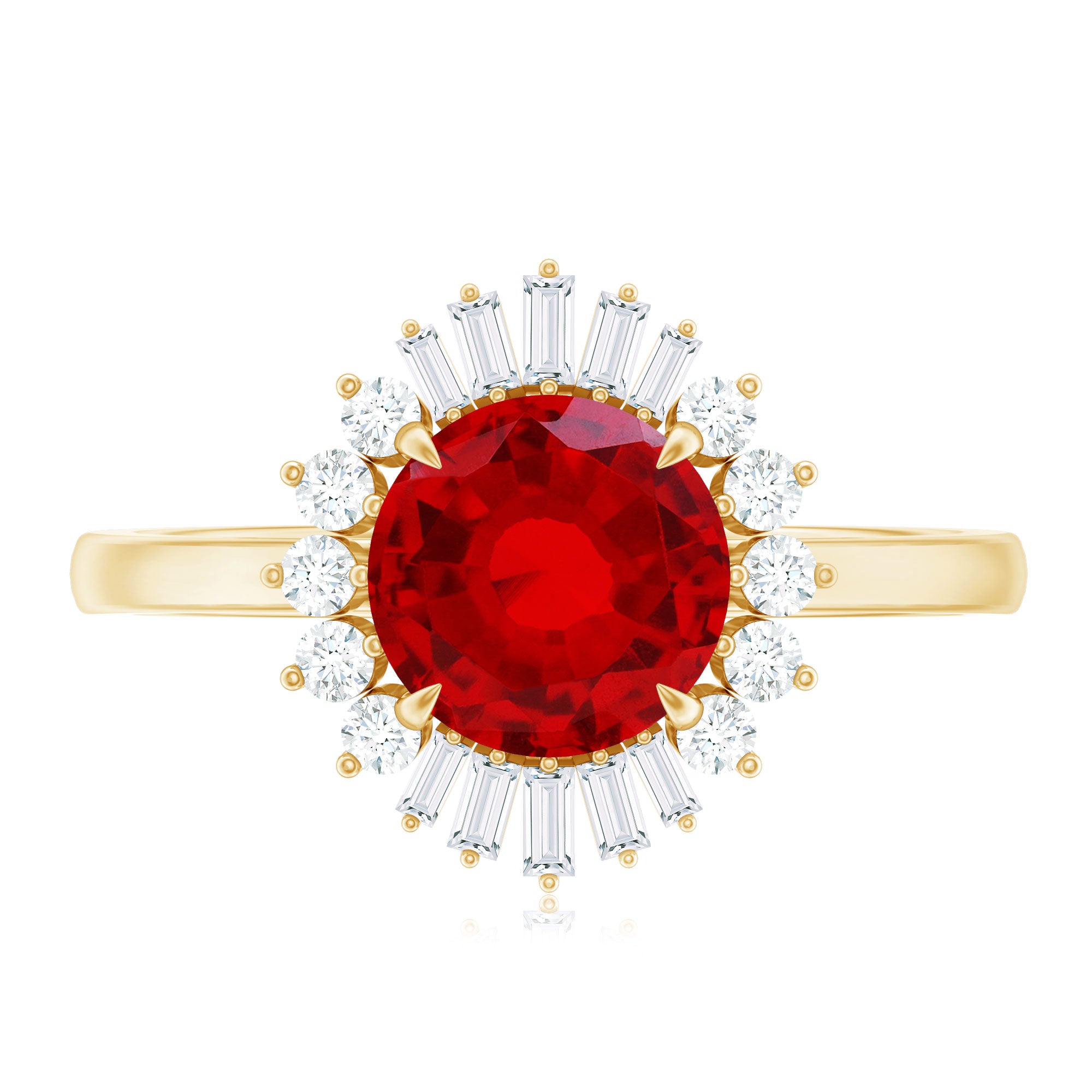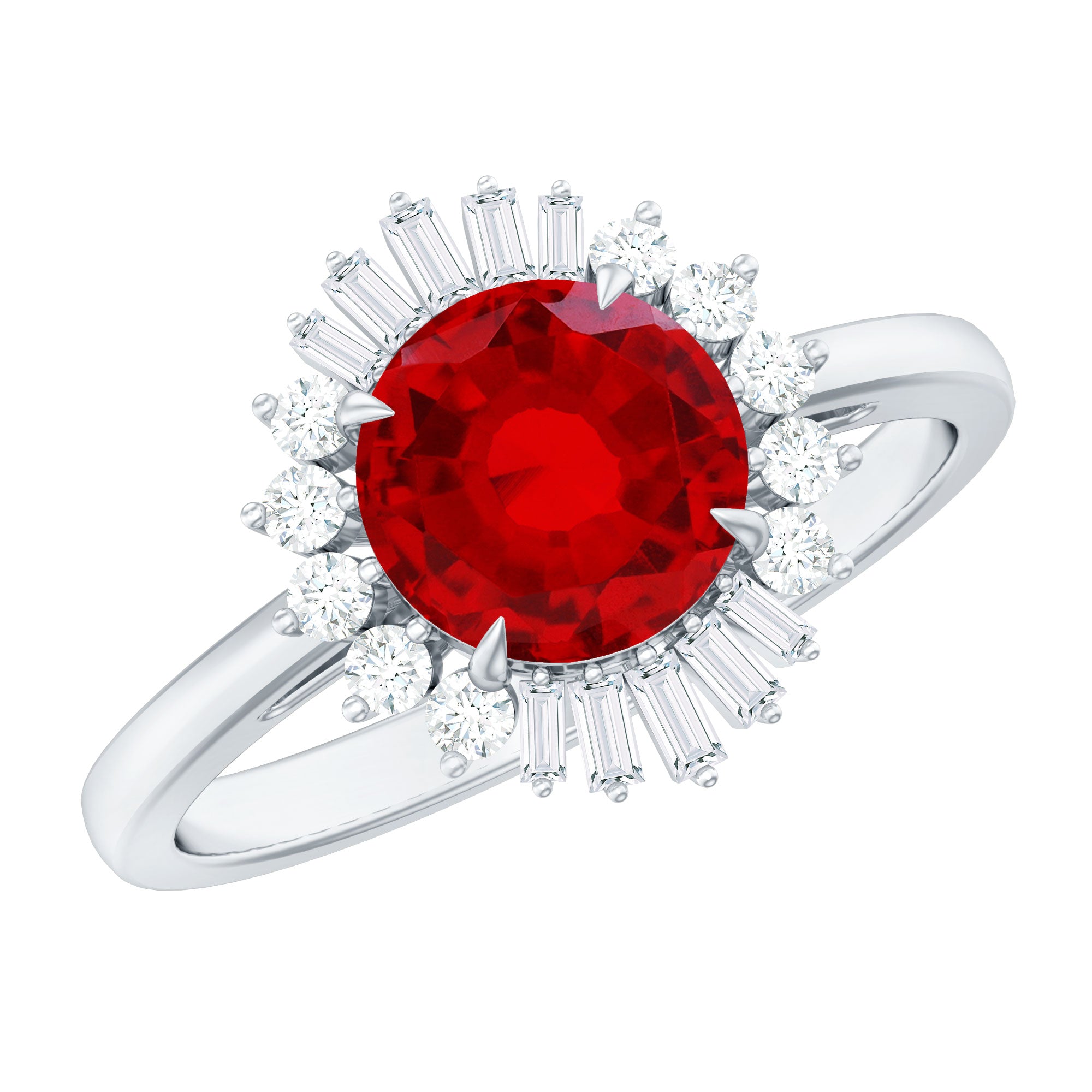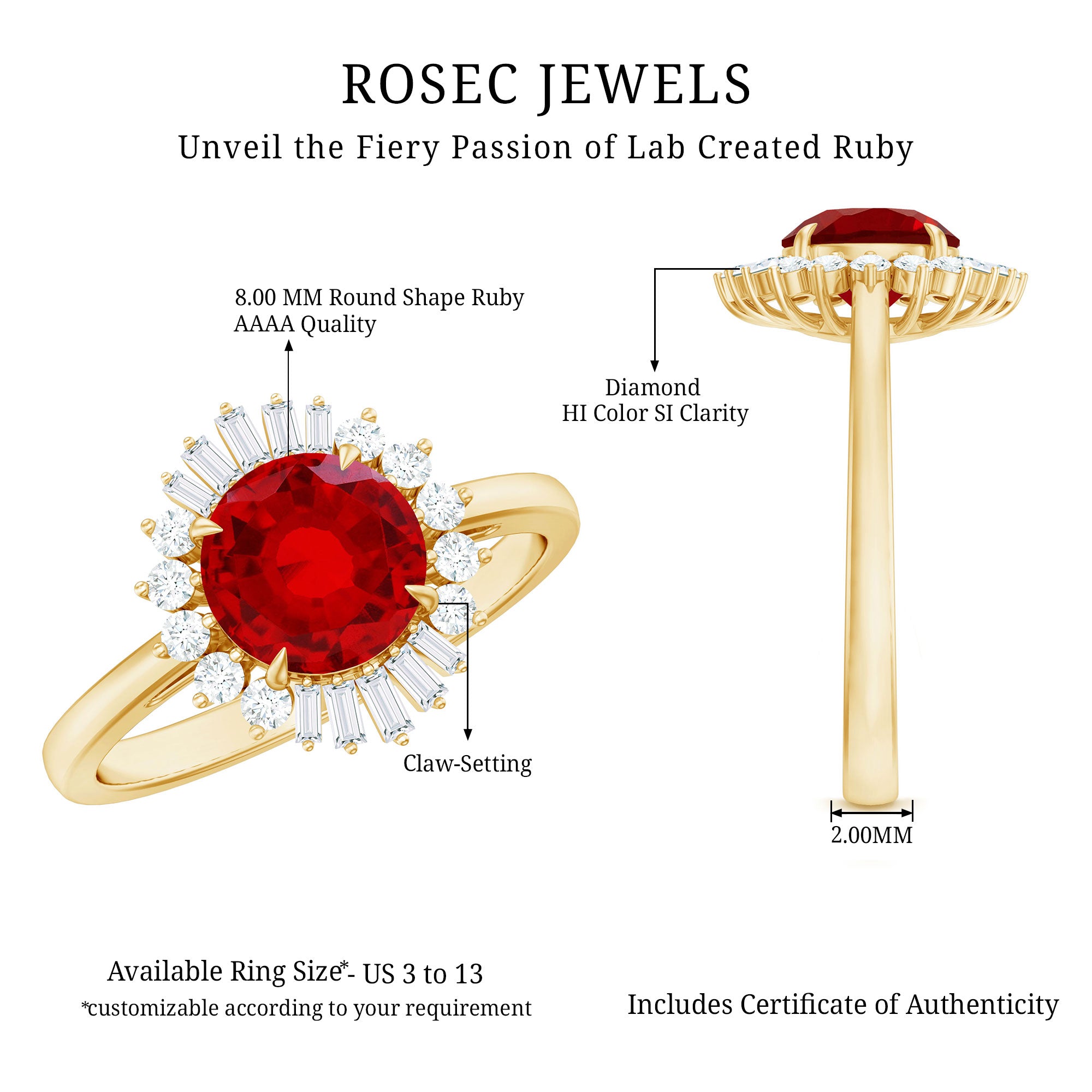 This stunning Lab Grown Ruby Engagement Ring is designed to catch everyone’s attention. It features an 8 MM round cut created ruby gemstone, beautifully set in secure claw setting. Surrounding the ruby is a dazzling halo of sparkling baguette and round cut Diamond stones that add extra brilliance and charm to the design. The combination of the rich red AAAA quality lab grown ruby and the bright HI-SI quality Diamonds creates a breathtaking contrast that makes this Halo Engagement Ring stand out. Every stone is carefully placed to reflect light perfectly, giving the Round Engagement Ring a glamorous and luxurious appearance from every angle. Crafted with precision and elegance, this Ruby and Diamond Ring is ideal for those who love timeless beauty with a modern twist. Its radiant colors and detailed craftsmanship make it a perfect choice for someone who values beauty, confidence, and individuality. Make a lasting impression with this exquisite Ruby Cocktail Ring, and let its brilliance speak for itself. With its combination of elegance, glamour, and classic charm, this ring is sure to become a favorite in your jewelry collection.