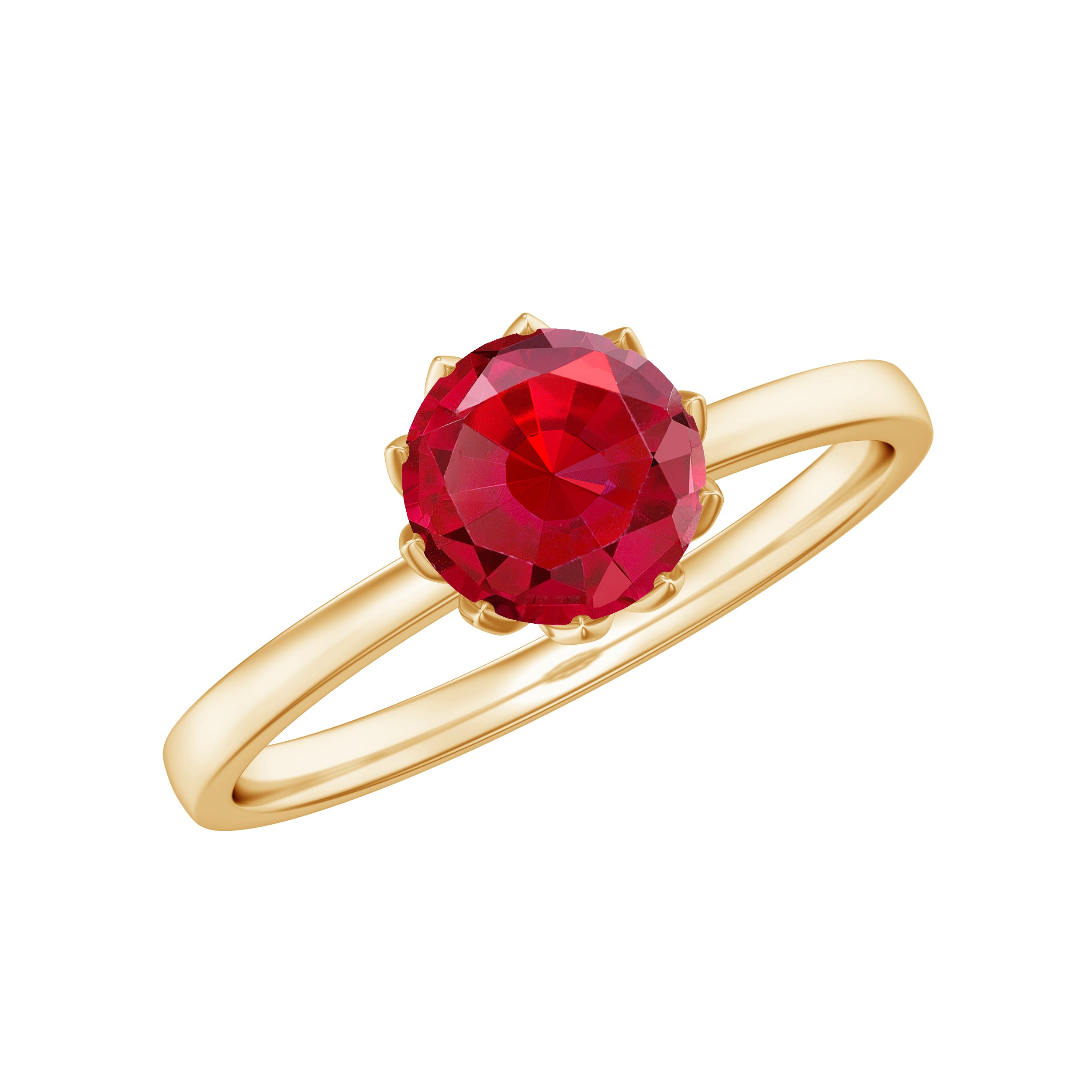 Fall in love with the stunning beauty of this Solitaire Ring, featuring a Round Shape Created Ruby set as a solitaire in a Lotus Basket Setting that gives an eye-catching sparkle. Crafted in Solid Gold, this Created Ruby Solitaire Ring is absolutely breathtaking and will add a touch of elegance to any outfit.