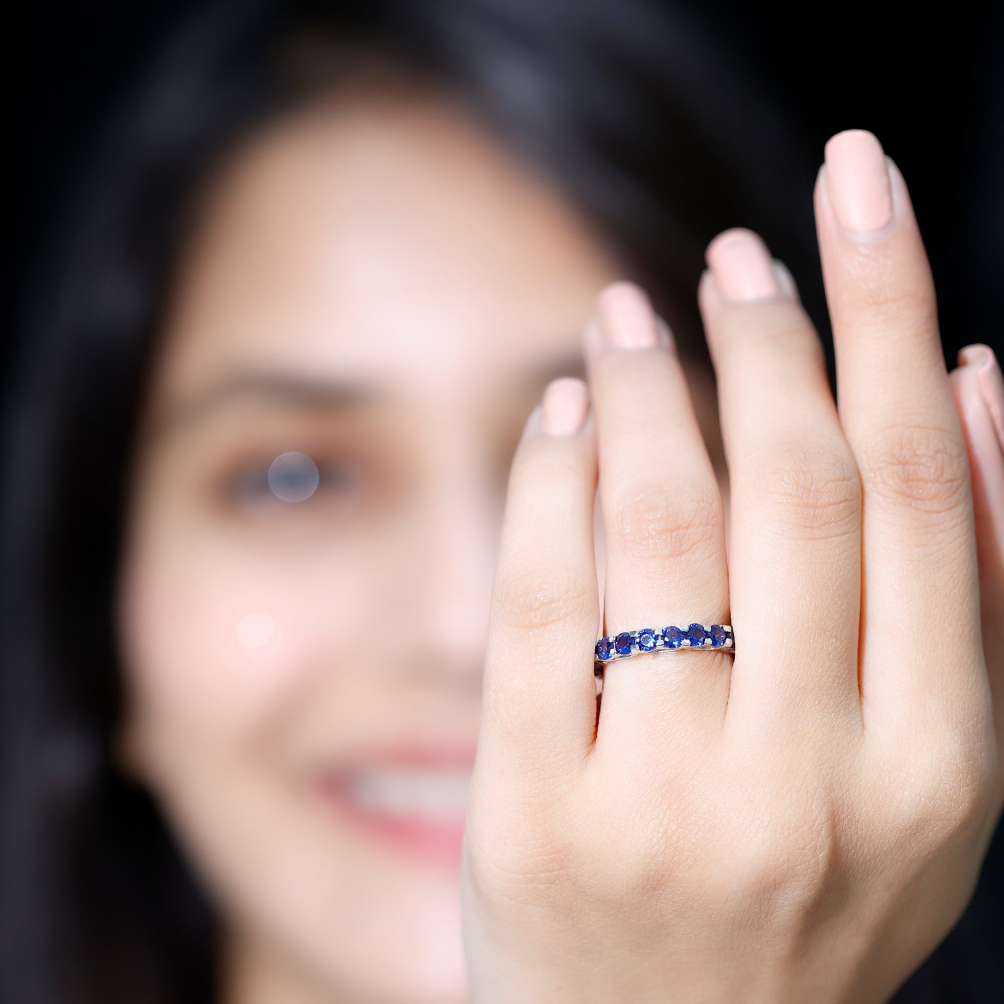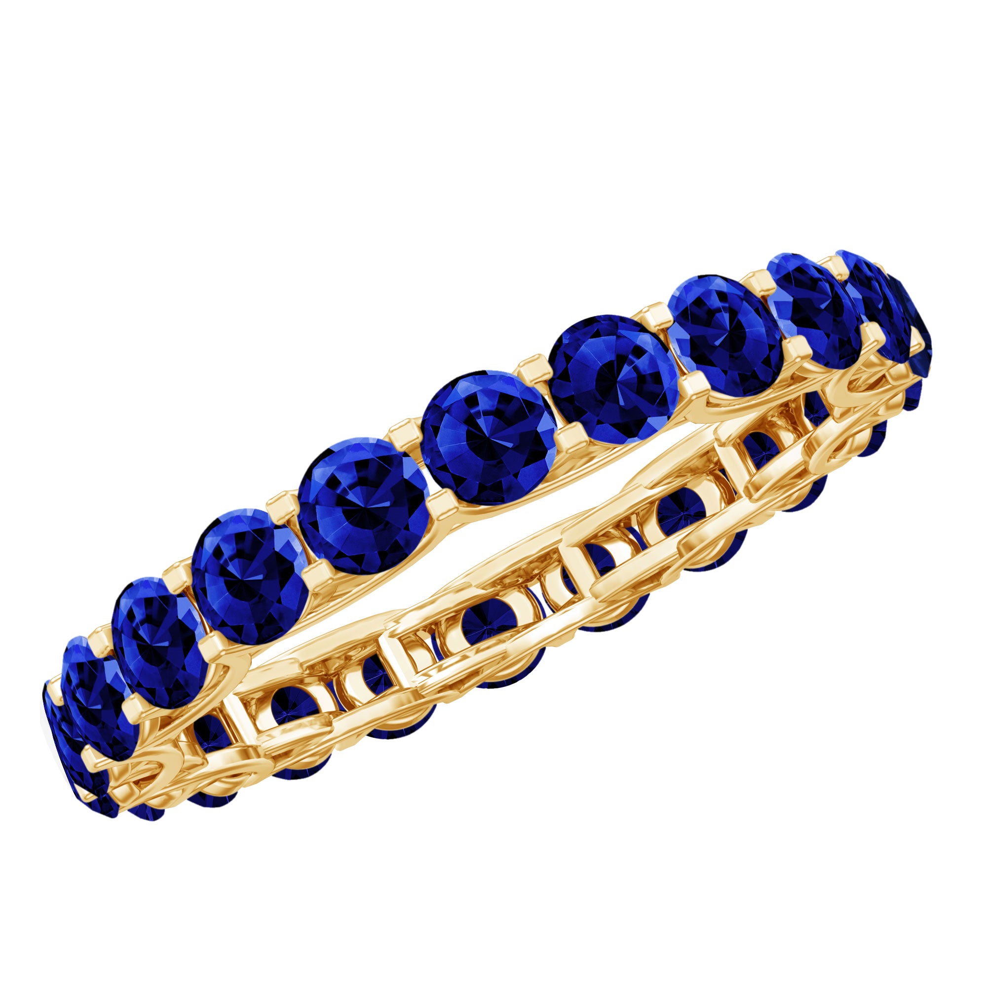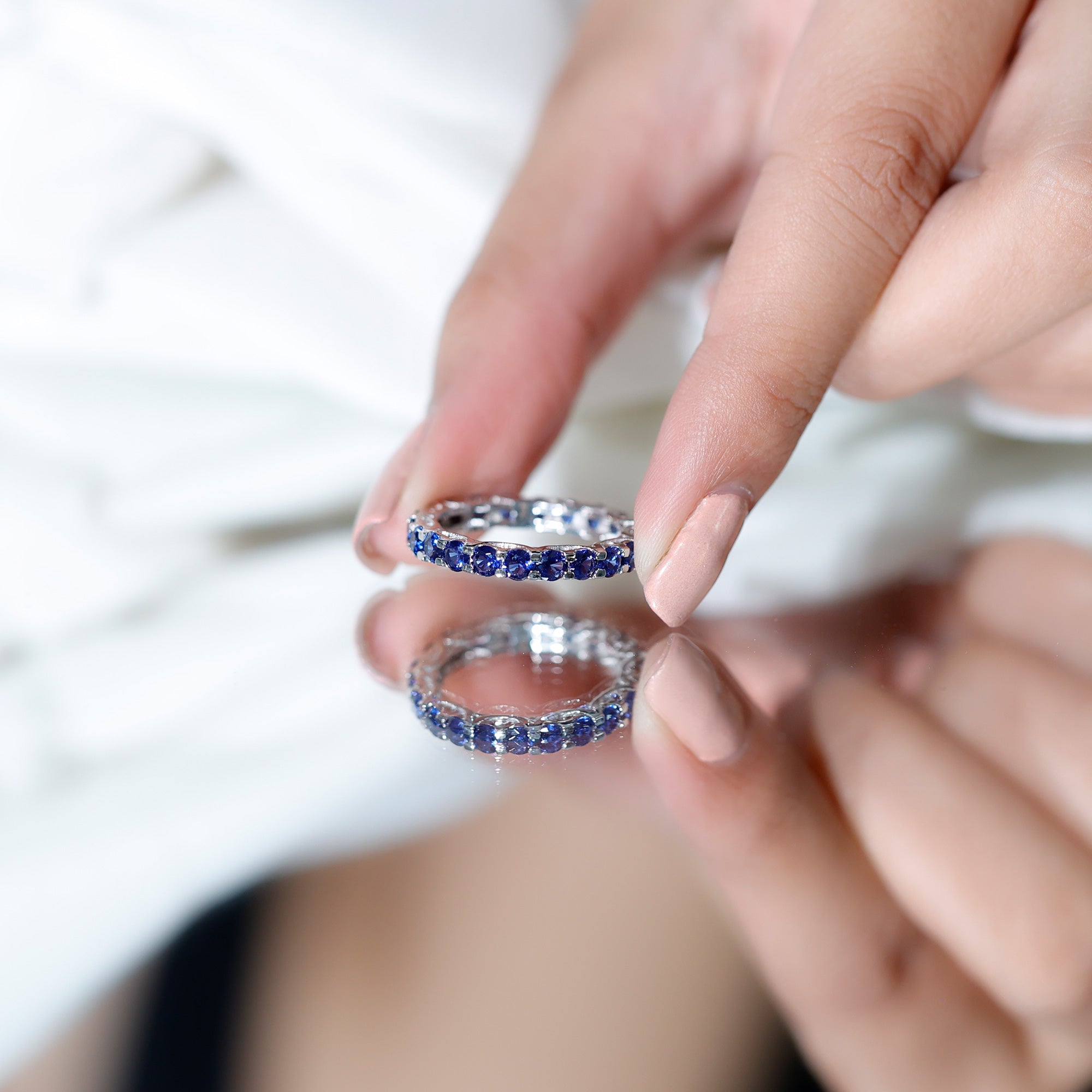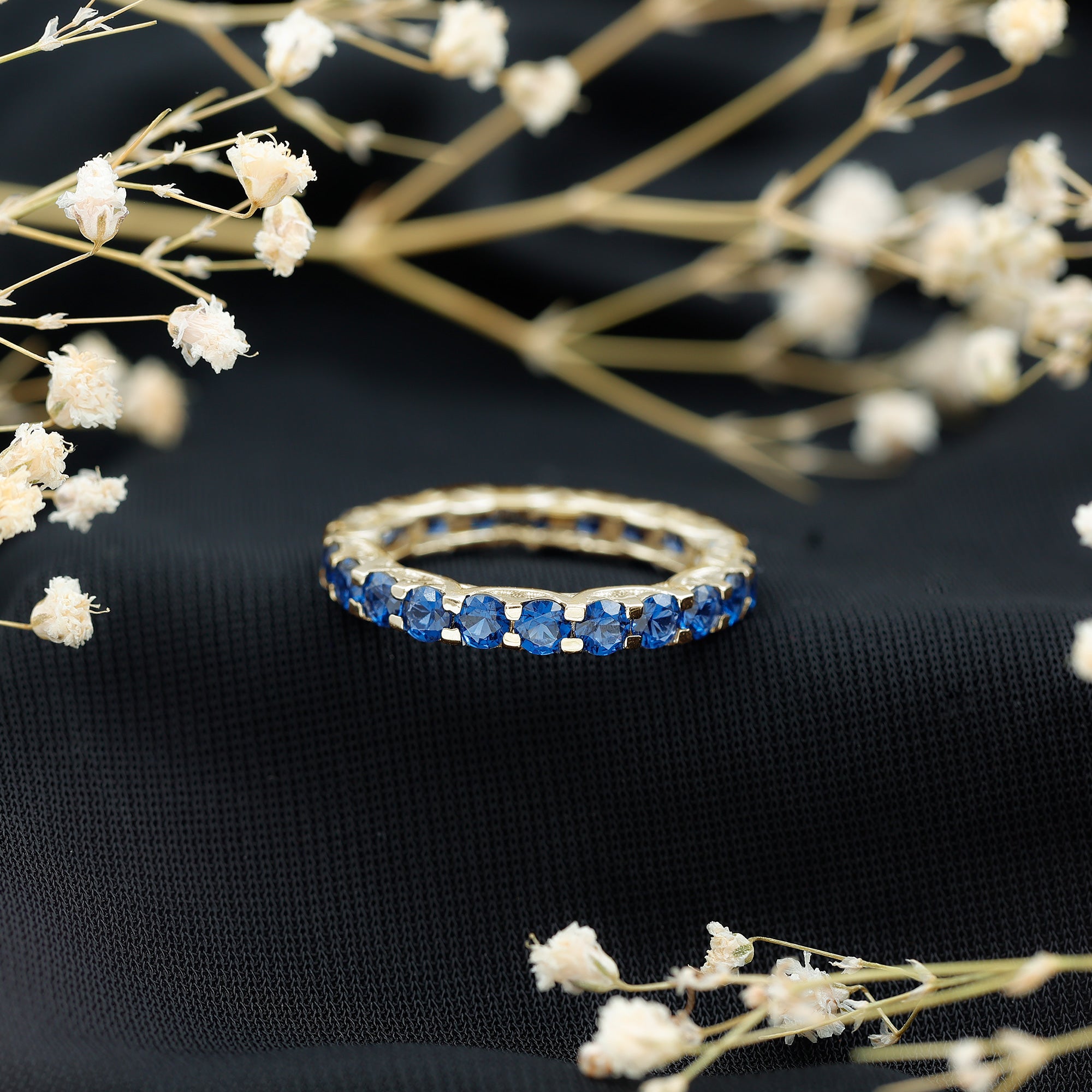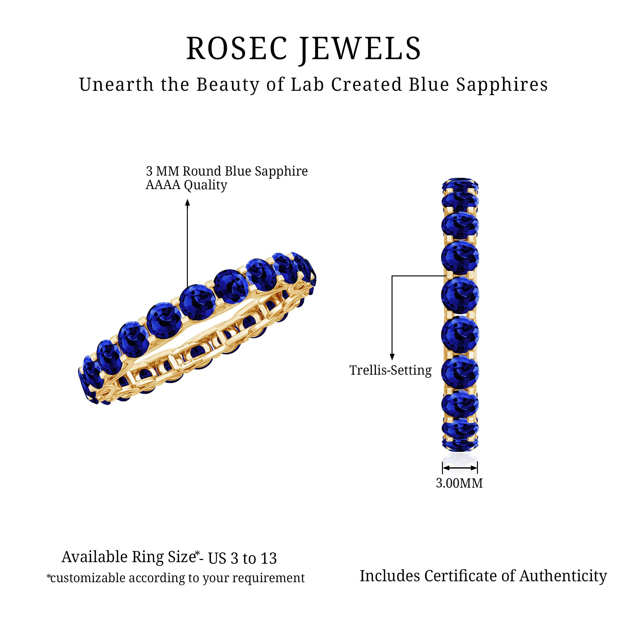 Presenting to you, a token of love as classic as your love story - our exquisite Created Blue Sapphire Eternity Ring! It features a continuous row of Round Shape Created Blue Sapphire gemstones elegantly showcased in a secure Trellis Setting. Whether paired with everyday outfits or formal attire, this Full Eternity Ring complements any look with grace and style. Each gemstone in this Certified Created Sapphire Ring boasts premium color and clarity grades, ensuring its enduring beauty, just like the everlasting love it represents.