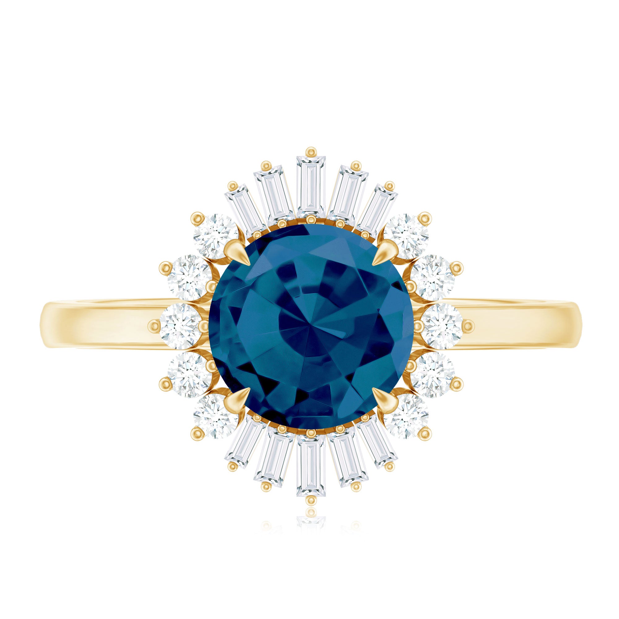 This exquisite London Blue Topaz Engagement Ring is crafted to capture the attention of all. It showcases an 7 MM round shape london blue topaz gemstone, elegantly set in a secure claw setting. Encircling the natural blue topaz is a stunning halo of shimmering baguette and round cut Diamond stones that enhance the designs brilliance and allure. The pairing of the deep blue AAA quality london blue topaz with the luminous HI-SI quality Diamonds produces a striking contrast that ensures this Halo Engagement Ring is truly distinctive. Each stone is meticulously arranged to reflect light flawlessly, providing the Round Engagement Ring with a glamorous and opulent look from every perspective. Designed with precision and sophistication, this Blue Topaz and Diamond Ring is perfect for those who appreciate timeless elegance with a contemporary flair. Its vibrant colors and intricate craftsmanship make it an ideal selection for anyone who cherishes beauty, confidence, and uniqueness. Create a memorable impression with this stunning Blue Topaz Cocktail Ring, allowing its radiance to convey its charm. With its blend of elegance, glamour, and classic appeal, this ring is destined to become a cherished piece in your jewelry collection.