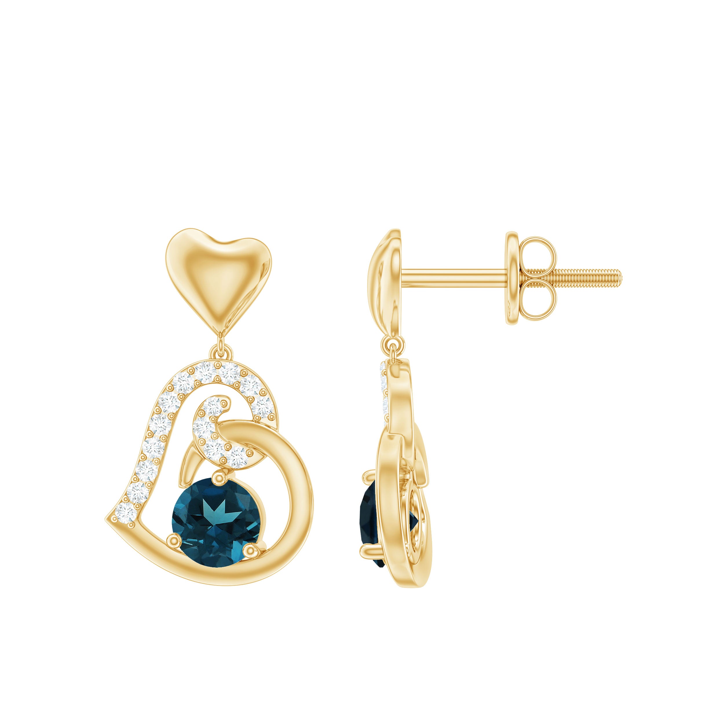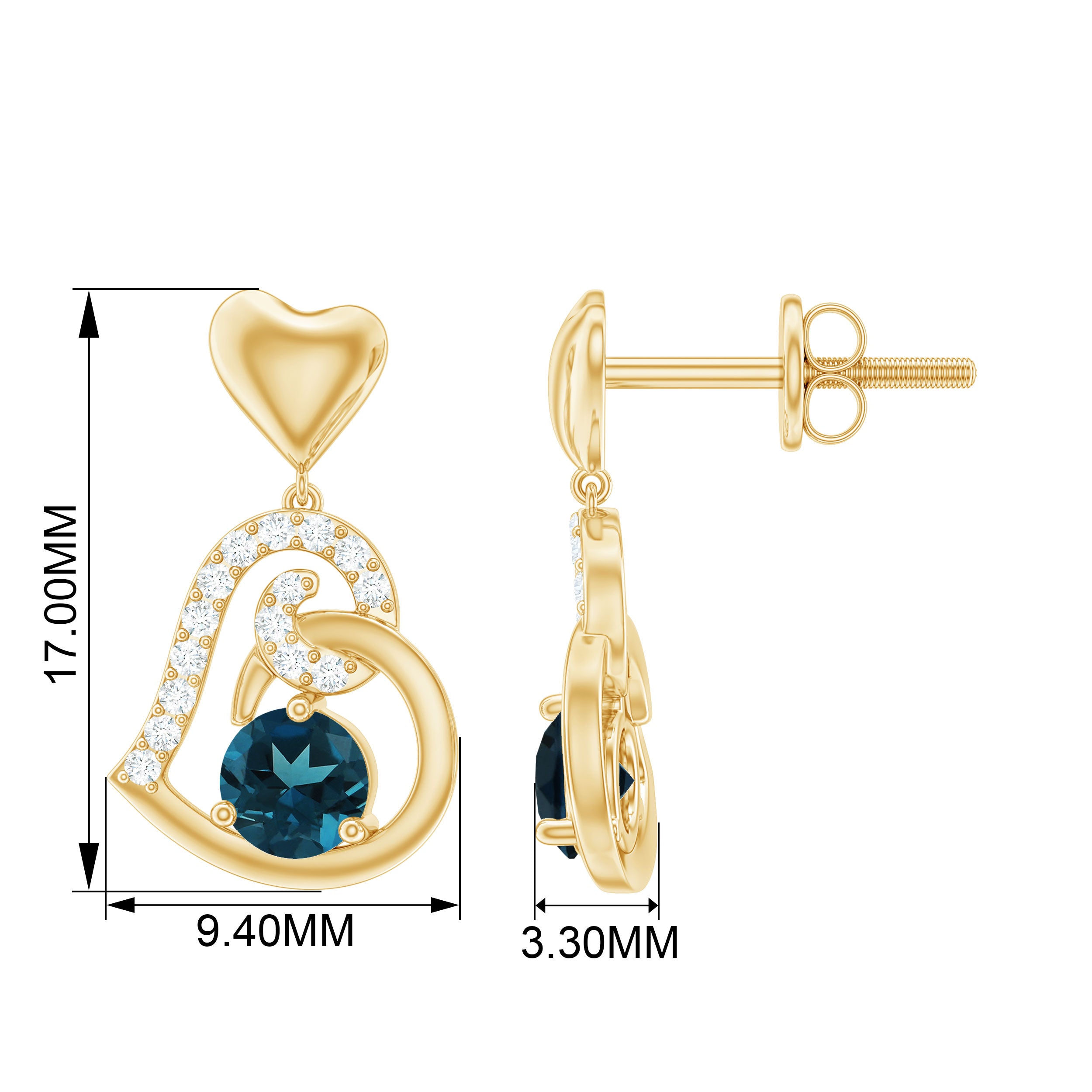 Make a stunning impression with these heart-shaped drop earrings. Adorned with round-shaped London Blue Topaz and Diamond, these earrings will add a touch of elegance to any outfit. The London Blue Topaz adds a beautiful, vibrant color to the design, making it a perfect choice for any occasion.