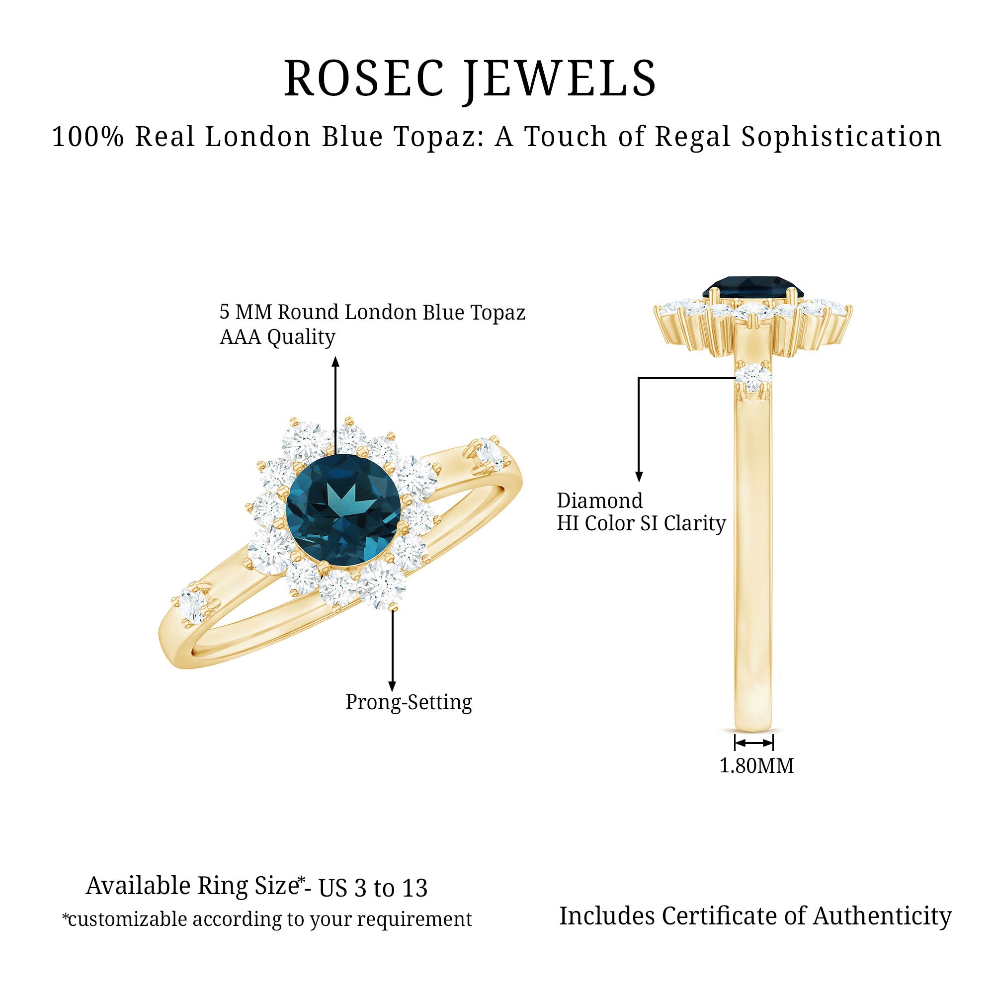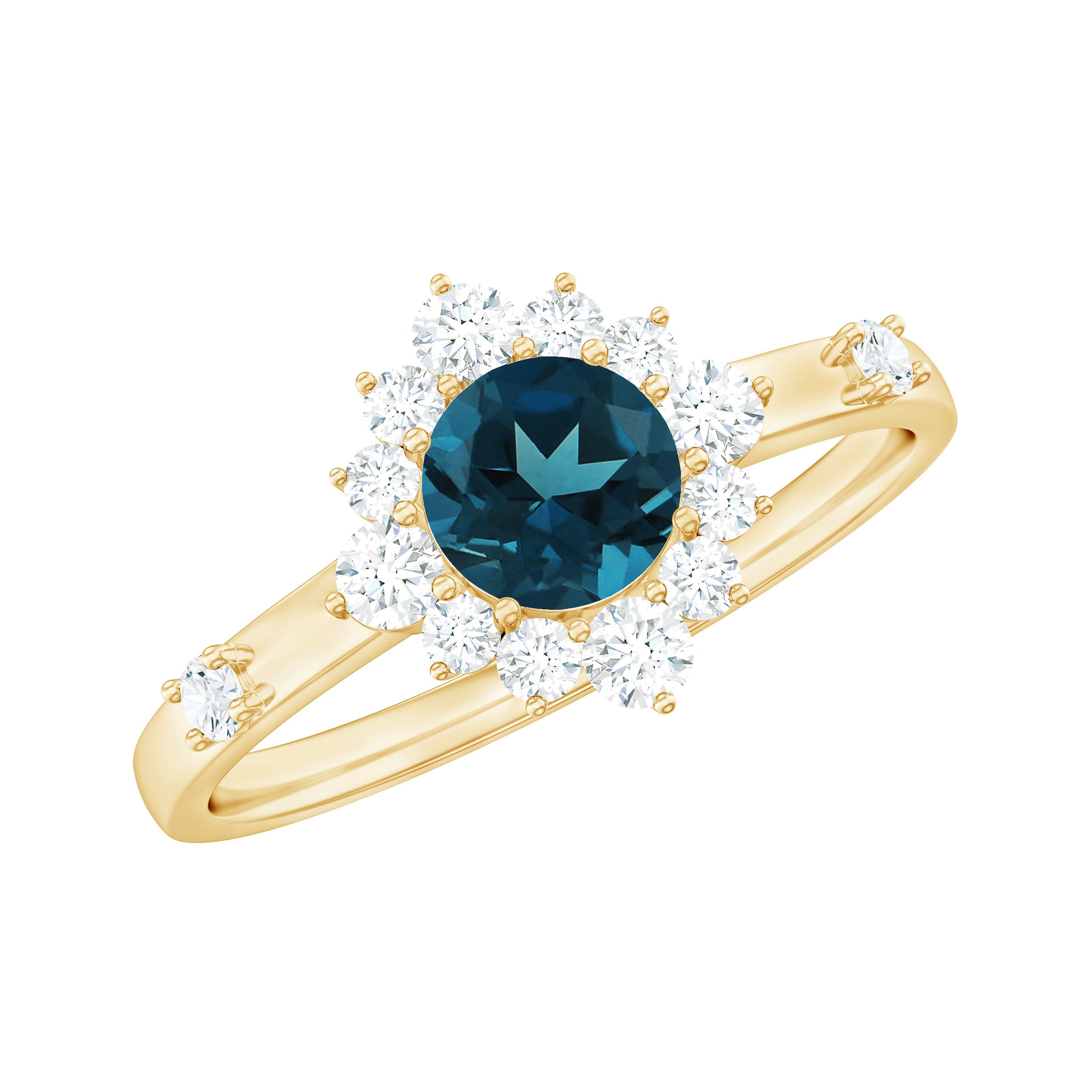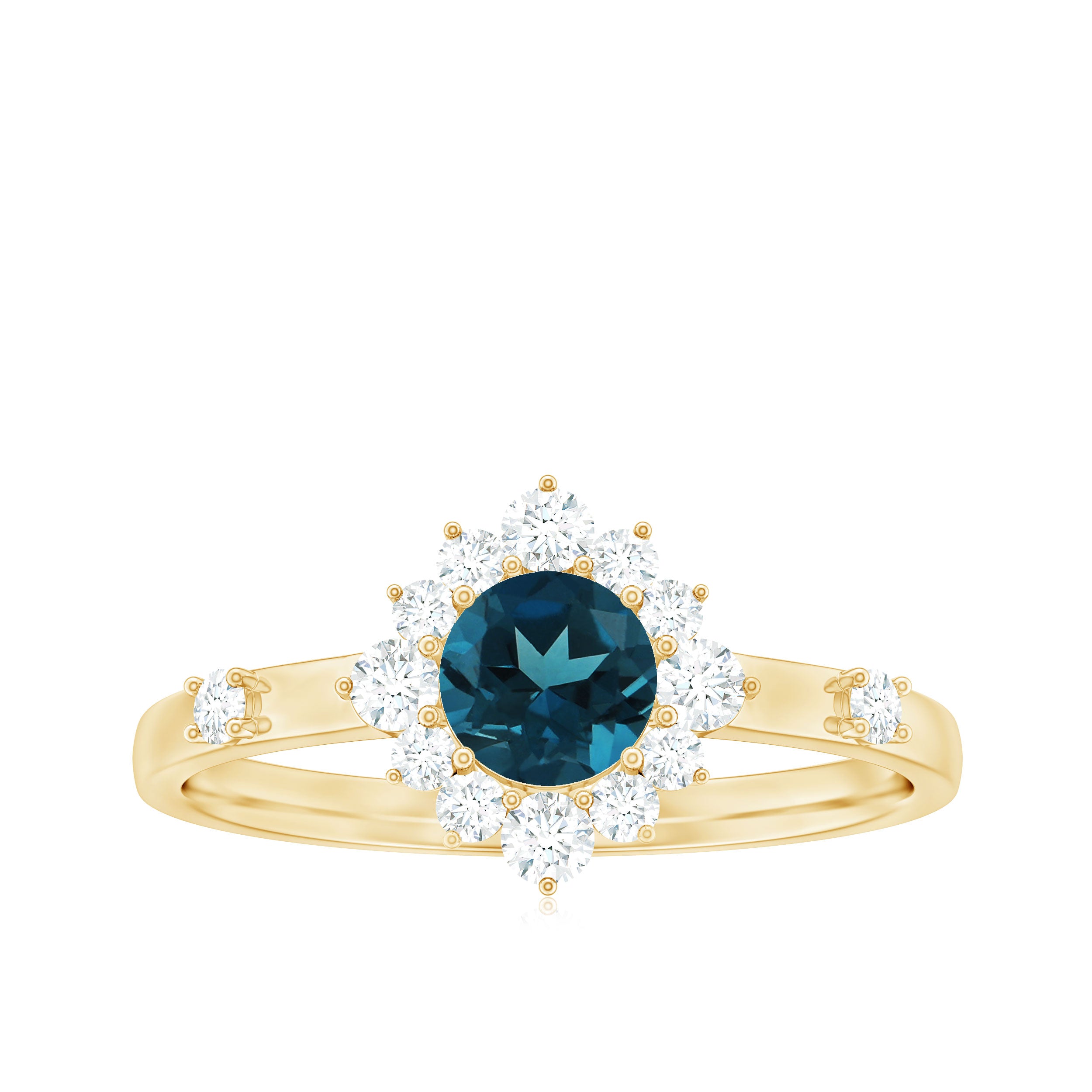 Promise a love that endures eternally with this exquisite London Blue Topaz Promise Ring, a piece that conveys heartfelt emotions. At its core lies a 5 MM round cut london blue topaz, radiating beautifully in a secure prong setting. Encircling the central stone is a dazzling diamond halo that enhances its brilliance and accentuates the topaz allure. Two additional stones are set along the shank, imparting a graceful sparkle to the Blue Topaz and Diamond Ring that captures light from every perspective. This Natural London Blue Topaz Ring is meticulously crafted, merging timeless elegance with a contemporary aesthetic. The intricate detailing and superior finish provide it with a luxurious yet everlasting appeal that transcends trends. Thoughtfully designed to convey profound feelings, this Halo Engagement Ring represents more than mere adornment; it embodies a promise, a cherished memory, and an enduring bond. Whether donned daily or reserved for special moments, it serves as a reminder of the love and significance it embodies. Elegant, significant, and imbued with warmth, this Blue Topaz Halo Ring will forever remain close to the heart.