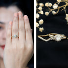 Romance and elegance come together beautifully in this Moissanite Bridal Ring Set. The set features a unique bypass engagement ring, designed to wrap gracefully around your finger. At its center sits a 4 MM round brilliant cut moissanite, sparkling brightly in secure prong setting. A halo of smaller round moissanite stones surrounds the center stone, adding extra shine and glamour. The bypass band itself is also decorated with moissanite stones, creating a seamless and dazzling look. A matching curved wedding band completes the Moissanite Engagement Ring Set, designed to hug the ring perfectly. Together, they form a Stackable Wedding Ring Set that looks elegant whether worn alone or paired with other rings. Crafted with careful attention to detail, this Engagement Ring and Wedding Band Set combines modern design with timeless charm. Comfortable to wear and designed to last, the rings are ideal for everyday elegance as well as formal occasions. Every angle of the Halo Bridal Set reflects light beautifully, creating a brilliant shine that will be noticed wherever you go.