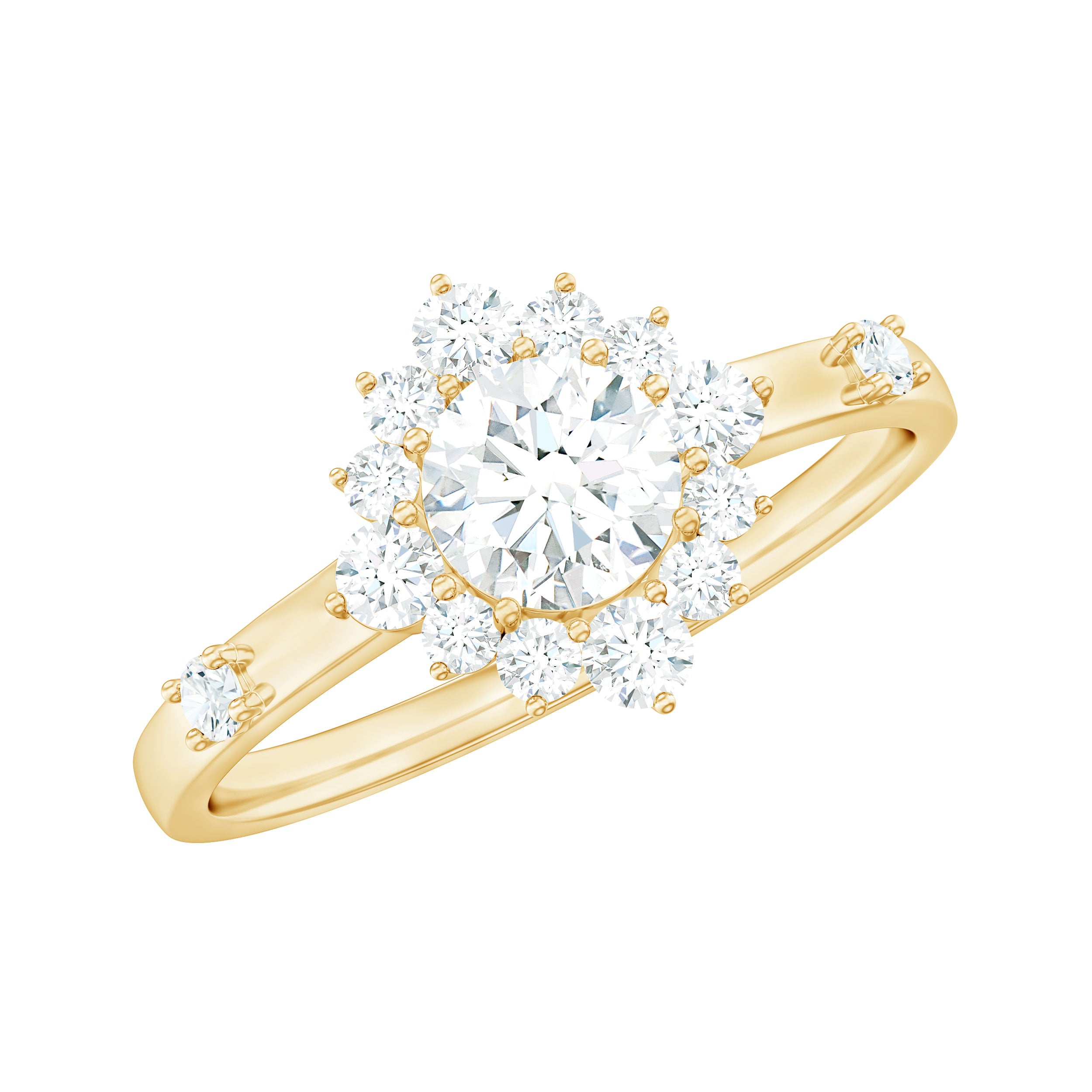 Mark the beginning of your forever with this beautiful Moissanite Halo Engagement Ring. Designed to celebrate true love, this ring features a 5 MM round cut moissanite at the center, held securely in prong setting. A sparkling halo of smaller moissanite stones surrounds the center gem, enhancing its brilliance and giving the Round Engagement Ring a timeless, elegant look. Adding to its charm, the band shows two round cut moissanite stones, one on each side of the center, creating a balanced and graceful design. The slim band offers a comfortable fit, making it perfect for everyday wear. Made for those who value both beauty and ethics, this Round Moissanite Engagement Ring uses a sustainable and eco-friendly gemstone that shines just like a diamond. With its classic design and radiant sparkle, this Classic Engagement Ring is available in US sizes 3 to 13 to ensure the perfect fit. It comes in an elegant jewelry box, making it ready for that unforgettable moment. Let this ring be the symbol of your love, brilliant, lasting, and full of heart.