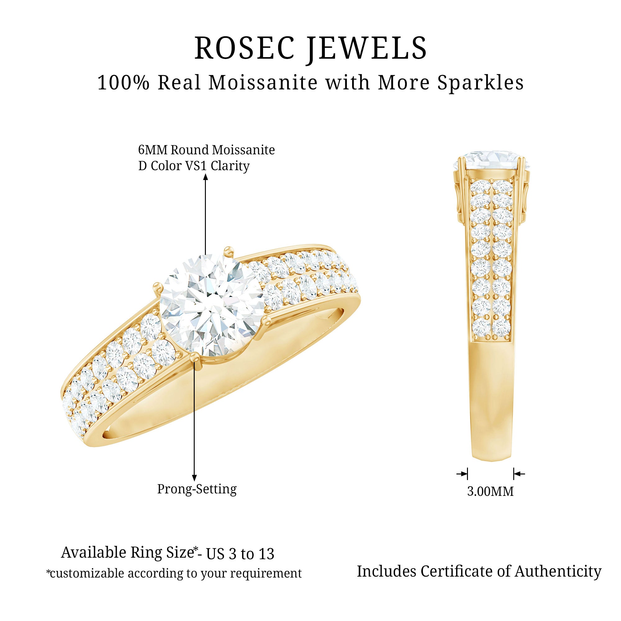 For a love that sparkles endlessly, this Side Stone Engagement Ring is a brilliant choice made to honor your forever. Timeless yet full of modern charm, this Moissanite Engagement Ring is designed to capture hearts with its radiant beauty and thoughtful details. At its center glows a 6 MM round cut moissanite, held in secure prong setting. Known for its fire and brilliance, the center stone is flanked by dazzling round side stones, adding even more shimmer and depth to the design. The stones gracefully cascade down the polished band, creating a balanced and elegant look from every angle. This 1 Carat Moissanite Ring is designed to celebrate your love with brilliance and intention. At Rosec Jewels, each ring is expertly handcrafted with precision and care, made to feel as beautiful as the moment it represents. Available in a range of sizes (US 3–13), it promises a comfortable, tailored fit. Delivered in a luxurious signature jewelry box, this Classic Ring is ready to mark the beginning of your forever. Give her a ring that reflects the light she brings into your life - a luminous symbol of love, crafted to last a lifetime.