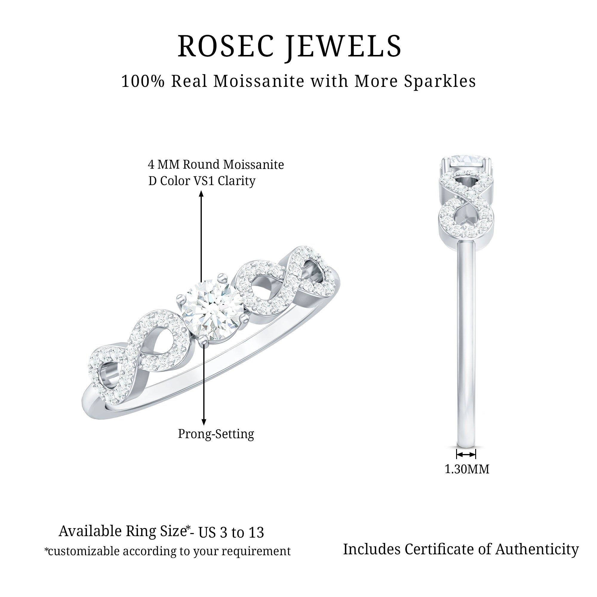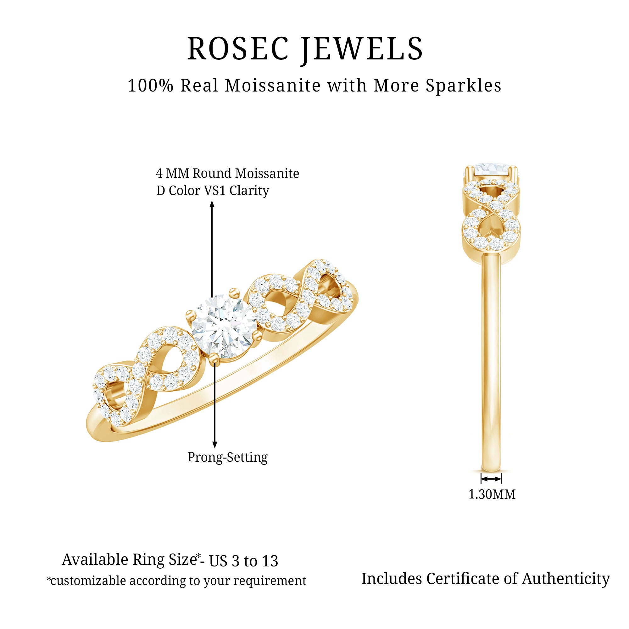 Show your love in a meaningful way with this beautiful Moissanite Promise Ring, designed to represent a bond that lasts forever. At the center is a sparkling 4 MM round cut moissanite, held securely in prong setting. Its bright shine catches the light beautifully and makes the Infinity Promise Ring truly eye-catching. On both sides of the center stone are graceful infinity symbols, representing endless love and connection. To add a touch of extra sparkle, the infinity motifs are decorated with small, round moissanite stones. These dainty accents make the Moissanite Infinity Ring shine without being too flashy, giving it a soft and elegant look. The mix of the classic round cut stone and the modern infinity design makes this Commitment Ring special and timeless. Crafted with D-VS1 quality moissanite, it offers the brilliance of a diamond while being more affordable and ethically sourced. It is a smart and thoughtful choice for anyone looking to celebrate love without going over budget. Lovingly handcrafted by Rosec Jewels, this Moissanite Ring for Women is made with care and attention to detail.