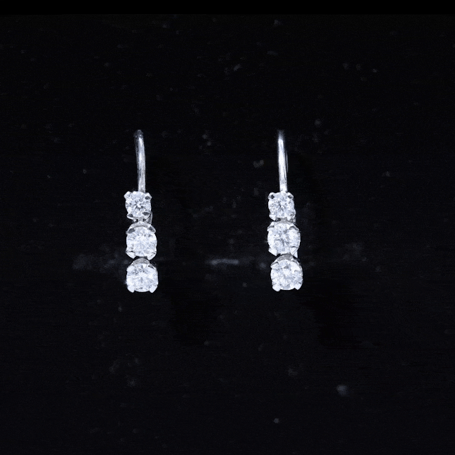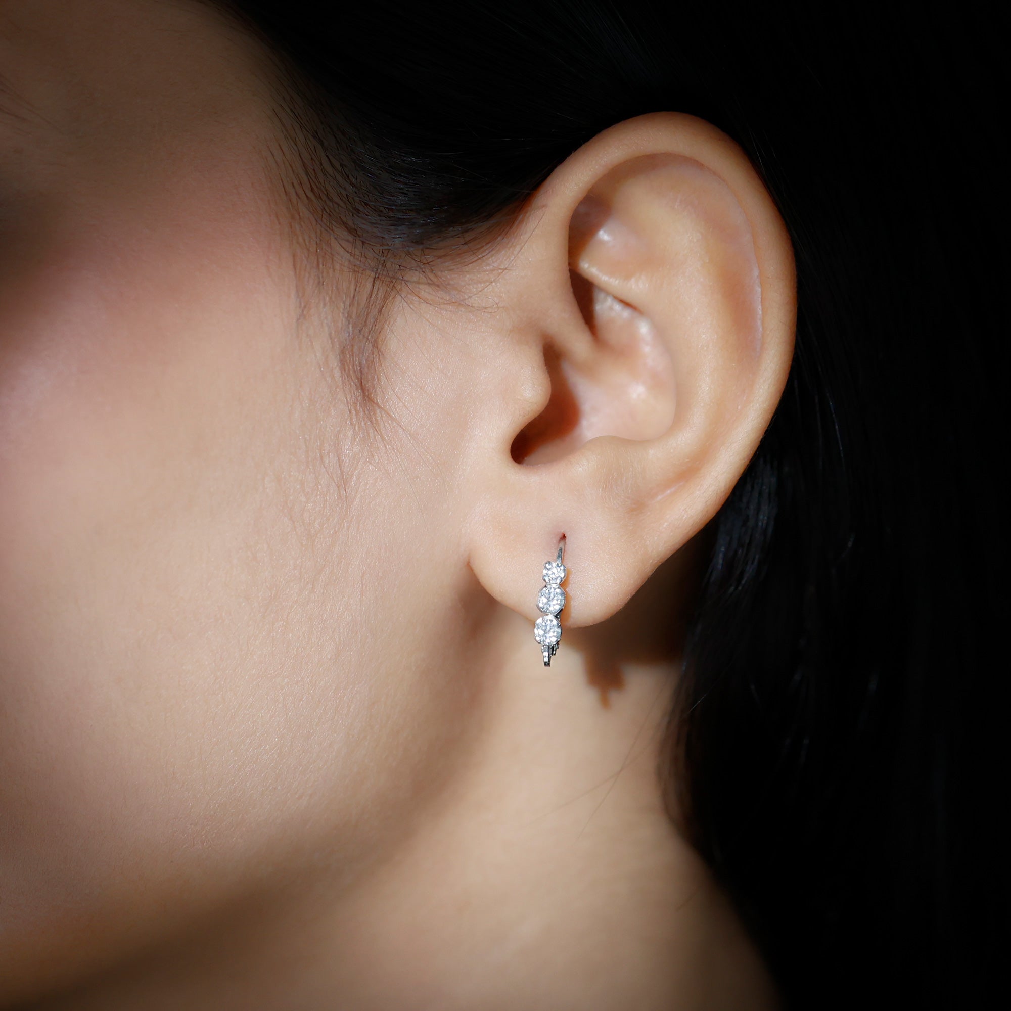Round moissanite are set in a linear pattern in these three stone hoop earrings that display an endless shine and shimmer. The moissanite is prong set for an extra dose of sparkle. The minimal hoops are linked to lever back findings for an added style and grace and make a comfortable option as an everyday accessory.