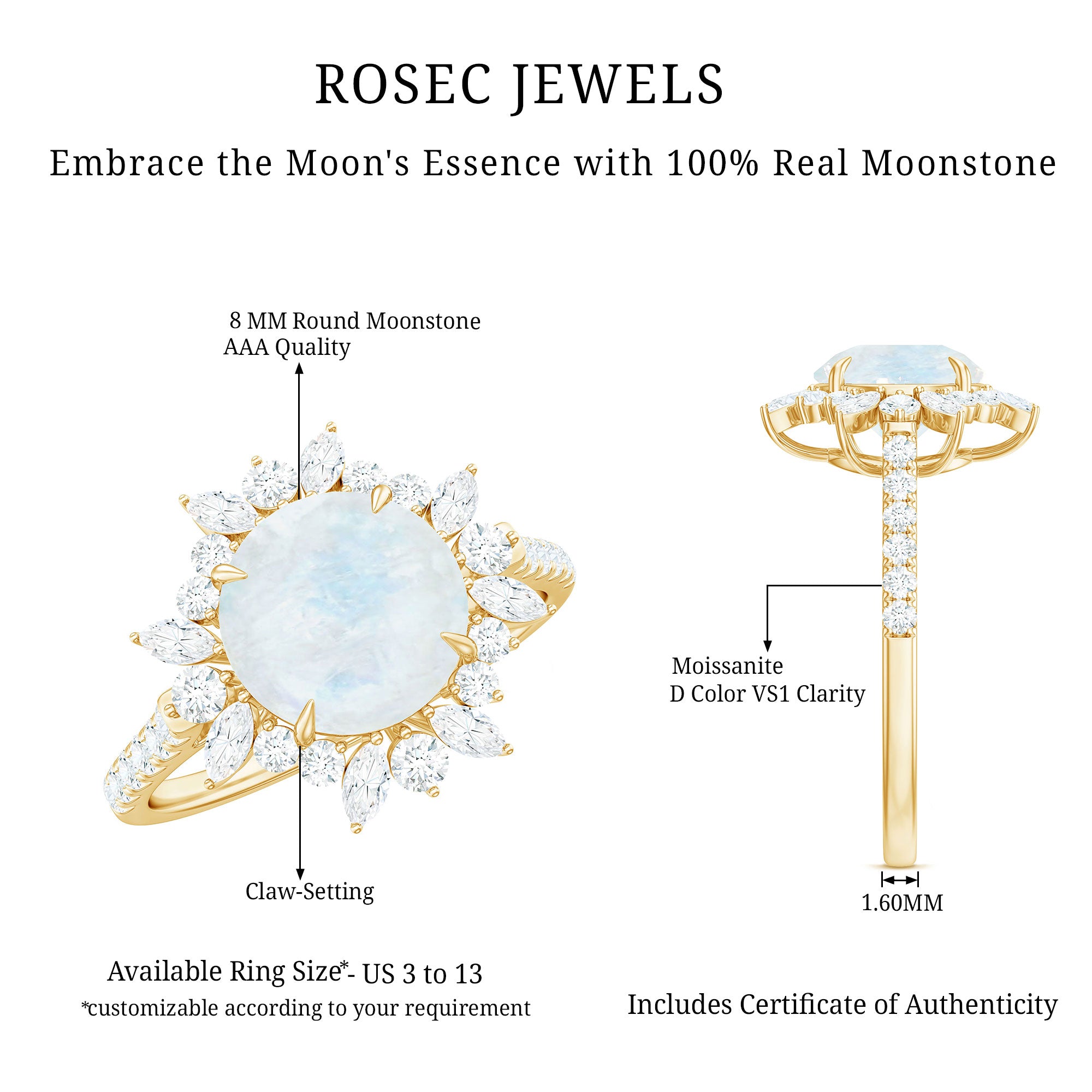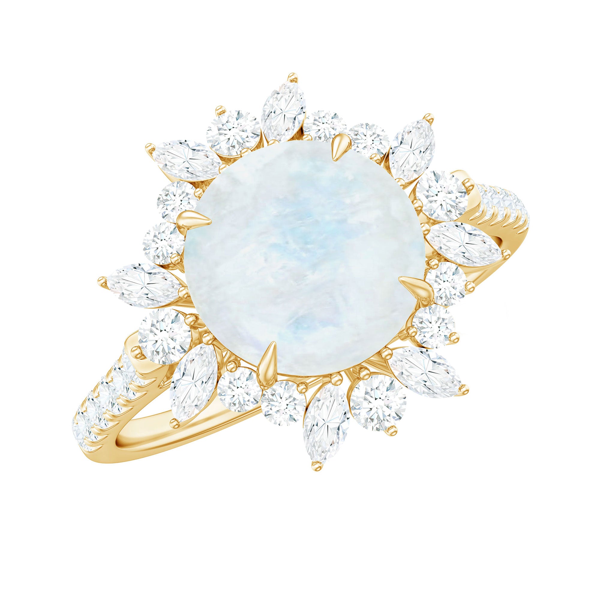 Make a bold fashion statement with this stunning Moonstone Cocktail Ring, adorned with a shimmering Round Shape Moonstone, as well as Marquise and Round Shape Moissanite stones in an Accent Setting. The intricate Floral design of this Engagement Ring exudes elegance and sophistication, and it is expertly crafted from Solid Gold. This one-of-a-kind piece is the perfect addition to any jewelry collection and is sure to complement any style.