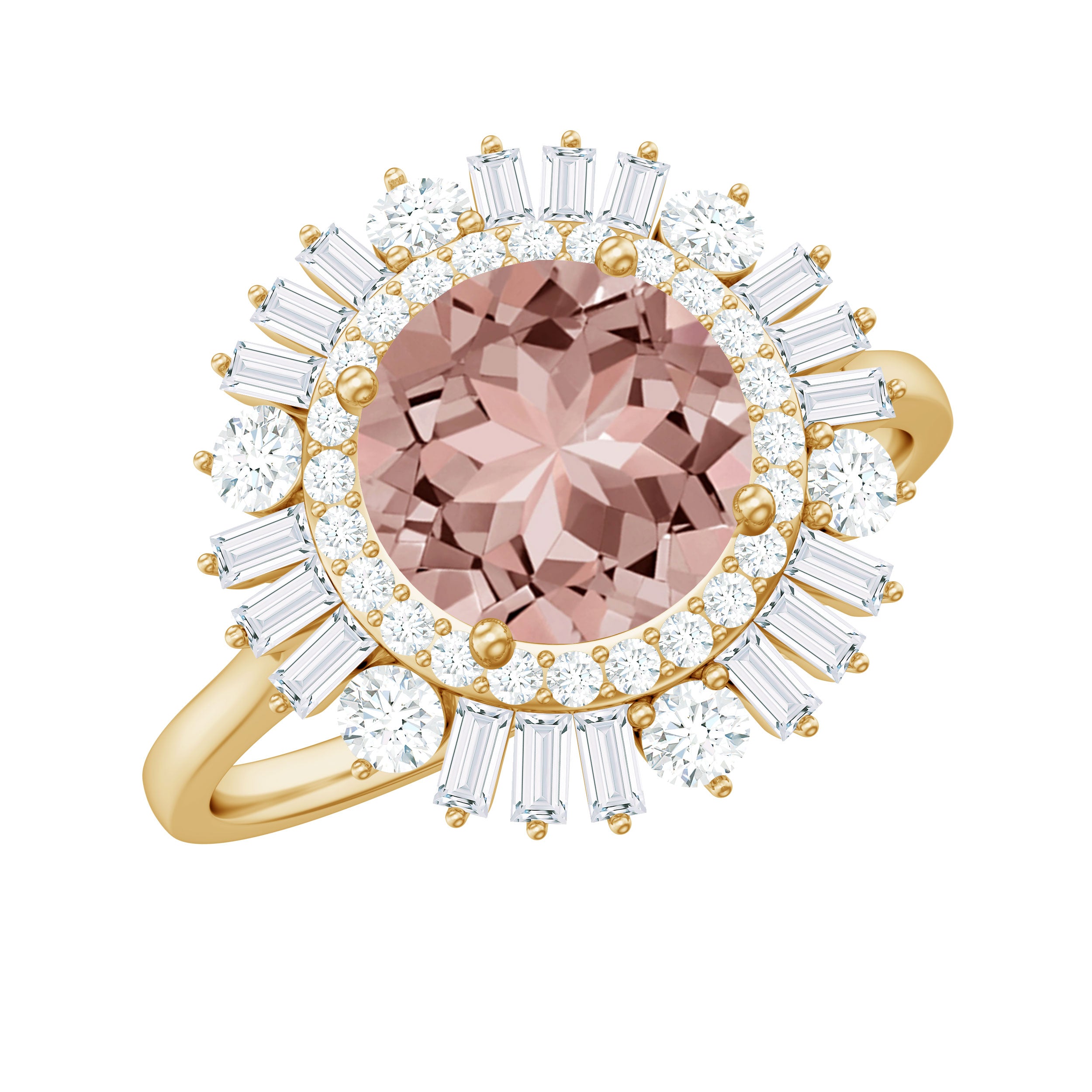 Present this dazzling Cocktail Ring to your lady love. Embellished with elegant Round Shape Morganite secured by 4 Prong Setting while Baguette and Round Shape Moissanite studded as Double Halo. The Morganite Ring will shine forever and her jewelry collection wont be complete without including this Statement Ring. Let your partner fall in love with you a little more by gifting her this mesmerizing Halo Ring.
