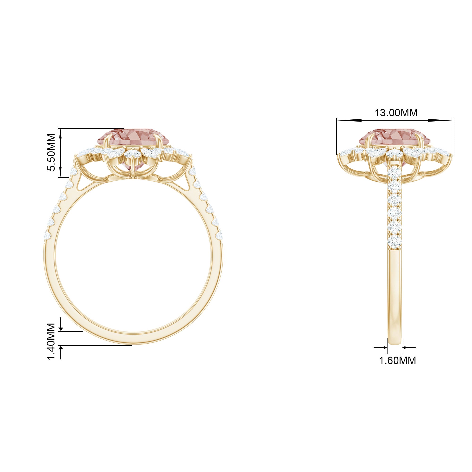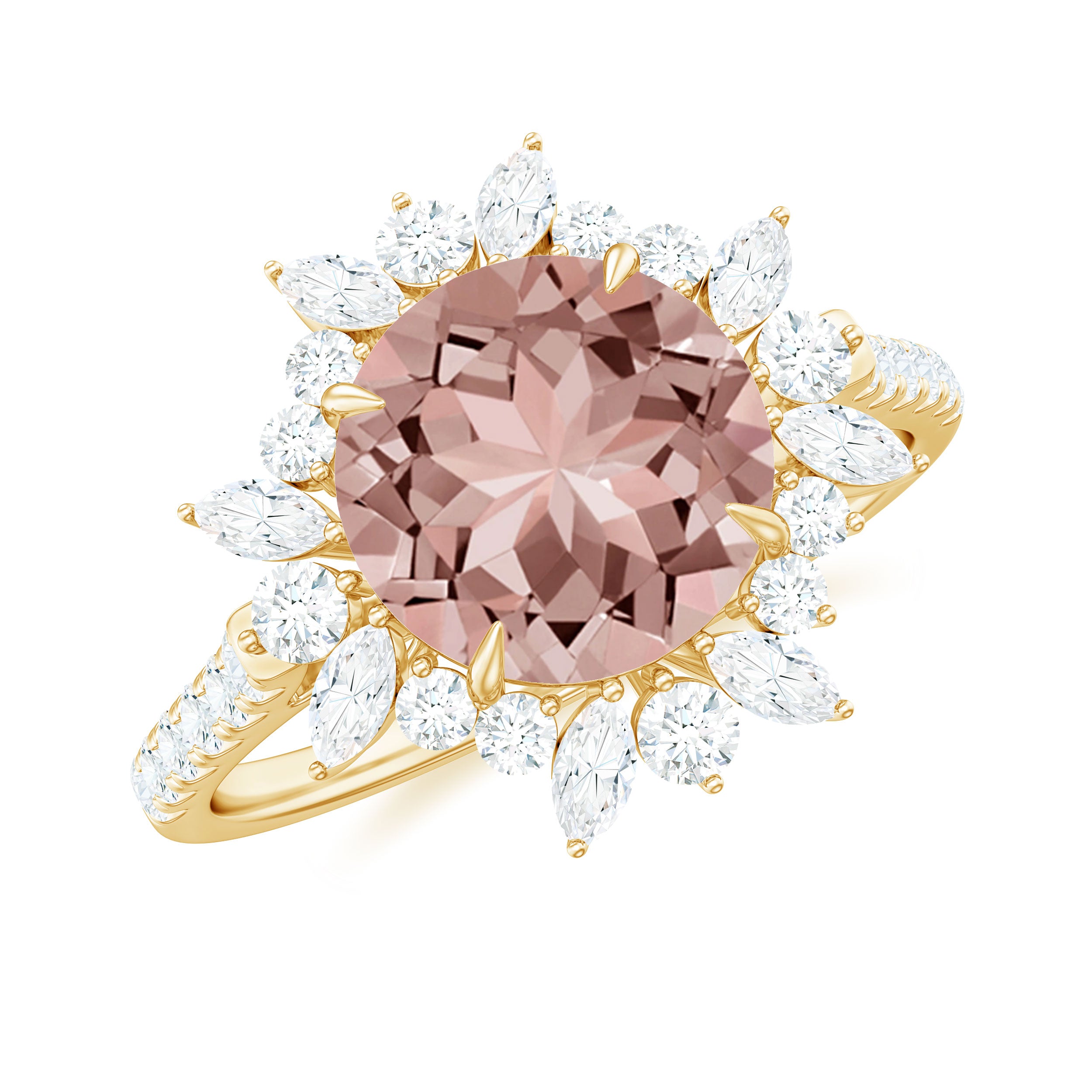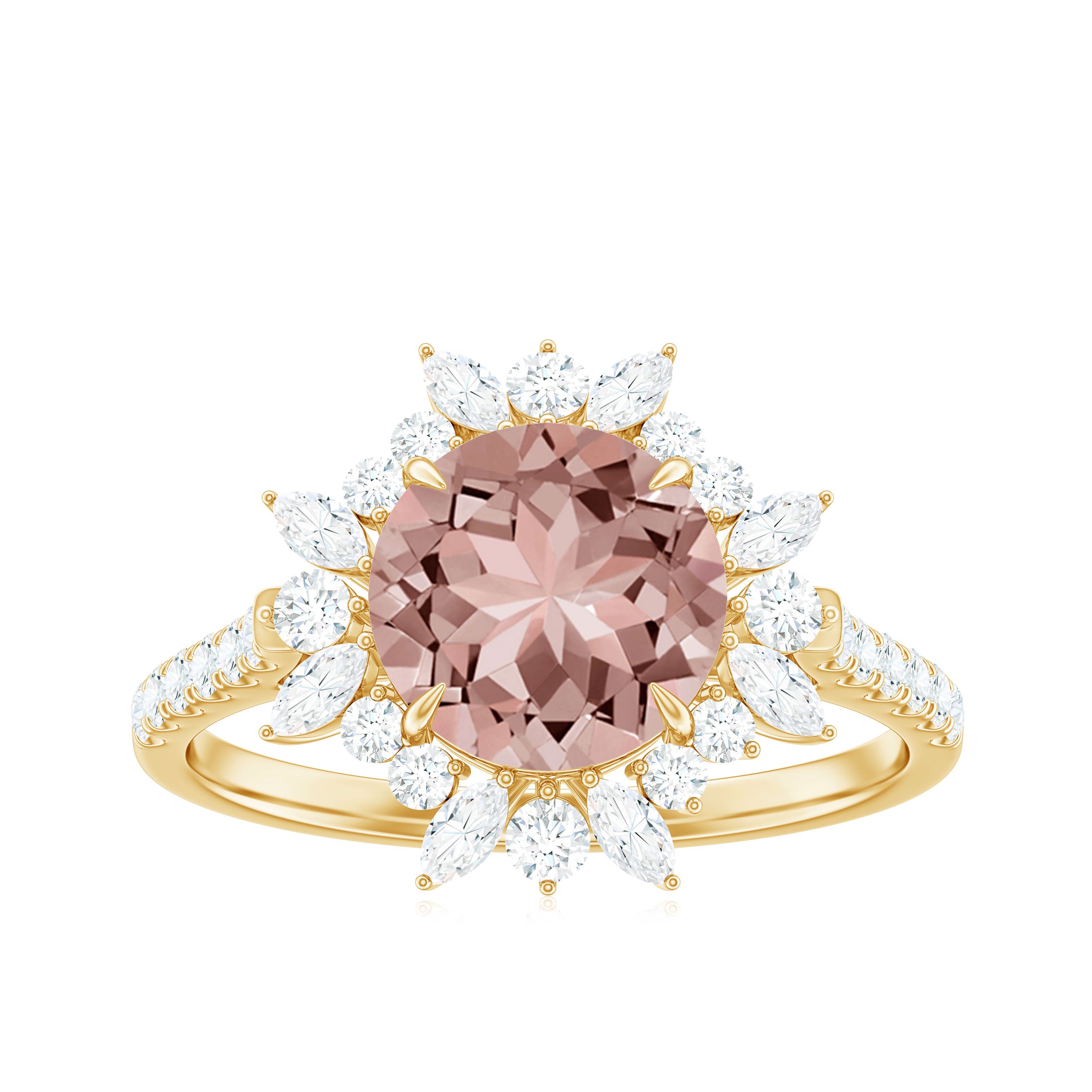 Make a bold fashion statement with this stunning Morganite Statement Engagement Ring, adorned with a shimmering Round Shape Morganite, as well as Marquise and Round Shape Moissanite stones in an Accent Setting. The intricate Floral design of this Engagement Ring exudes elegance and sophistication, and it is expertly crafted from Gold. This one-of-a-kind piece is the perfect addition to any jewelry collection and is sure to complement any style.