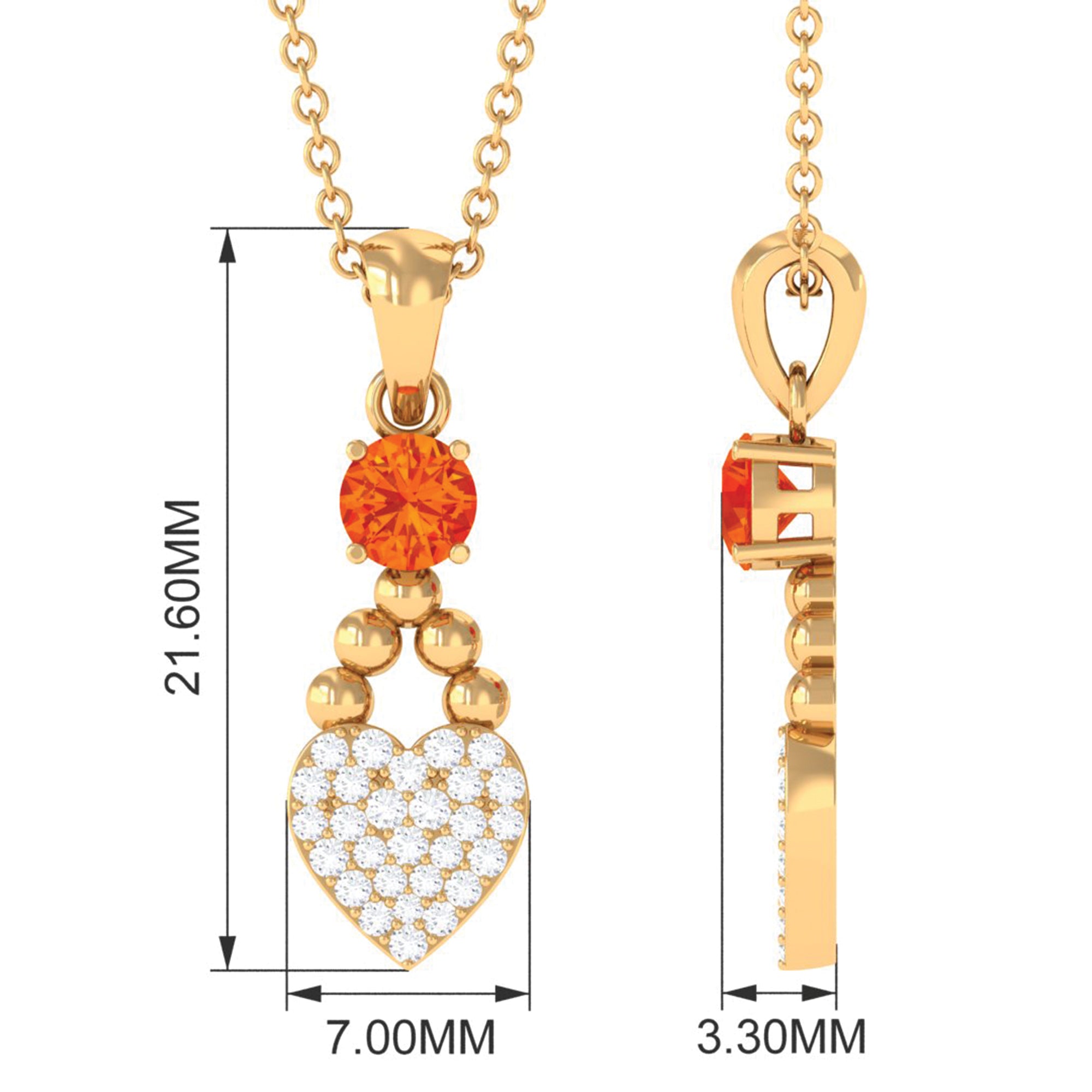 Elevate your style with this enchanting heart pendant that embodies love and elegance. It showcases a captivating round-shaped Orange Sapphire as its centerpiece and a dangling heart-shaped frame adorned with round-cut diamond stones. The intricate design adds a touch of glamour and allure to any ensemble, making it an ideal gift for a beloved or a stunning addition to your jewelry collection.