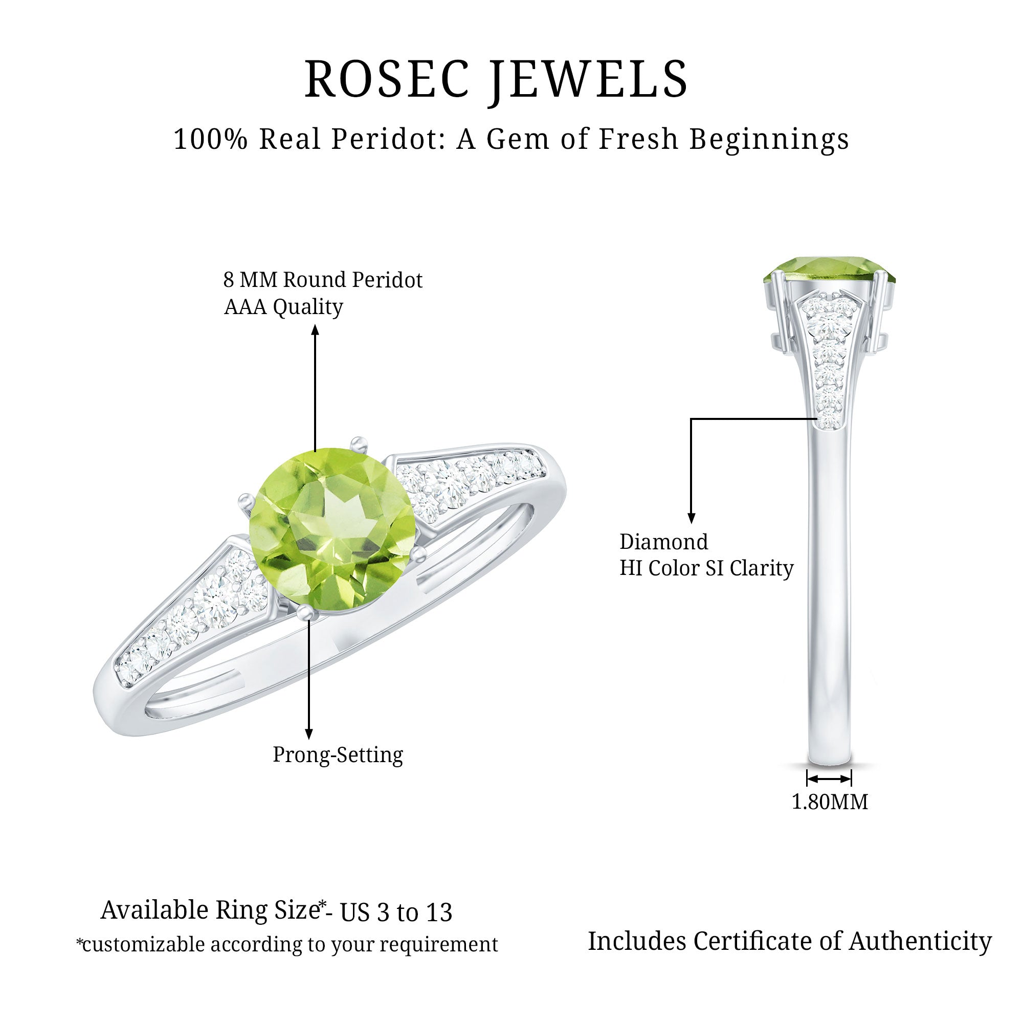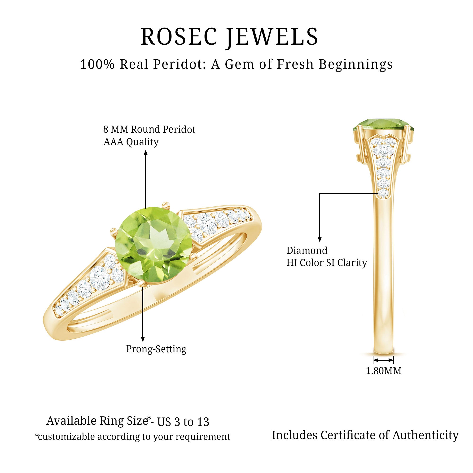 Add a flair of charm to your look with this elegant solitaire ring that features a Round Shape peridot gemstone at its center, with sparkling Diamond side stones on either side. The light green hue of the peridot is beautifully complemented by the shimmering Diamond stones, creating a delicate and sophisticated look. Perfect for any occasion, from a proposal to a special anniversary, this ring is sure to be treasured for its beauty and meaning. A symbol of love and commitment, this ring is the perfect choice for the one you love.