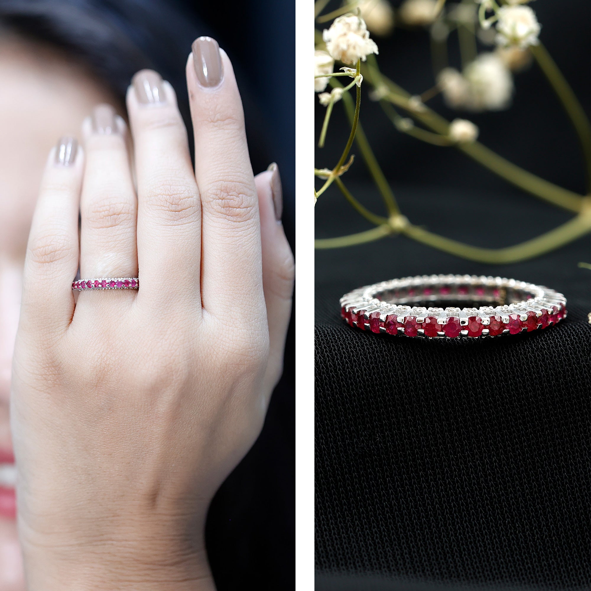 Enhance your beauty with this utterly Classic Ruby and Diamond Eternity Wedding Band. It is embellished with round shape Ruby and a sparkling Round Diamond in Accent Setting studded beautifully on the entire Eternity Band Ring.